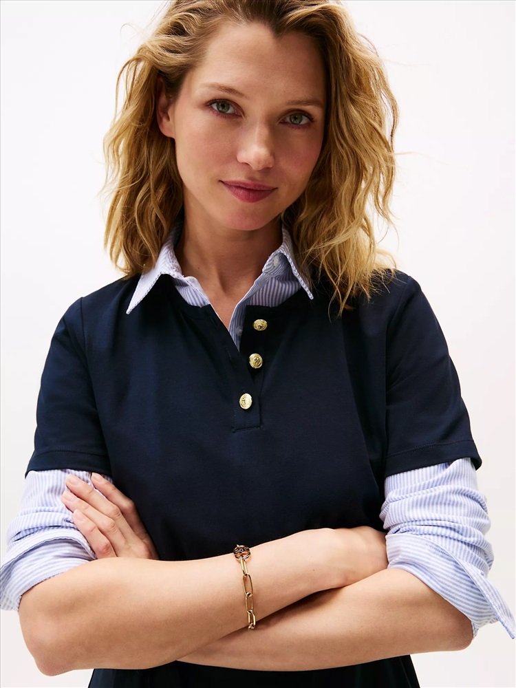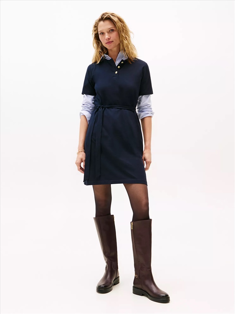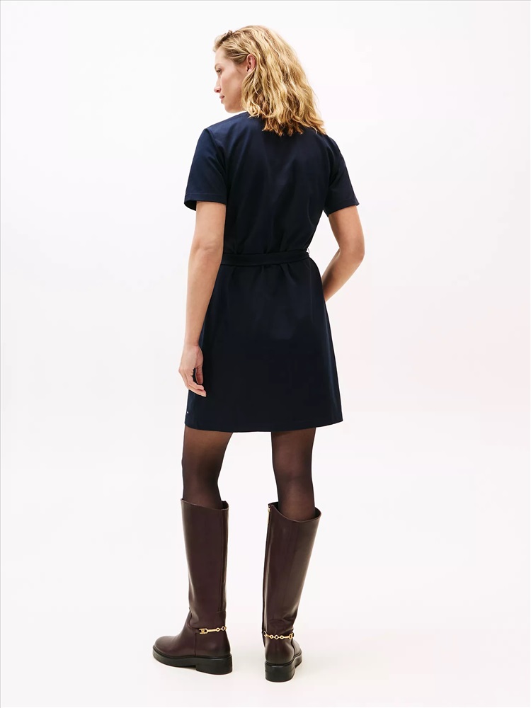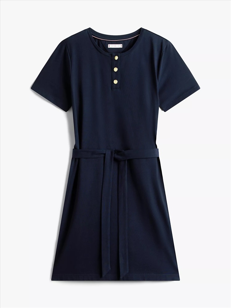 Tommy Hilfiger women's dress. Made from soft, stretch cotton, our short-sleeve dress is the ideal choice for warmer days of the season. Even better, this classic design has an elevated feel, thanks to the gold-tone button detailing and a figure-flattering self-belt.