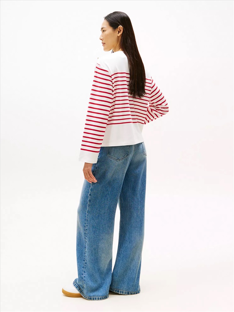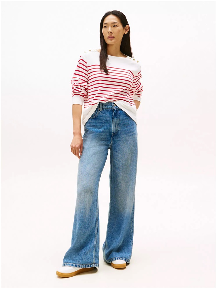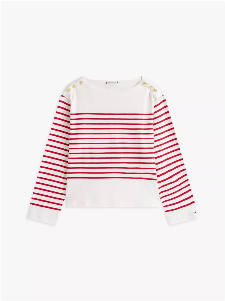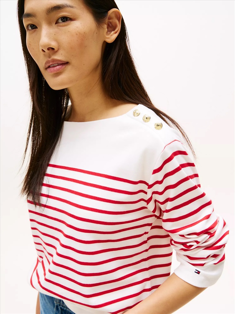 Tommy Hilfiger women's T-shirt. Designed with nautical stripes and gold button details, our smooth, stretchy ponte tee offers a polished silhouette.
