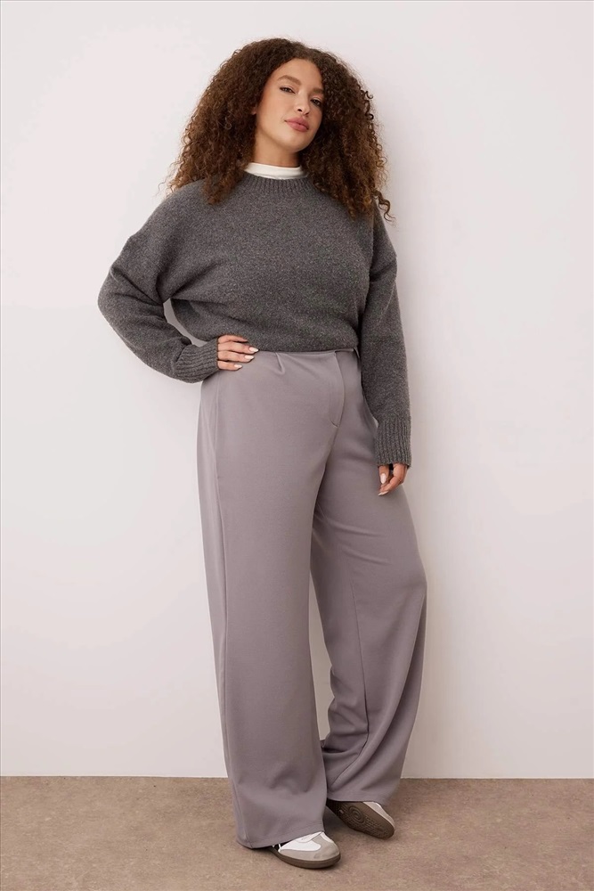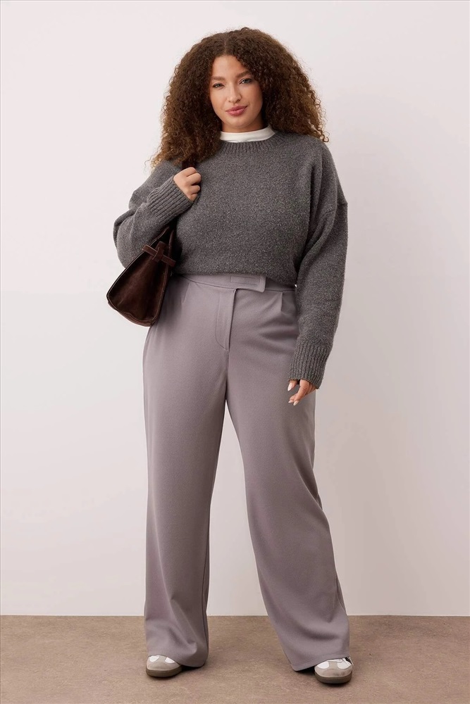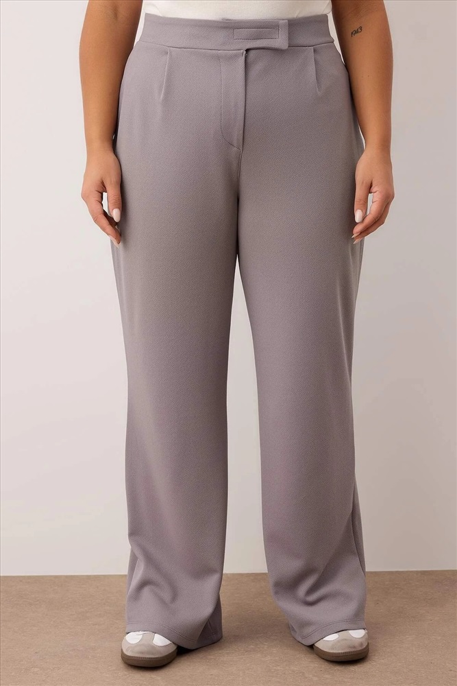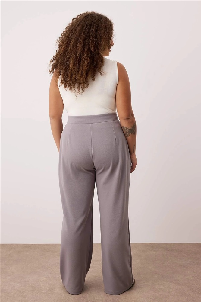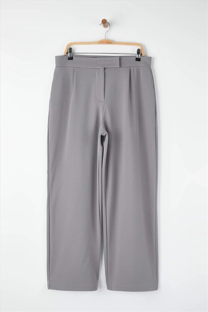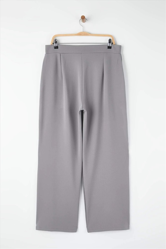 Gri Kemeri Cırtlı Pileli Wide Leg Örme Büyük Beden Pantolon TBBSS24AR00035
