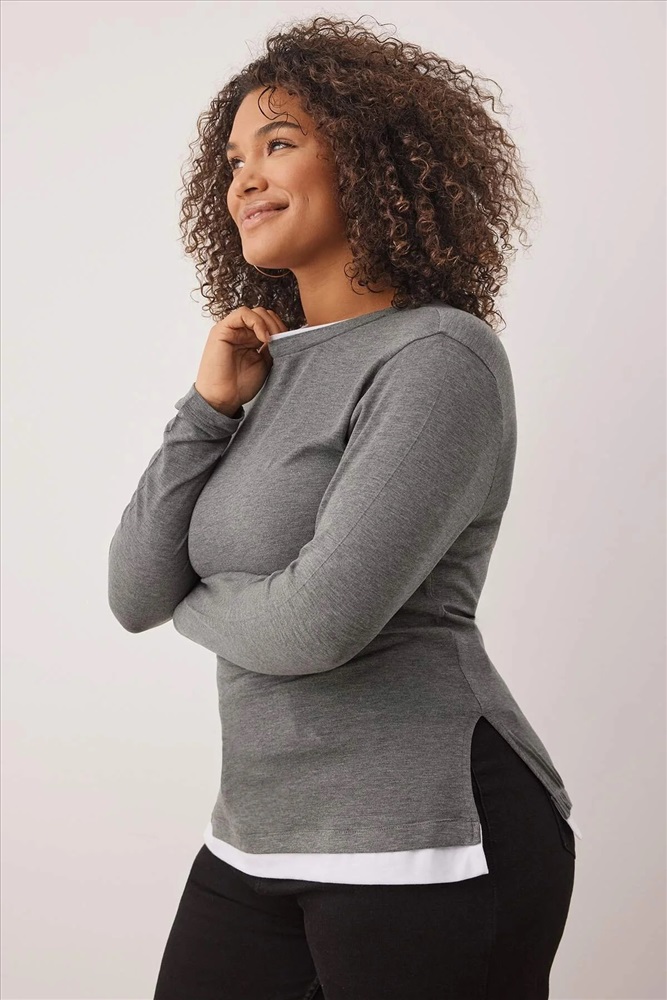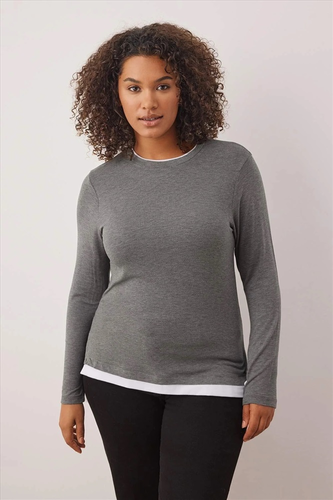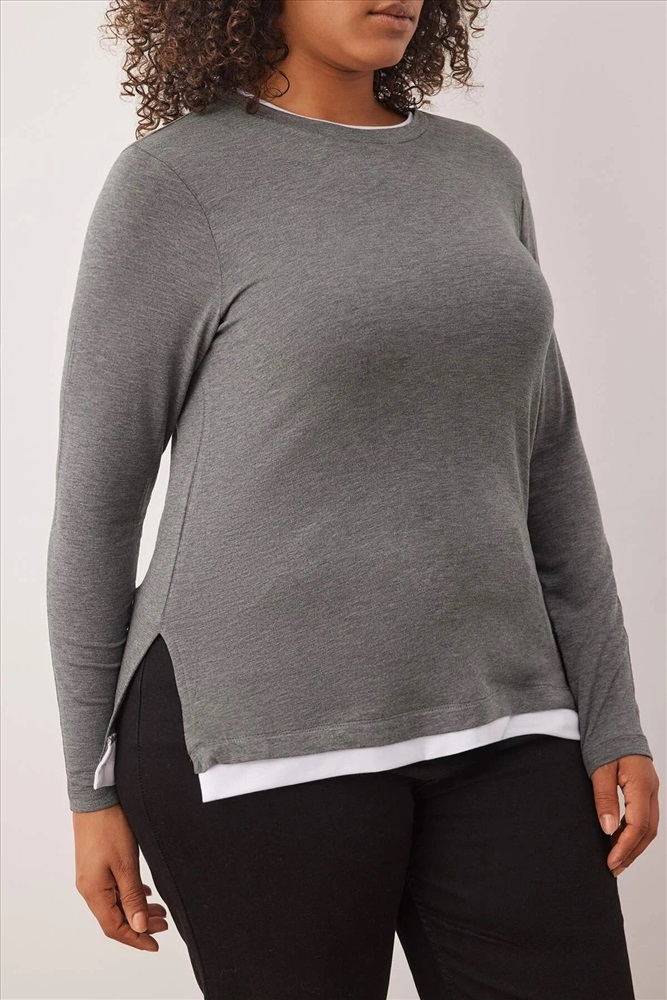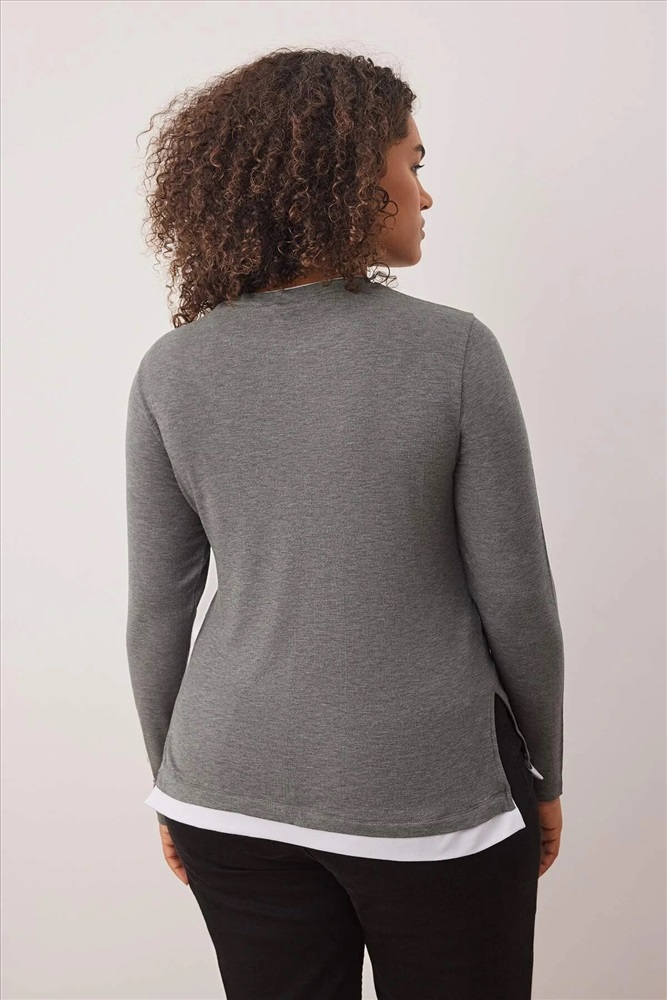Gri Melanj Yaka ve Etek Ucu Detaylı Süprem Esnek Örme Büyük Beden Bluz TBBAW26AF00065