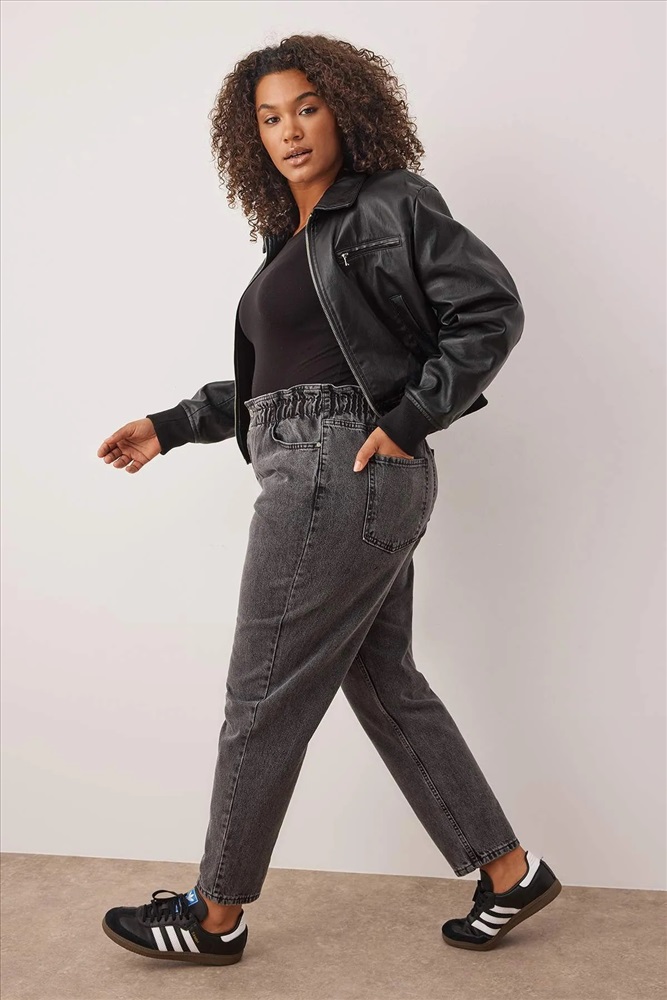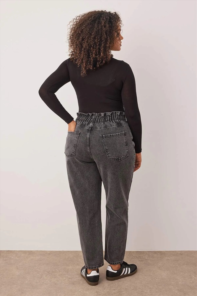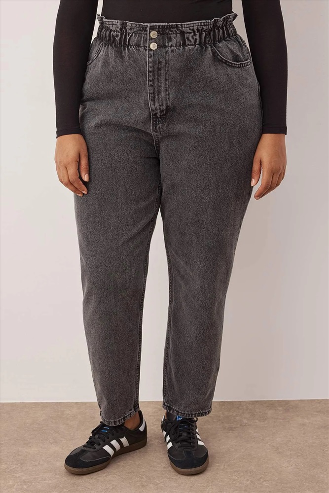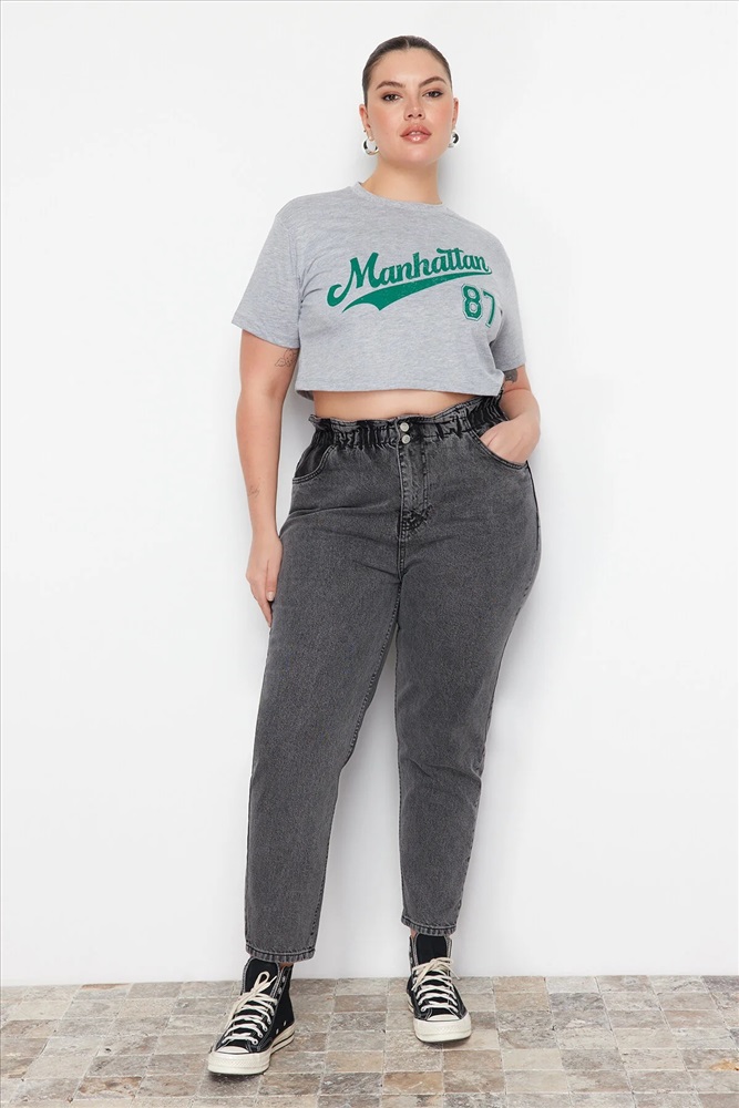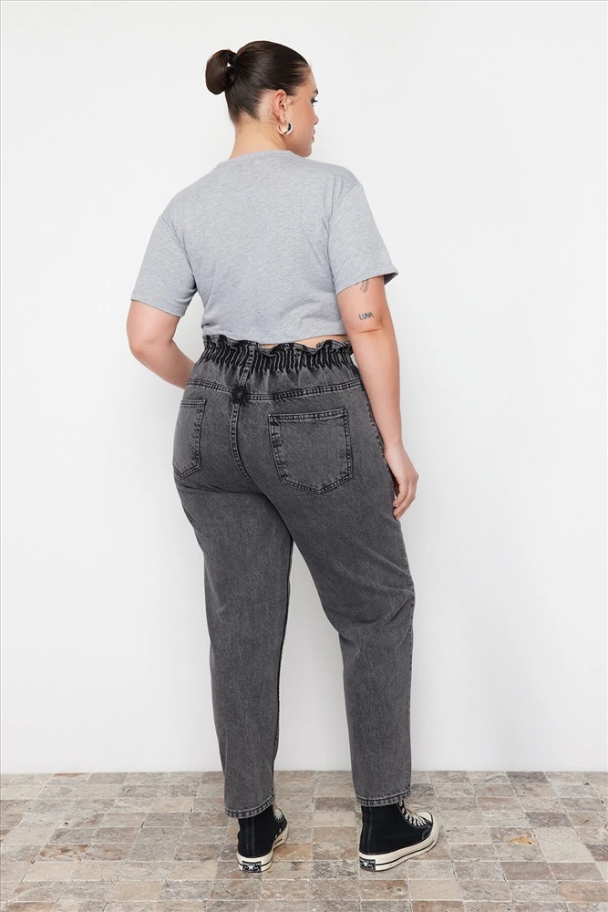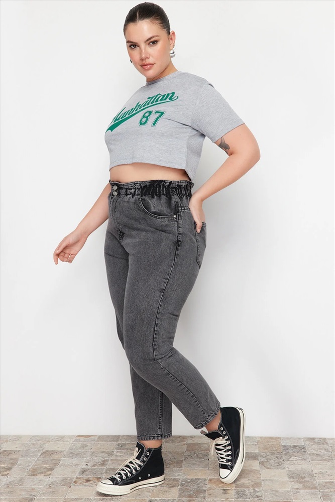 Gri Yüksek Bel Beli Lastikli Büyük Beden Mom Jeans TBBAW23JE00002