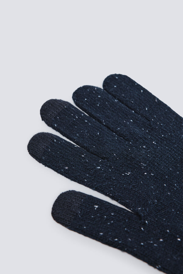 Guantes de punto tejido bicolor. Incluyen en la zona de los dedos un material conductivo que permite usar los smartphones o las tablets. Bufanda y gorro a conjunto.