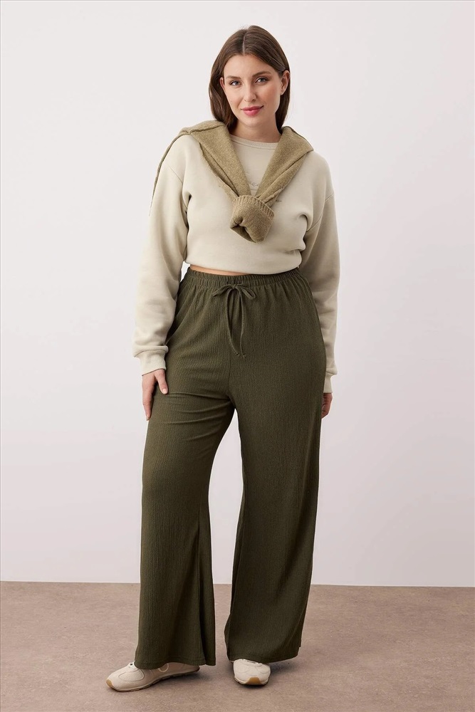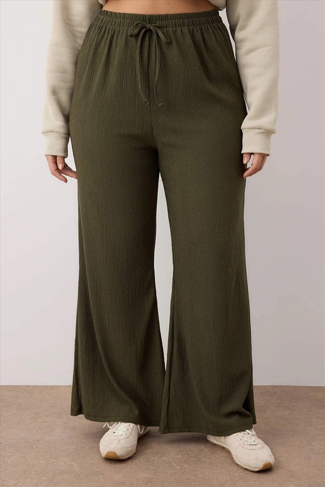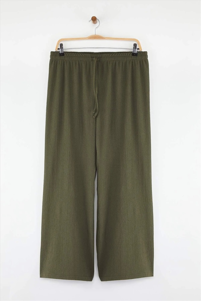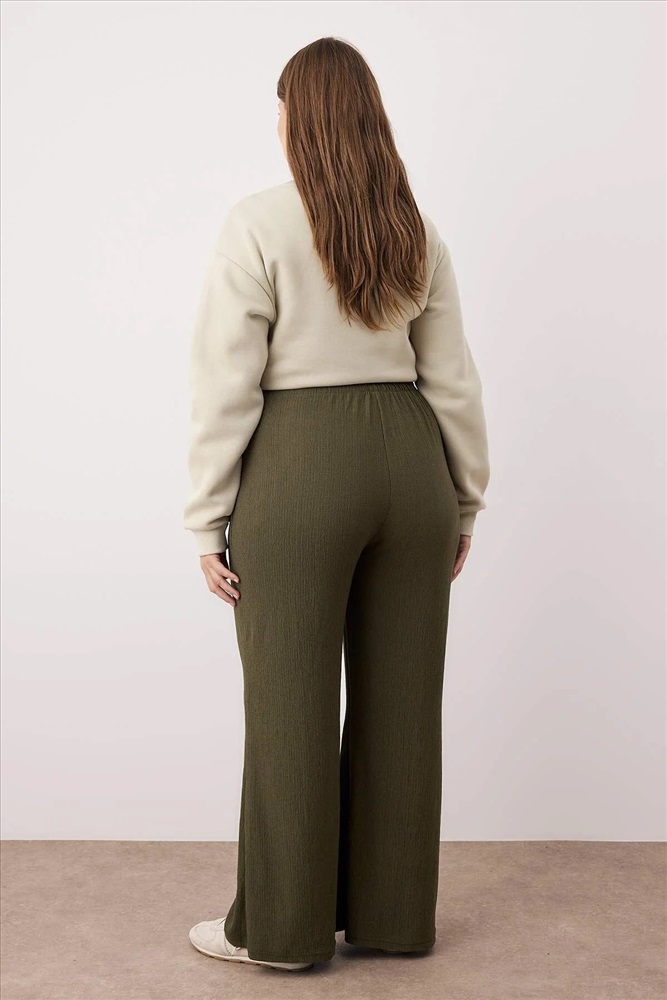 Haki Yüksek Bel Geniş Paça Bürümcük Örme Büyük Beden Pantolon TBBAW26AR00011
