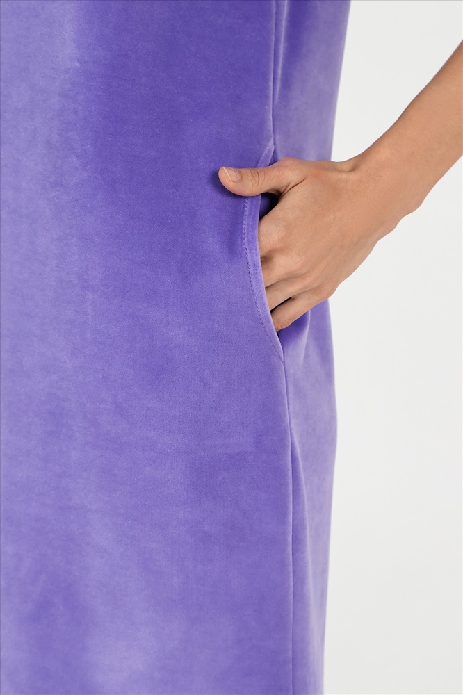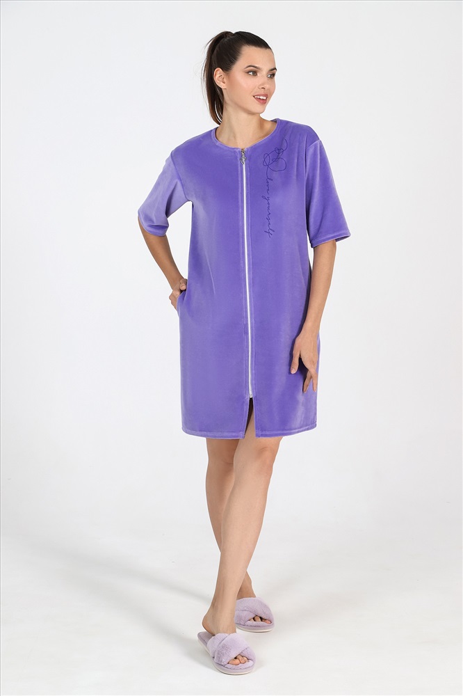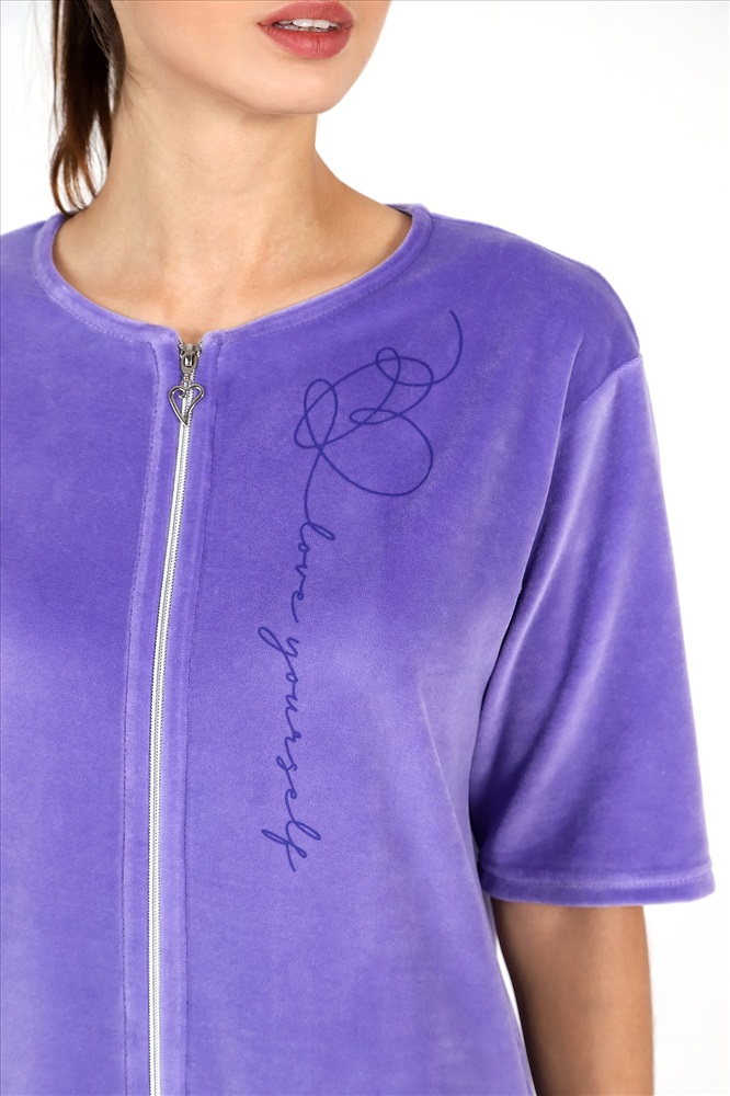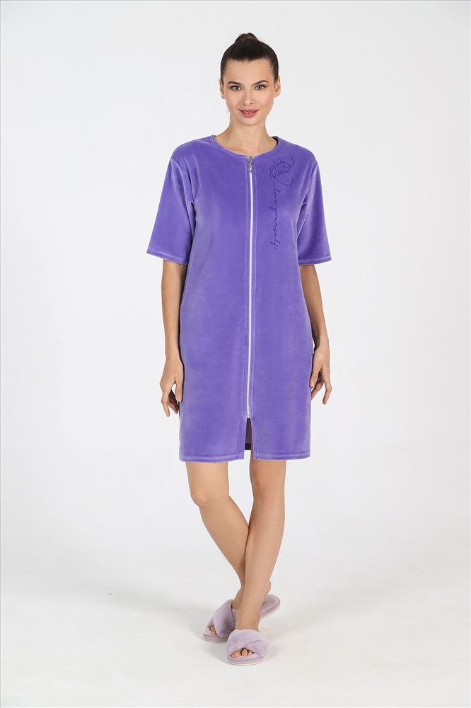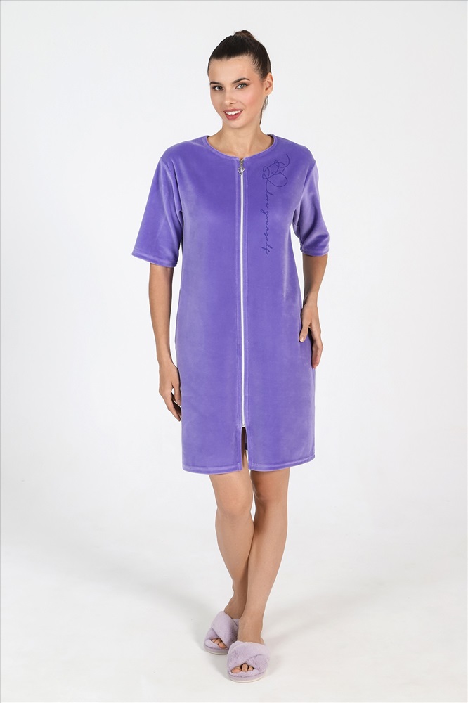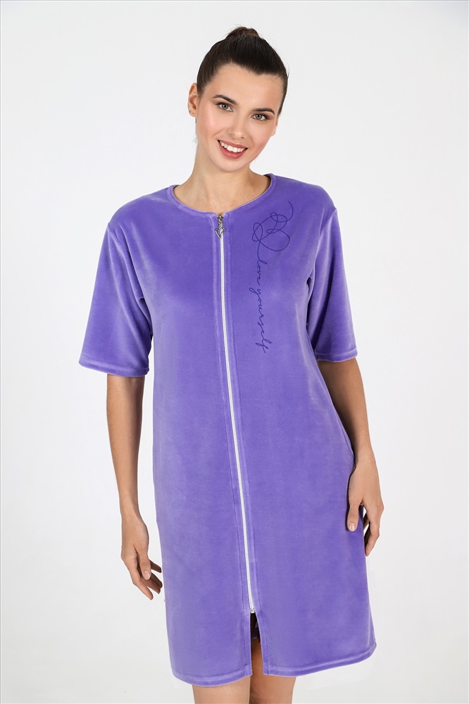 Халат из гладкокрашеного полотна «велюр», прямого силуэта, с втачными рукавами длиной ¾, горловиной овальной формы, карманами в боковых швах и центральной бортовой застежкой на тесьму «молния». На полочке выполнена печать в технике «шелкографии».