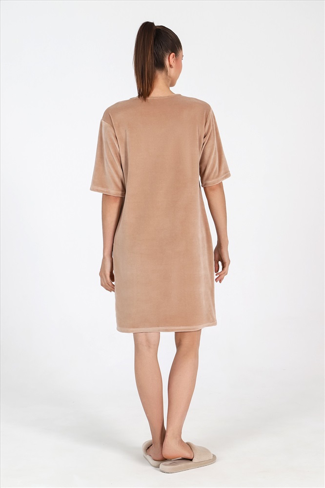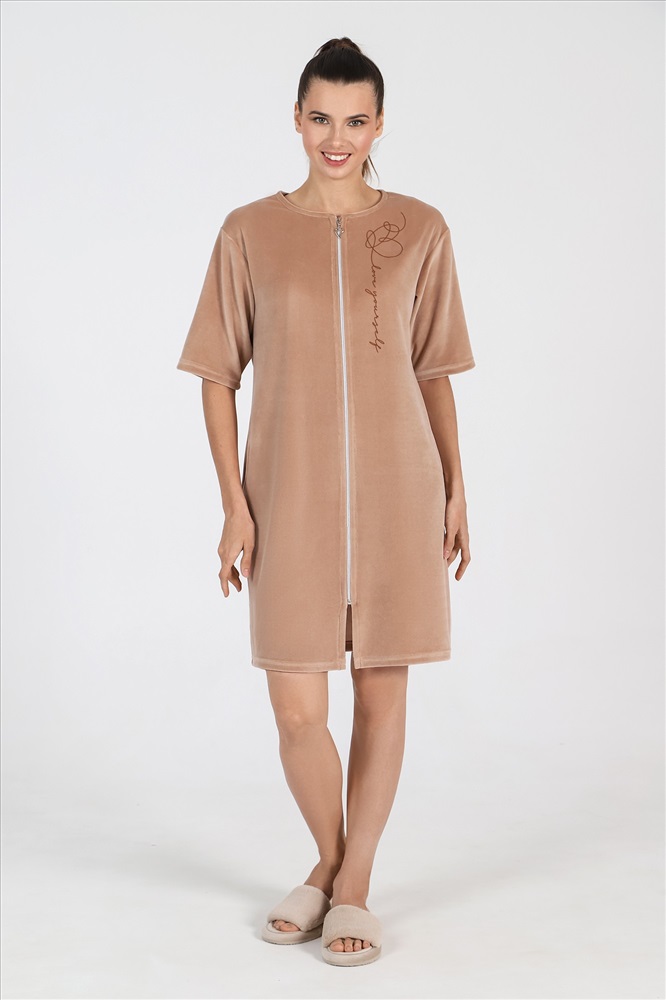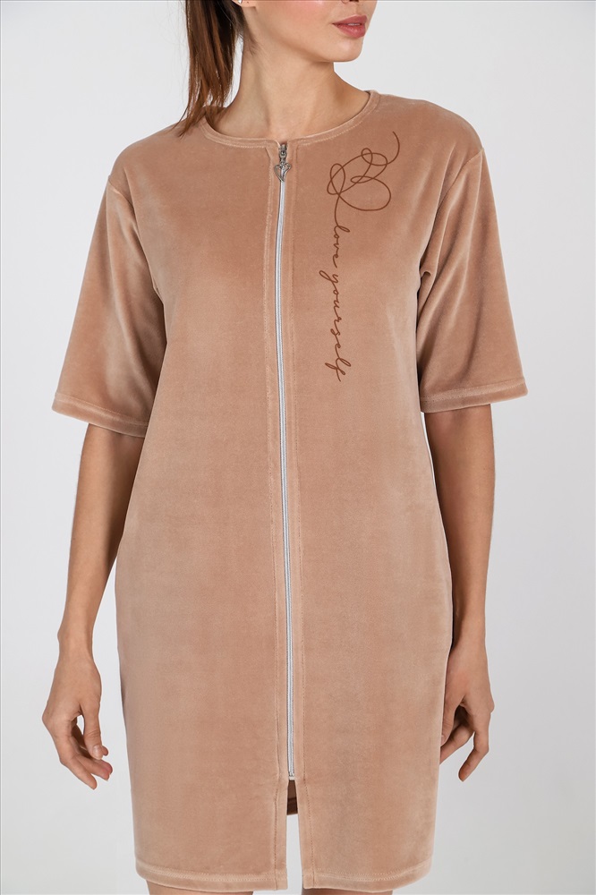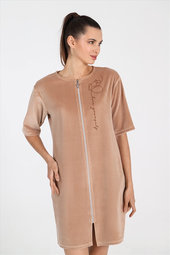 Халат из гладкокрашеного полотна «велюр», прямого силуэта, с втачными рукавами длиной ¾, горловиной овальной формы, карманами в боковых швах и центральной бортовой застежкой на тесьму «молния». На полочке выполнена печать в технике «шелкографии».