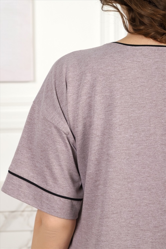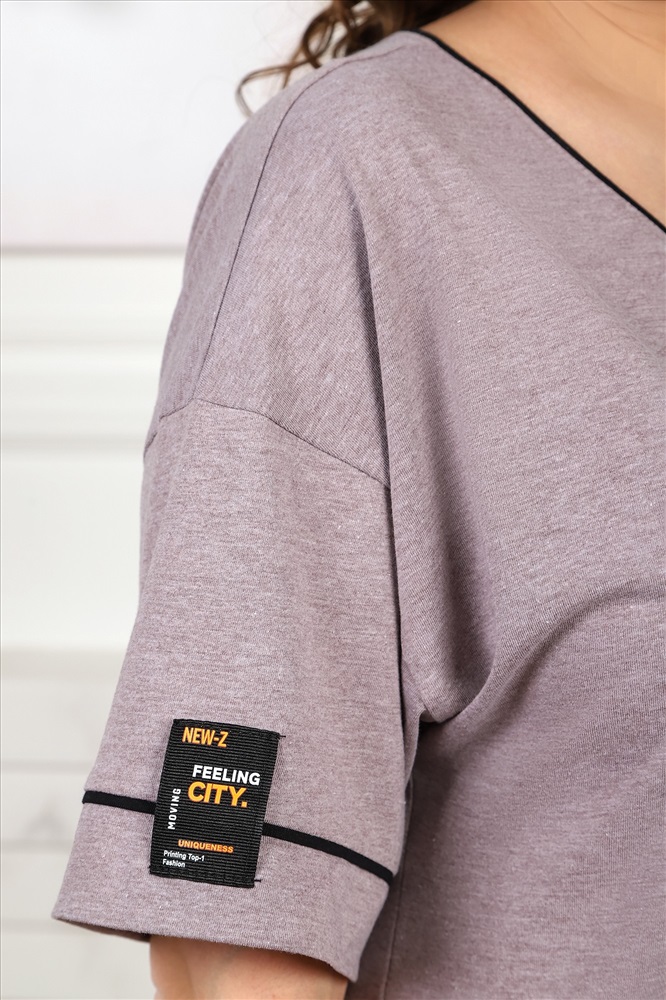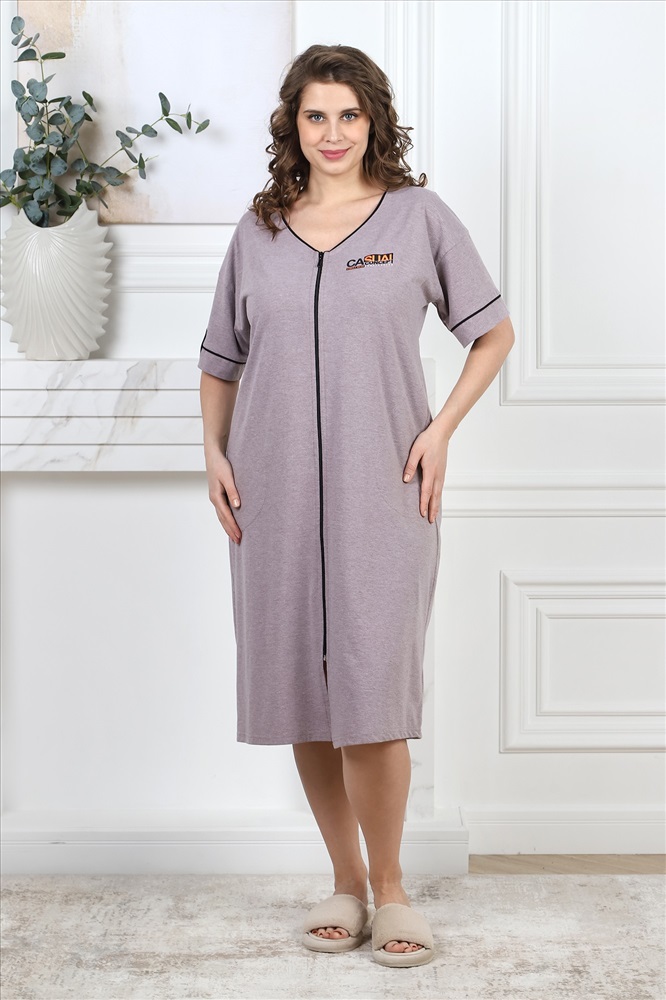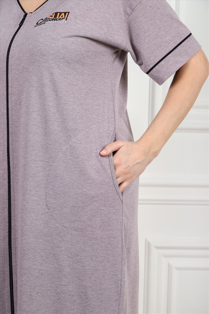 Ткань: Кулирка (меланж) Халат женский из гладкокрашеного трикотажного полотна «кулирка меланж», прямого силуэта, со спущенным плечом, короткими втачными рукавами, горловиной V-образной формы, карманами в боковых швах, центральной бортовой застежкой на тесьму «молния» и принтом на полочке, выполненным методом «шелкографии». Нижние срезы рукавов с притачными манжетами и кантом, на рукаве декоративная нашивка. Горловина обработана узким притачным кантом контрастного цвета.
