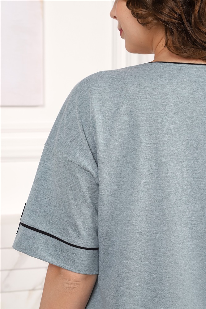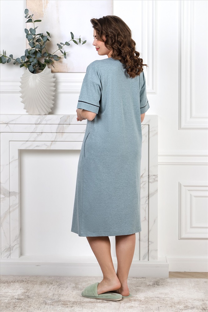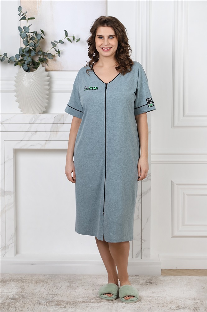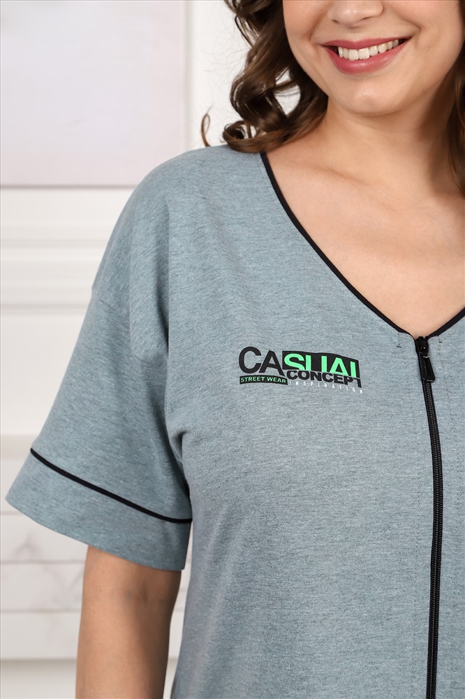 Халат женский из гладкокрашеного трикотажного полотна «кулирка меланж», прямого силуэта, со спущенным плечом, короткими втачными рукавами, горловиной V-образной формы, карманами в боковых швах, центральной бортовой застежкой на тесьму «молния» и принтом на полочке, выполненным методом «шелкографии». Нижние срезы рукавов с притачными манжетами и кантом, на рукаве декоративная нашивка. Горловина обработана узким притачным кантом контрастного цвета.