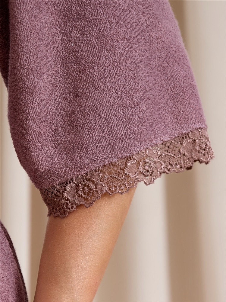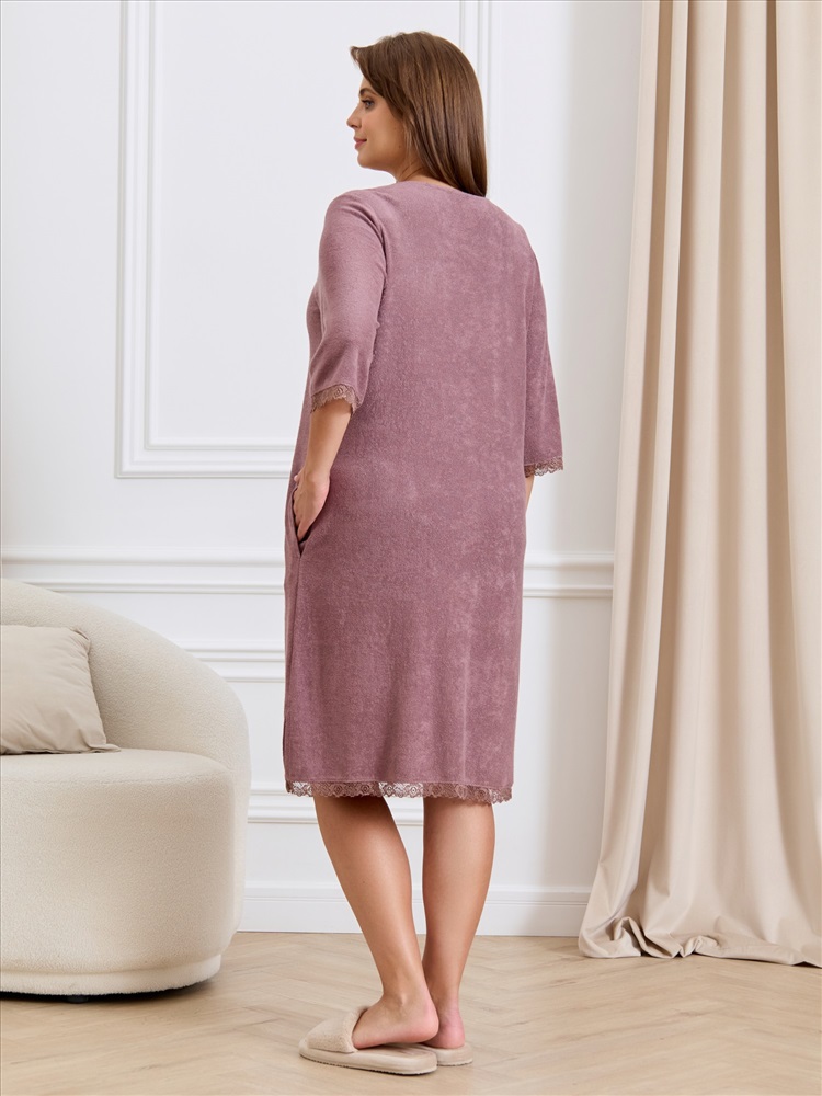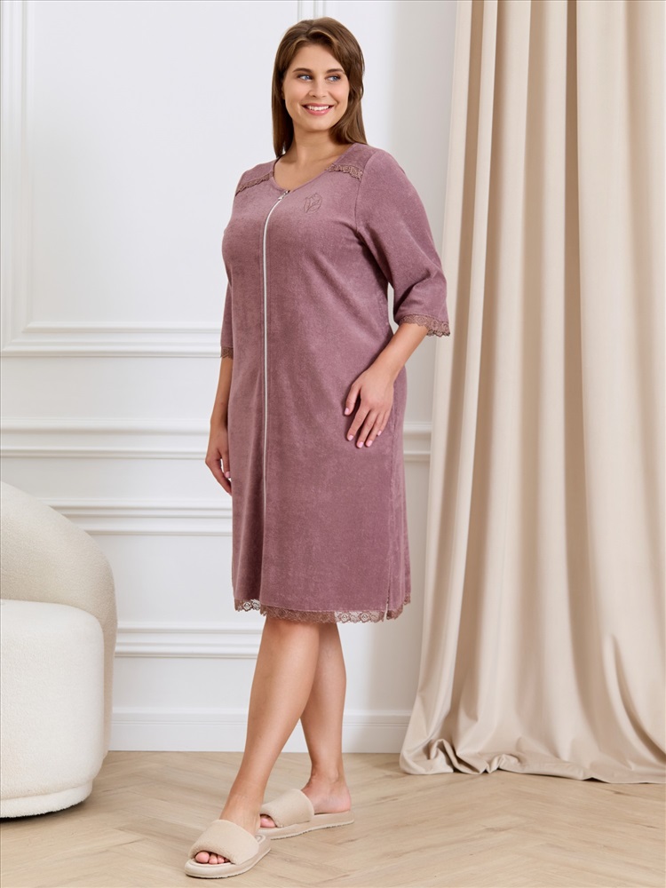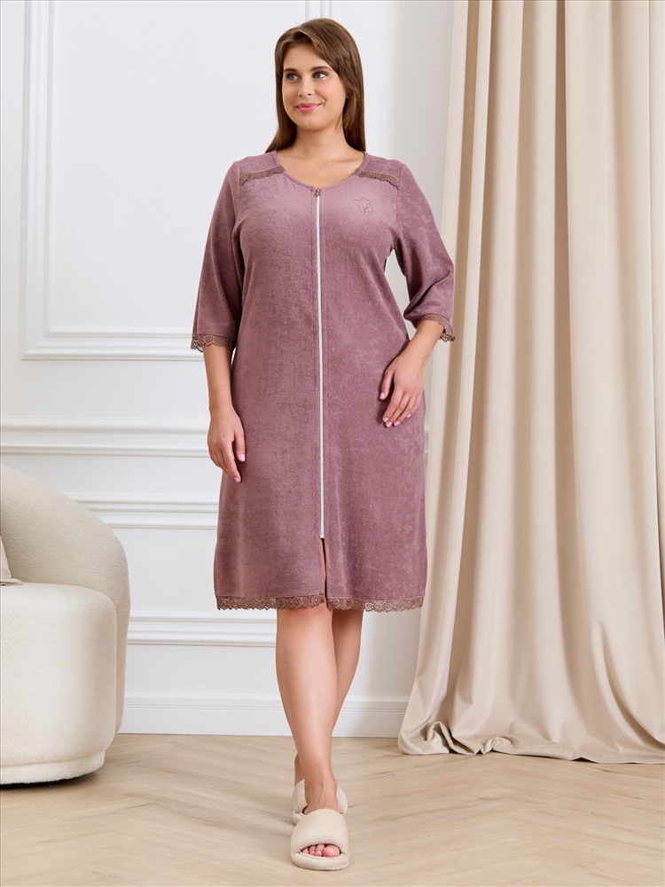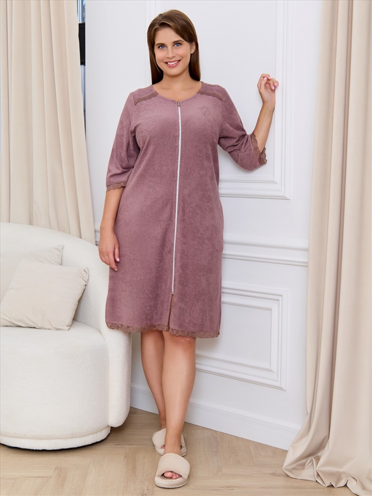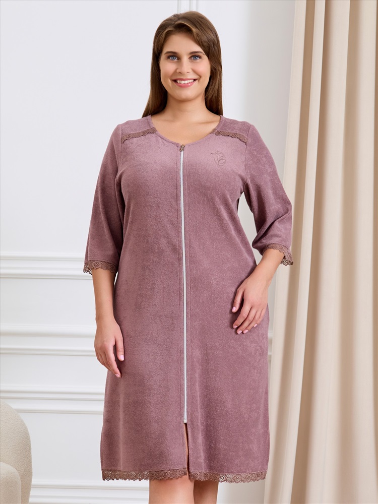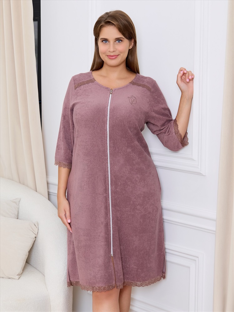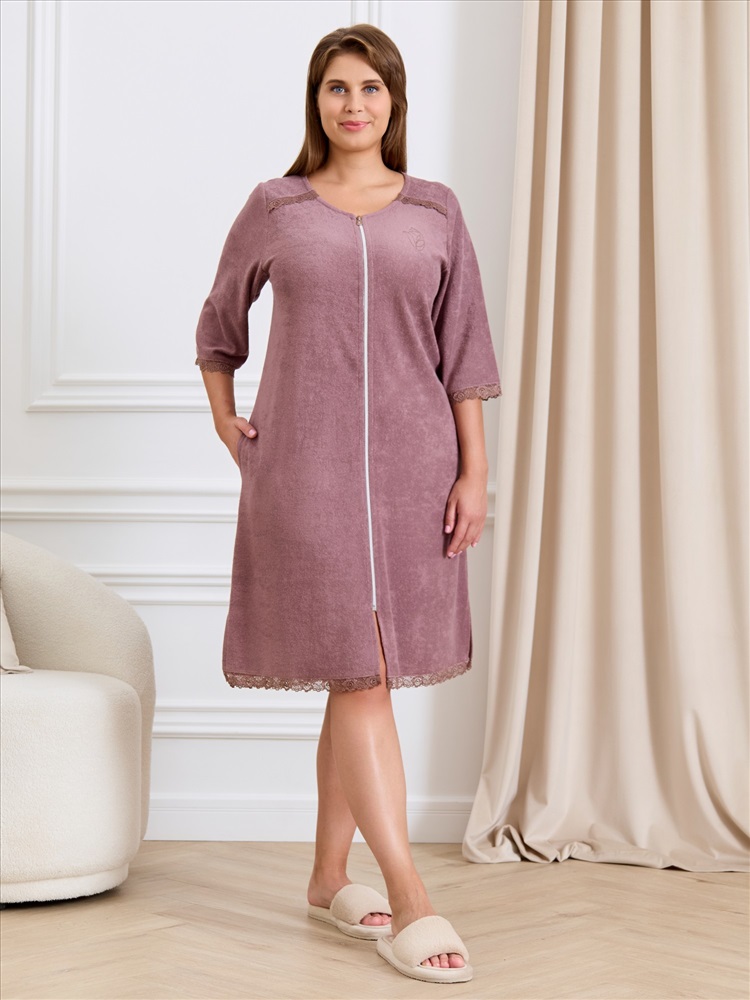 Ткань: Махра Махра - это хлопчатобумажная ткань, поверхность которой с одной стороны покрыта ворсом из петель нитей. Это очень мягкая ткань, легко впитывает влагу в больших количествах. Махра - натуральный материал, он гипоаллергенный и воздухопроницаемый. Ворс может быть с одной стороны или с двух (односторонняя или двусторонняя махра). Так оставаться в виде петель, либо стриженым. Стричь ворс могут сплошным полотном, или художественно выстригая узоры. Все это разновидности махровой ткани. Халат женский из гладкокрашенного трикотажного махрового полотна, прямого силуэта, с горловиной овальной формы, втачными рукавами длиной ¾ длины, карманами в боковых швах и центральной бортовой застежкой на тесьму «молния». Полочка – с двумя небольшими косыми кокетками с кружевом в швах соединения кокеток с основными деталями, на левой полочке выполнена вышивка. Нижние срезы рукавов и нижние срезы изделия обработаны кружевом, в боковых швах разрезы.