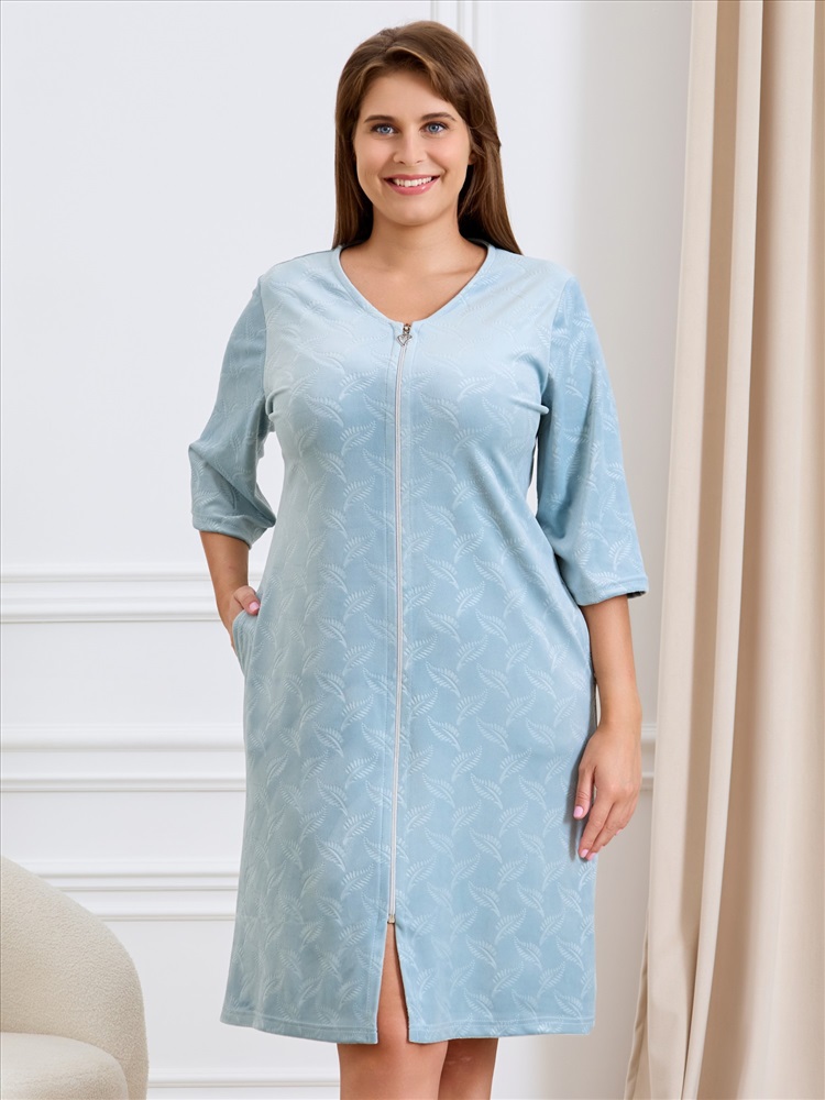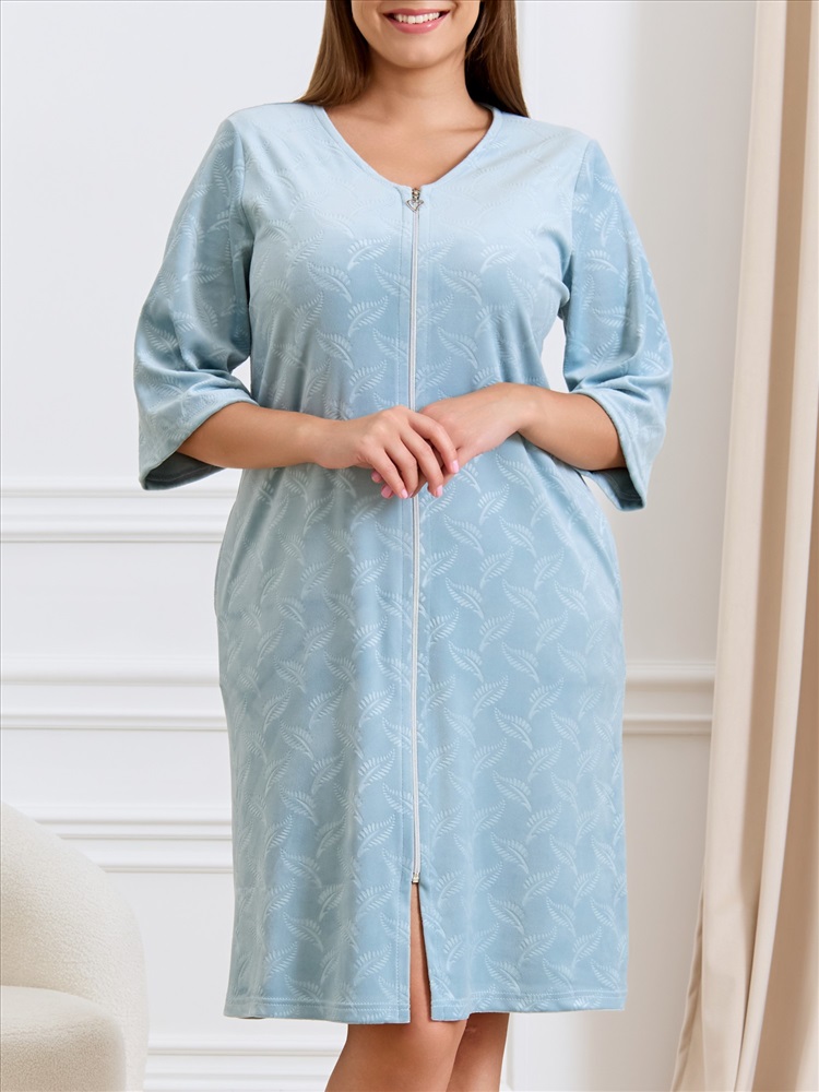 Ткань: Вельмонд Халат женский из гладкокрашеного полотна «велюр» с рисунком, выполненным тиснением на термопрессе. Изделие прямого силуэта, с втачными рукавами длиной ¾, горловиной овальной формы, карманами в боковых швах и центральной бортовой застежкой на тесьму «молния».