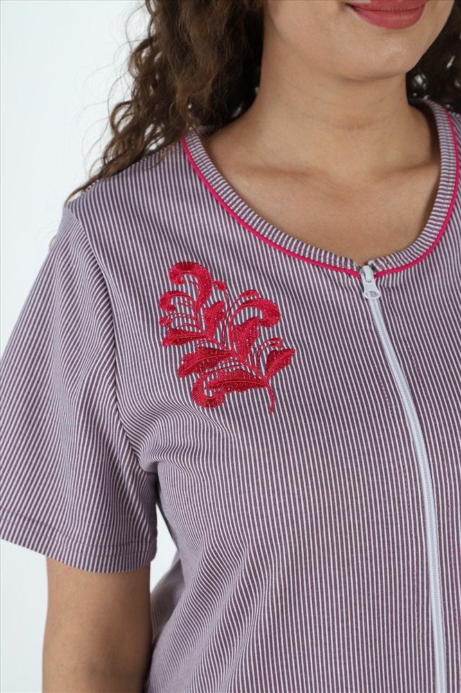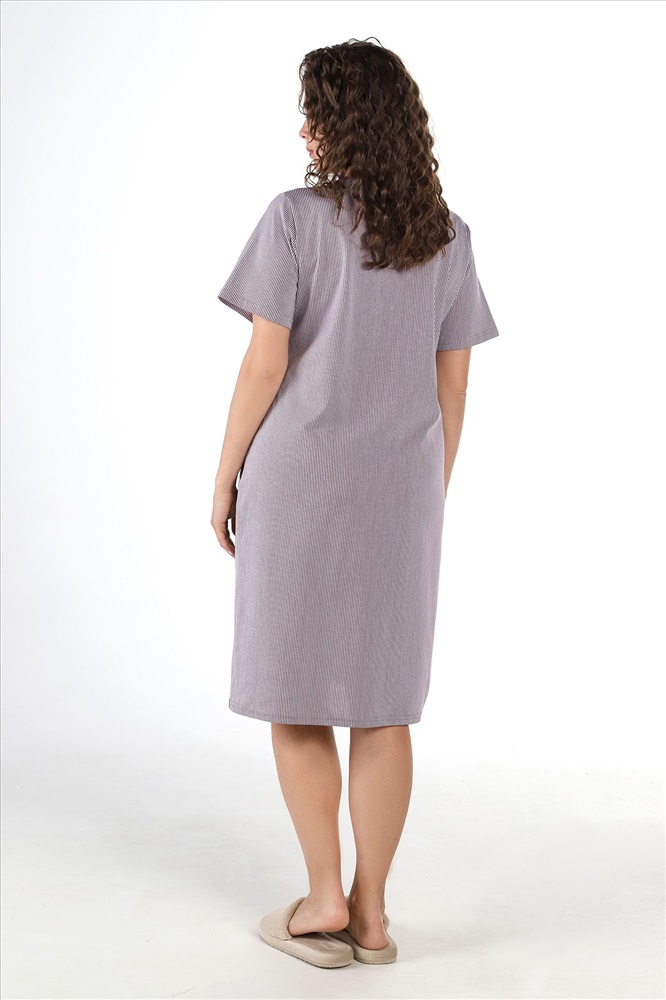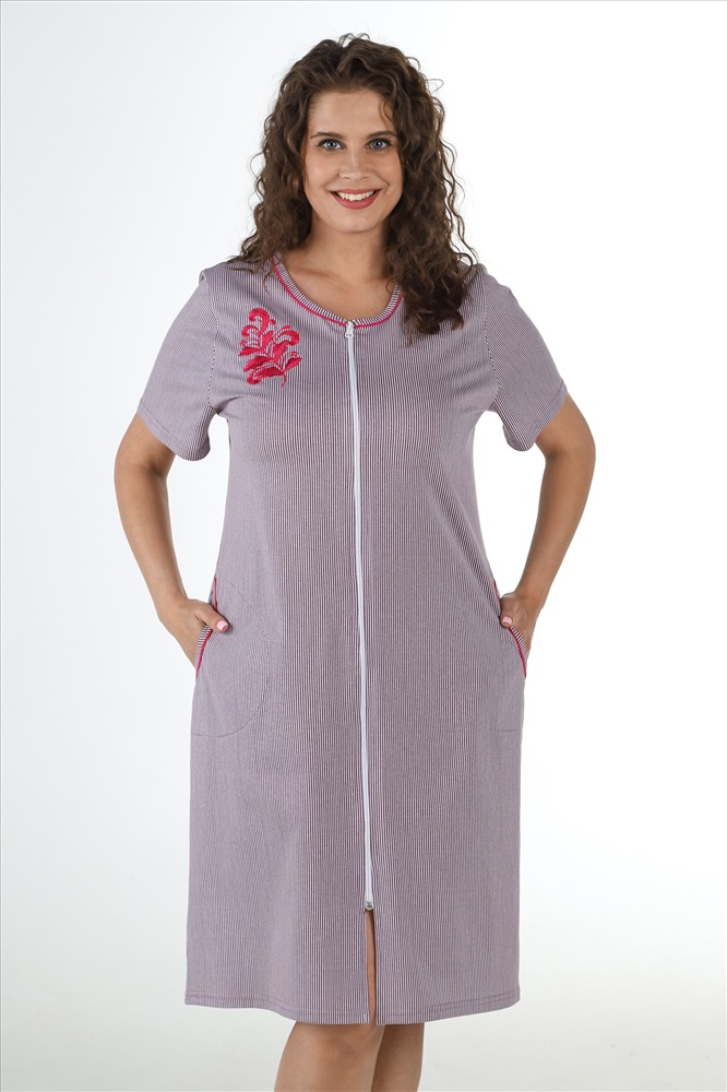 Халат из трикотажного полотна «кулирка» с набивным рисунком в полоску, прямого силуэта, с короткими втачными рукавами, горловиной овальной формы, карманами в боковых швах и центральной бортовой застежкой на тесьму «молния». Горловина и входы в карманы окантованы двойным кантом.