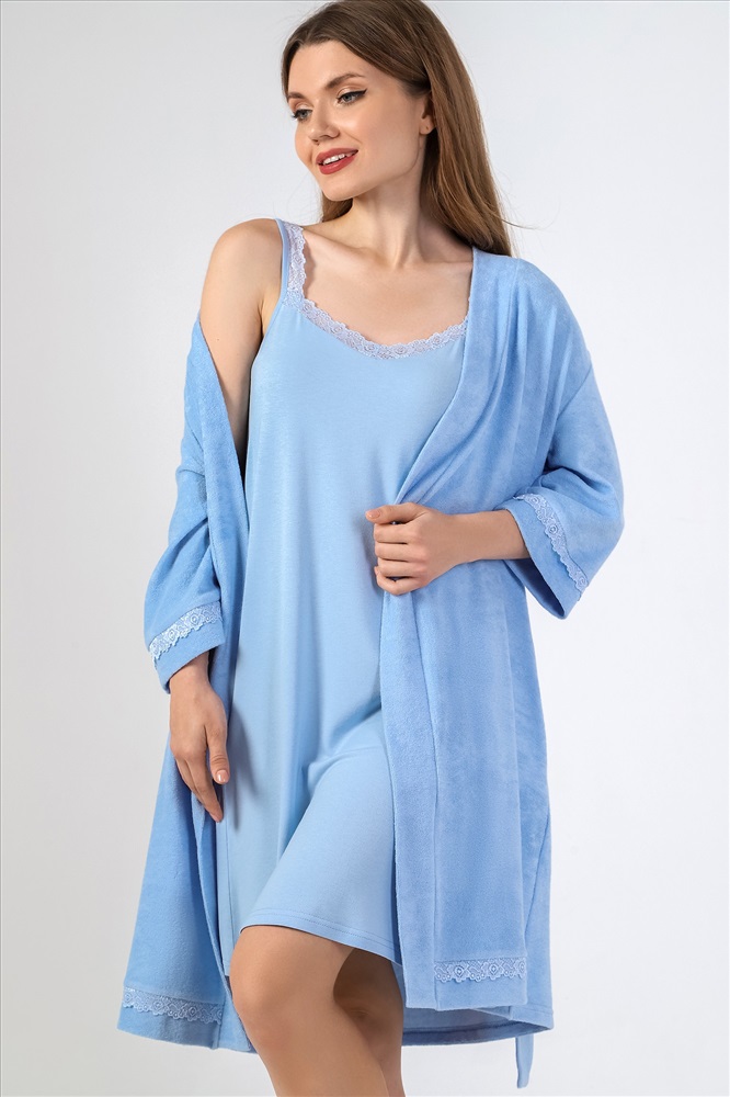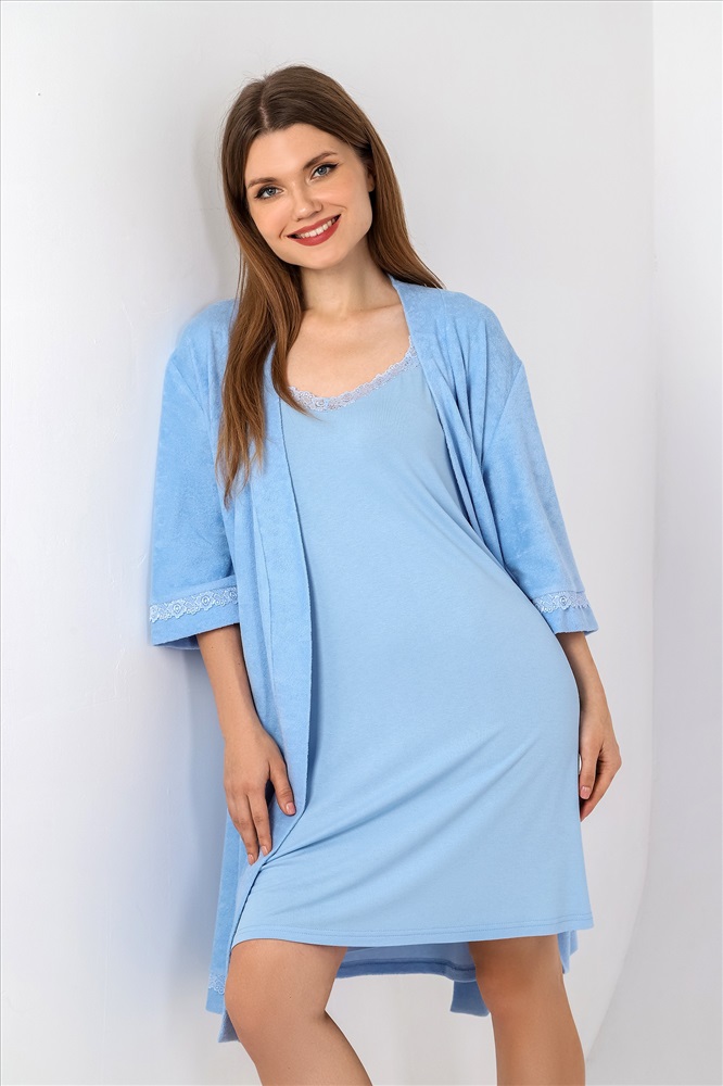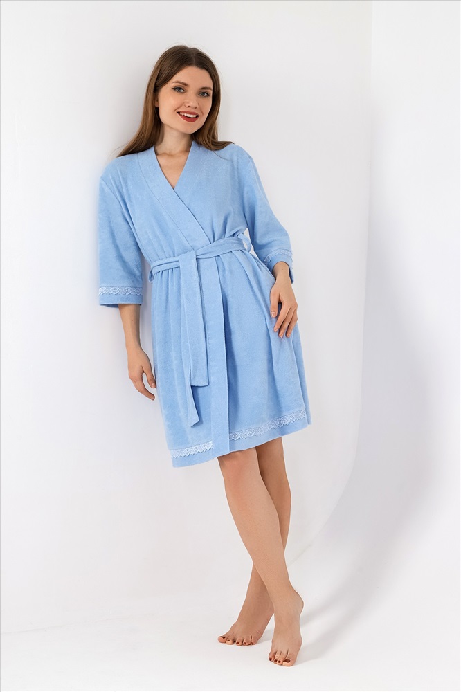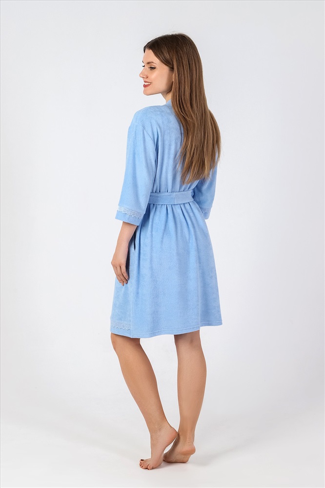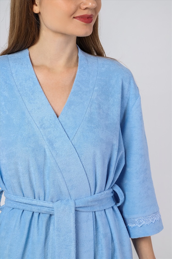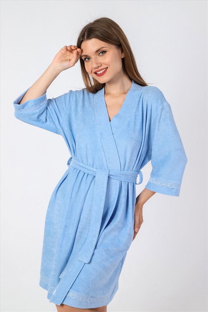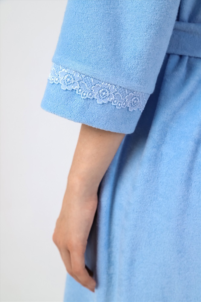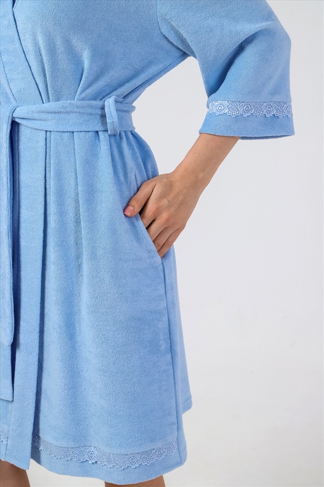 Халат молодежный из гладкокрашеного трикотажного махрового полотна, прямого силуэта, на запахе, с рукавами длиной ¾, карманами в боковых швах и съемным поясом, завязывающимся на талии и продетым в две шлевки, вставленные в боковые швы. Рукава и низ изделия отделаны кружевом. Борта и горловина обработаны притачной планкой.
