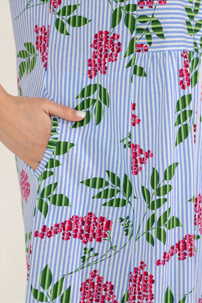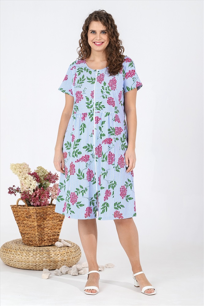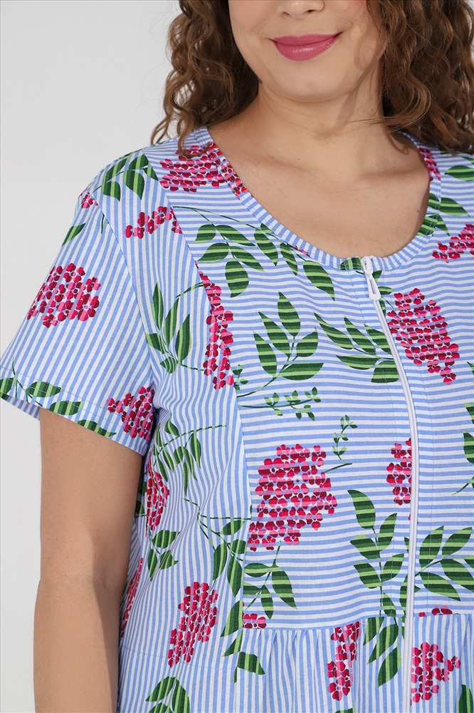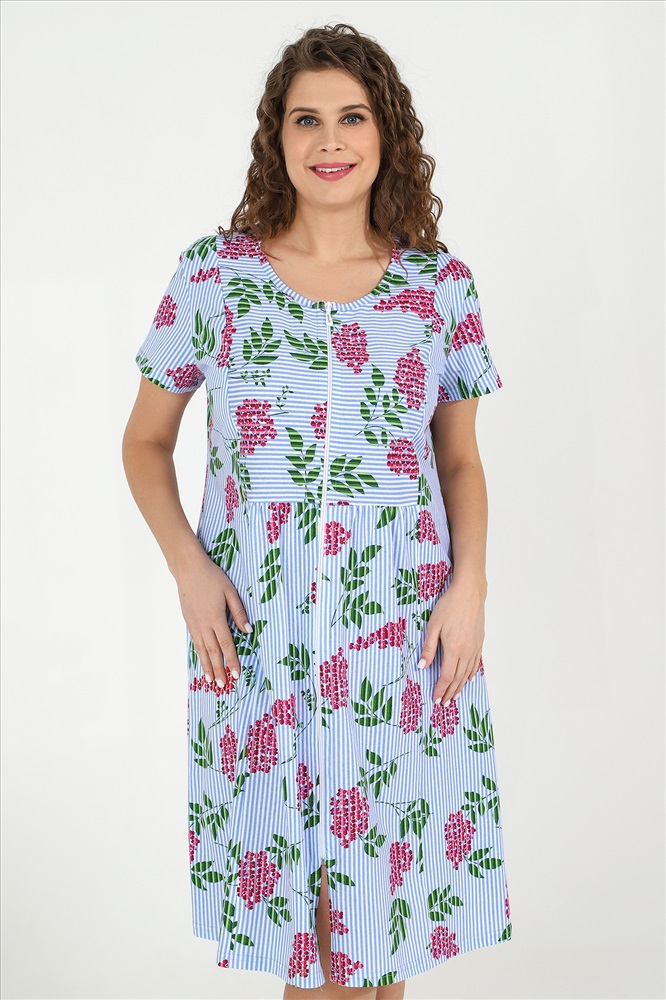 Халат из трикотажного полотна «кулирка» с набивным рисунком, свободного покроя, расширенный книзу, с короткими втачными рукавами, горловиной овальной формы, карманами в боковых швах и центральной бортовой застежкой на тесьму «молния». Полочка – с рельефами, выходящими из плечевых швов. Центральные части полочек – из двух частей каждая. Нижние центральные детали полочек присборены по швам стачивания с верхними. Окантовка входов в карманы и горловины, а также рельефные швы и швы соединения верхних центральных деталей переда с нижними выполнены с узким белым кантом.