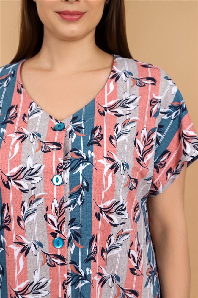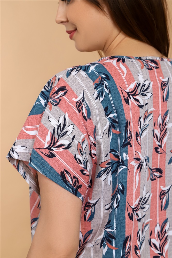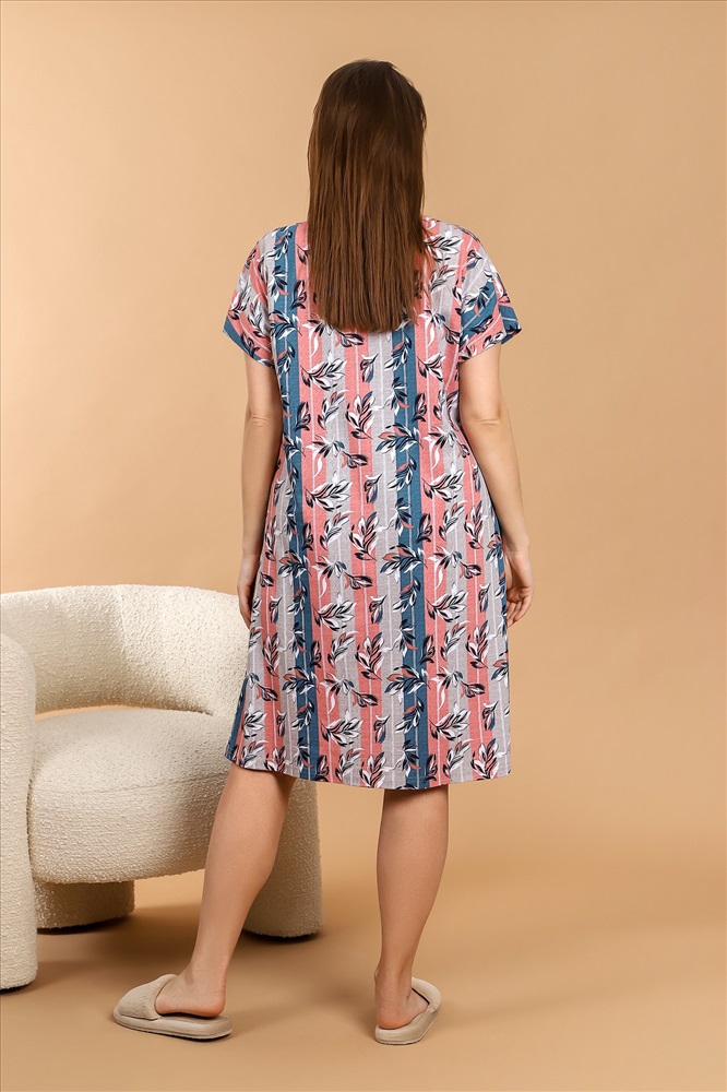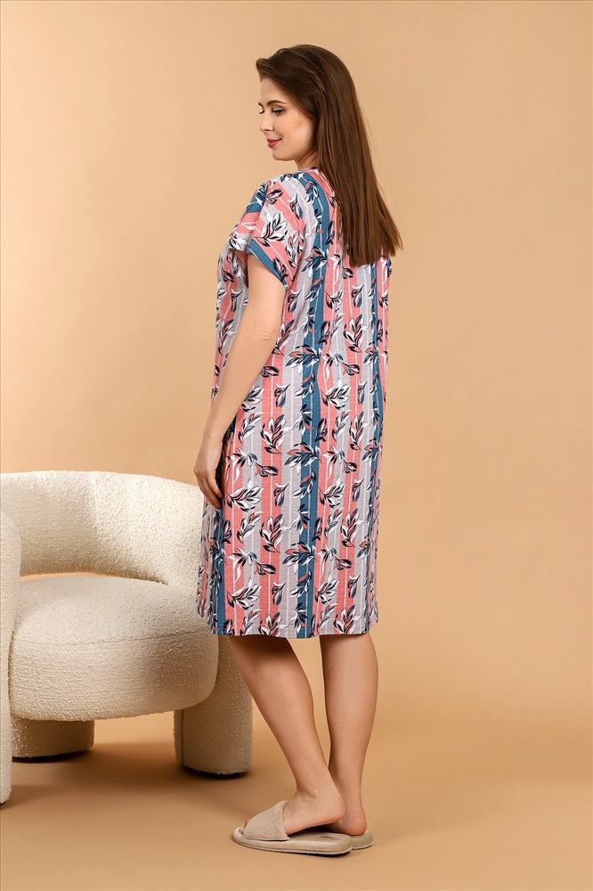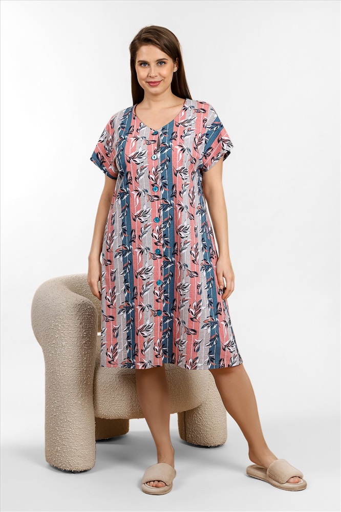 Ткань: Кулирка Кулирка - это самое гладкое и тонкое трикотажное полотно из чистого хлопка. С лицевой стороны ткань «кулирка» выглядит как «вертикальные косички», орнамент изнаночной стороны напоминает «кирпичную кладку». Свойства кулирного трикотажа- воздухопроницаемость, гигроскопичность, не теряя своей формы, практически не тянется в длину и хорошо растягивается в ширину, не образует складки. Халат женский из трикотажного полотна «кулирка» с набивным рисунком, свободного покроя, с цельнокроеными рукавами, центральной бортовой застежкой на петли и пуговицы, карманами в боковых швах. обтачками, спинка окантована.