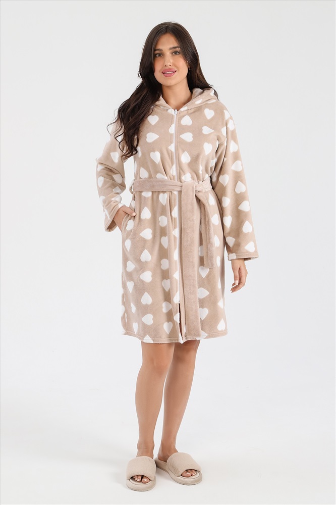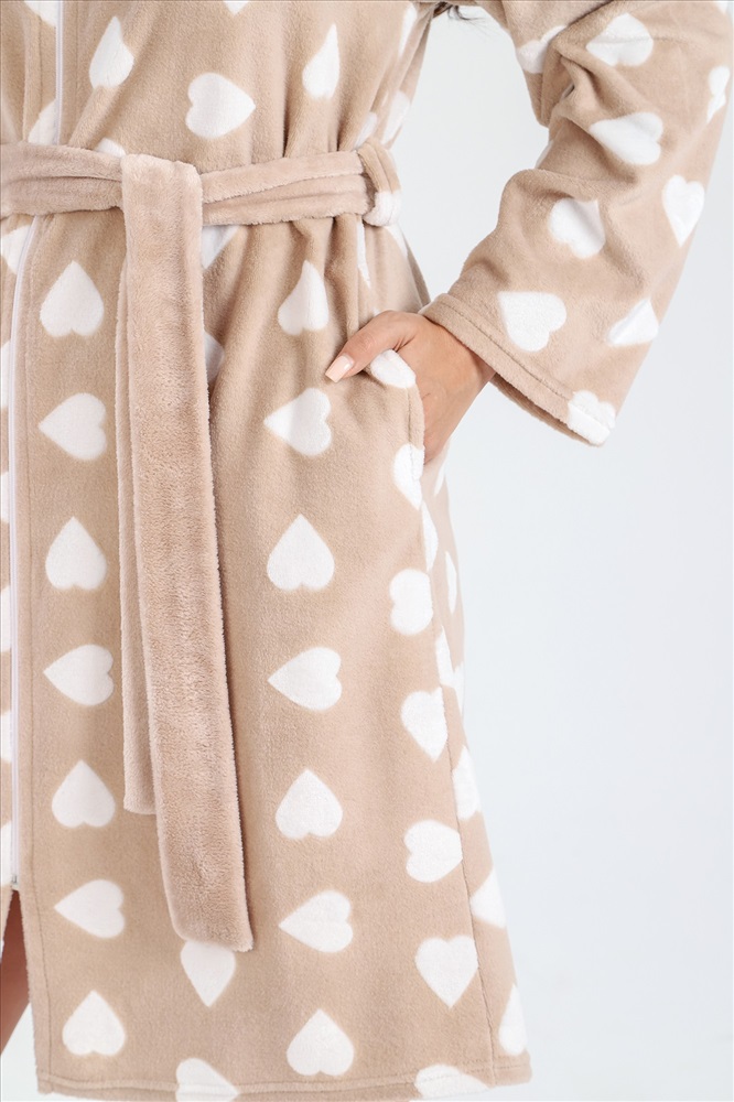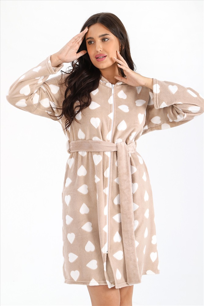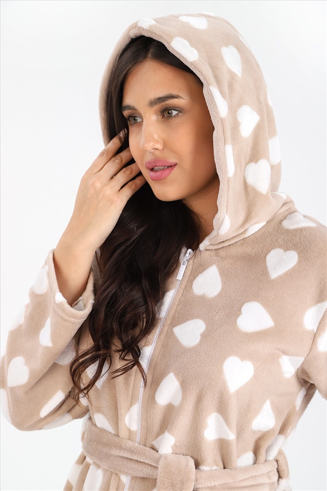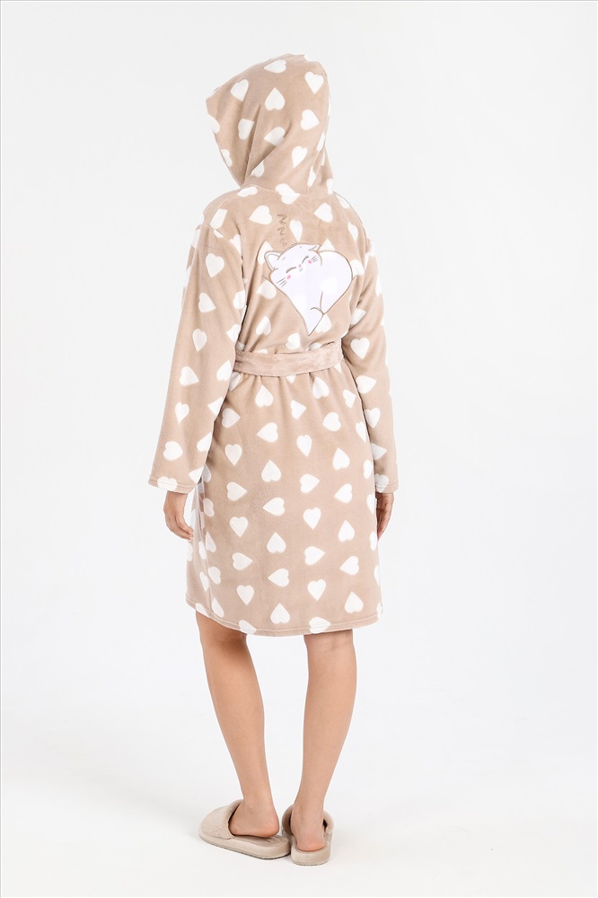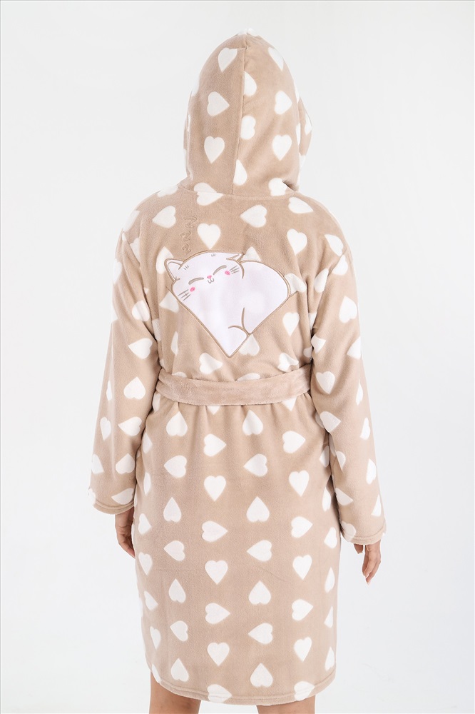 Халат из тканого полотна «ультрасофт», прямого силуэта, с длинными втачными рукавами, капюшоном, карманами в боковых швах, вышивкой – аппликацией в верхней части спины и центральной бортовой застежкой на тесьму «молния». Съёмный пояс, завязывающийся на талии вдет в две шлевки, вставленные в боковые швы.