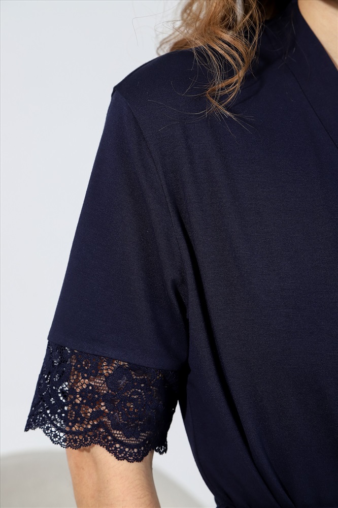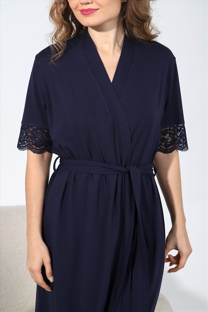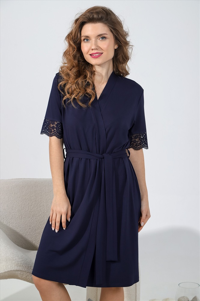 Халат молодежный из гладкокрашеного трикотажного полотна, на запахе, с короткими втачными рукавами, отделанными кружевом по нижним срезам, со съемным поясом, завязывающимся на талии и продетым в две шлевки в ботовых швах. Бортовые срезы и горловина обработаны притачной планкой.