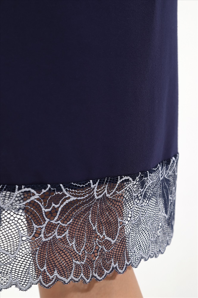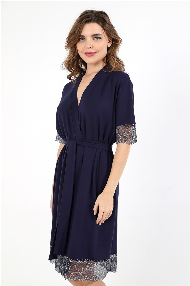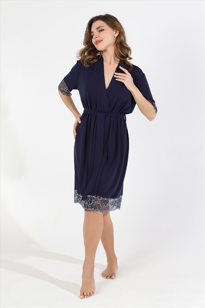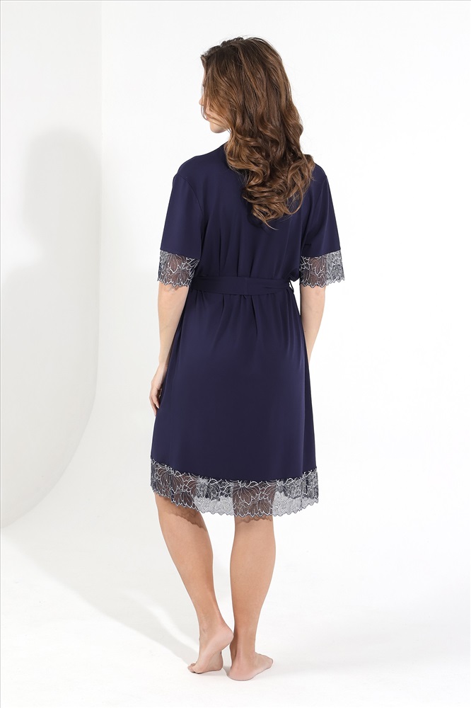 Халат из гладкокрашеного трикотажного вискозного полотна, на запахе, с короткими втачными рукавами с кружевными манжетами, с притачной планкой по горловине и бортовым срезам, со съемным поясом, продетым через две шлевки в боковых швах. Низ изделия отделан широким кружевом.