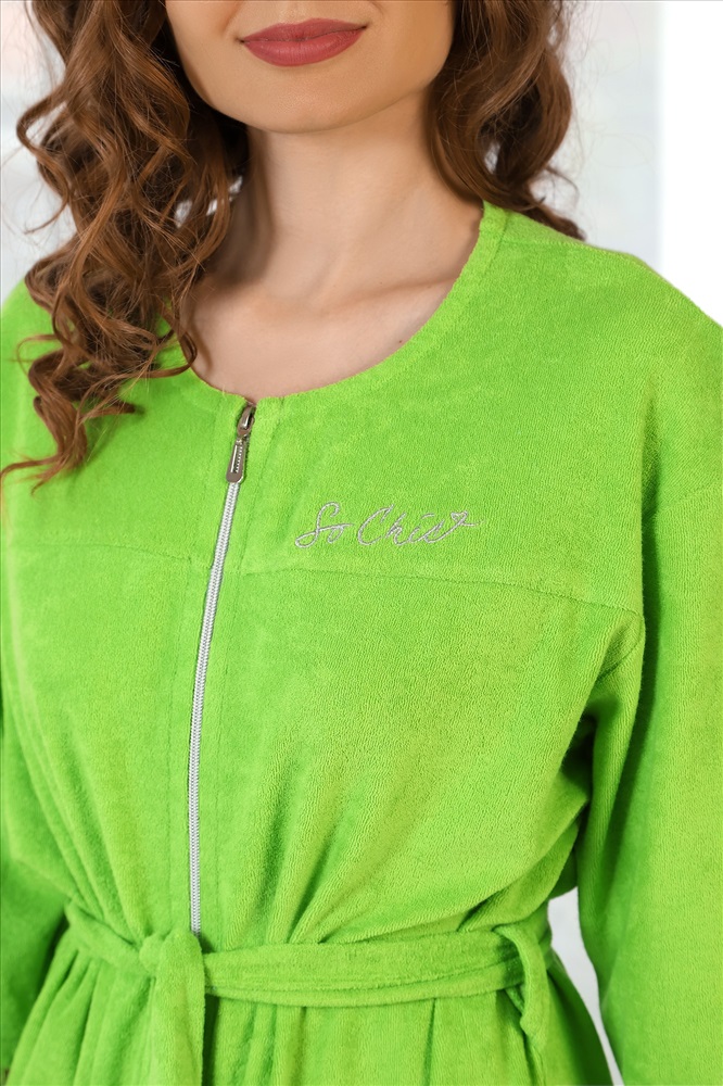 Халат молодежный из гладкокрашенного трикотажного полотна «махра», прямого силуэта, горловиной овальной формы, втачными рукавами длиной до локтя, карманами в боковых швах и центральной бортовой застежкой на тесьму «молния». На левой кокетке полочки вышивка. Комплект укомплектован съемным поясом, завязывающимся на талии и продетым в две шлевки, вставленные в боковые швы.