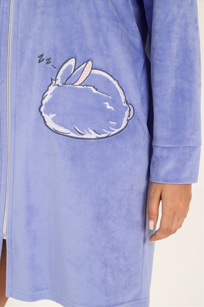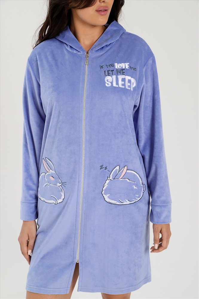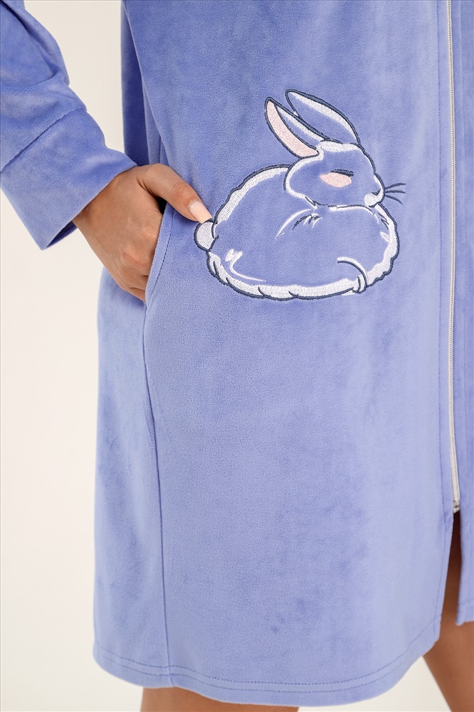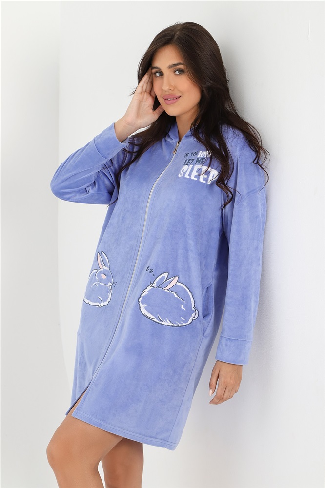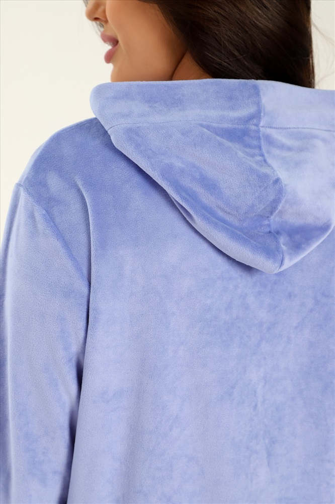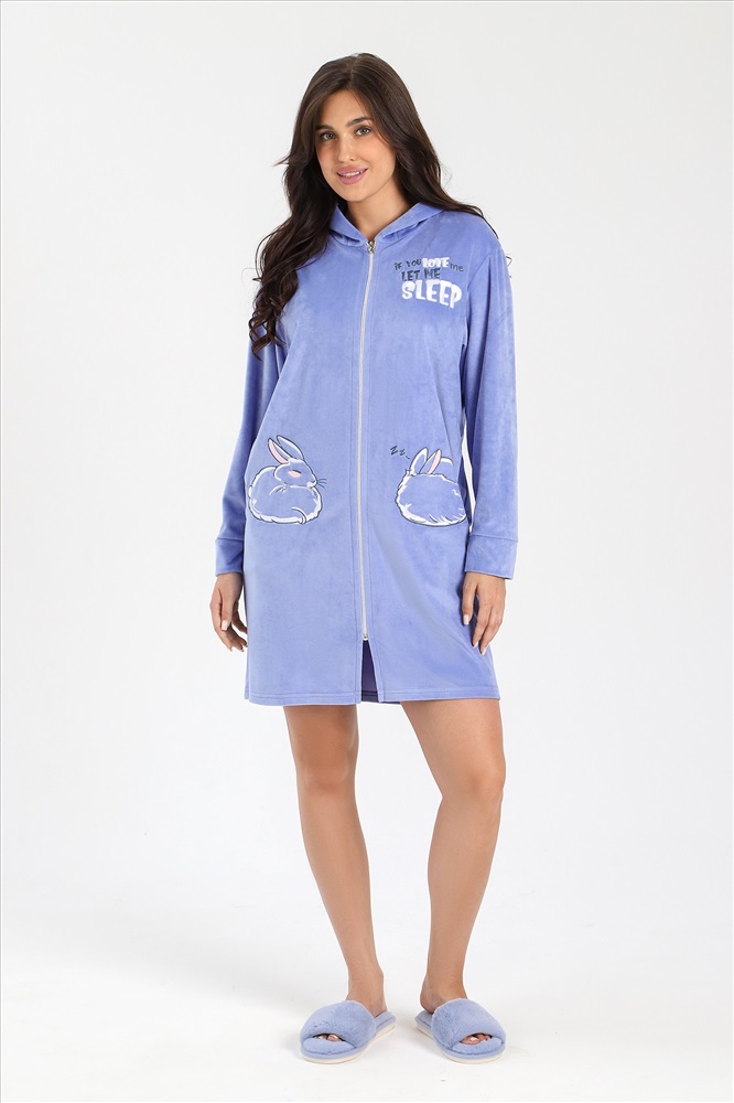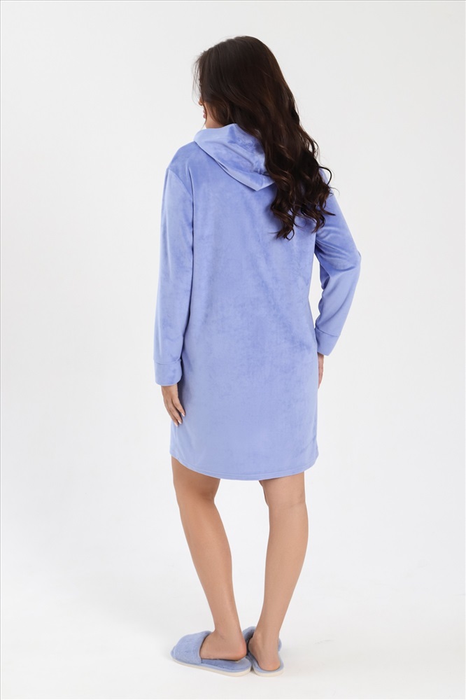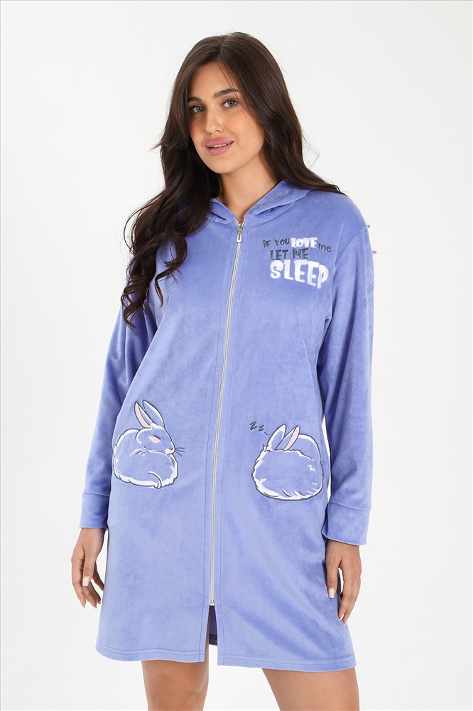 Ткань: Вельмонд Халат молодежный из трикотажного полотна «вельмонд», прямого силуэта, с длинными втачными рукавами, капюшоном, карманами в боковых швах, и центральной бортовой застежкой на тесьму «молния». В области карманов и в верхней части левой полочки выполнена вышивка – аппликация.
