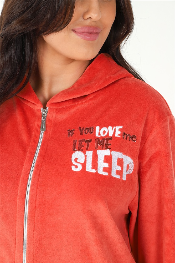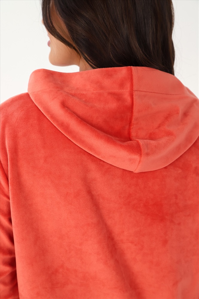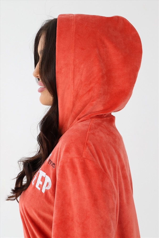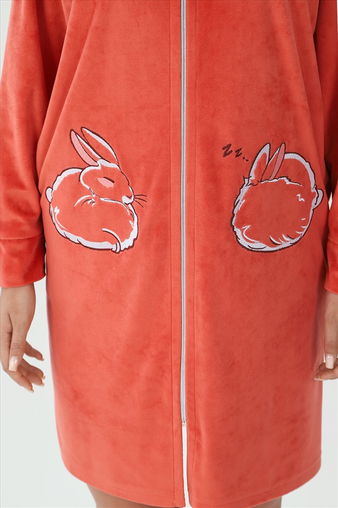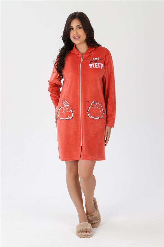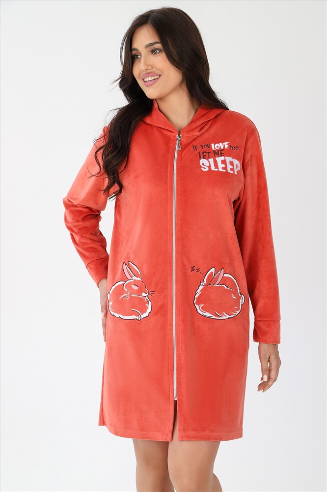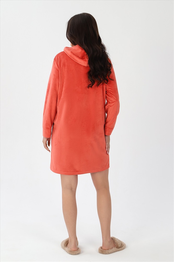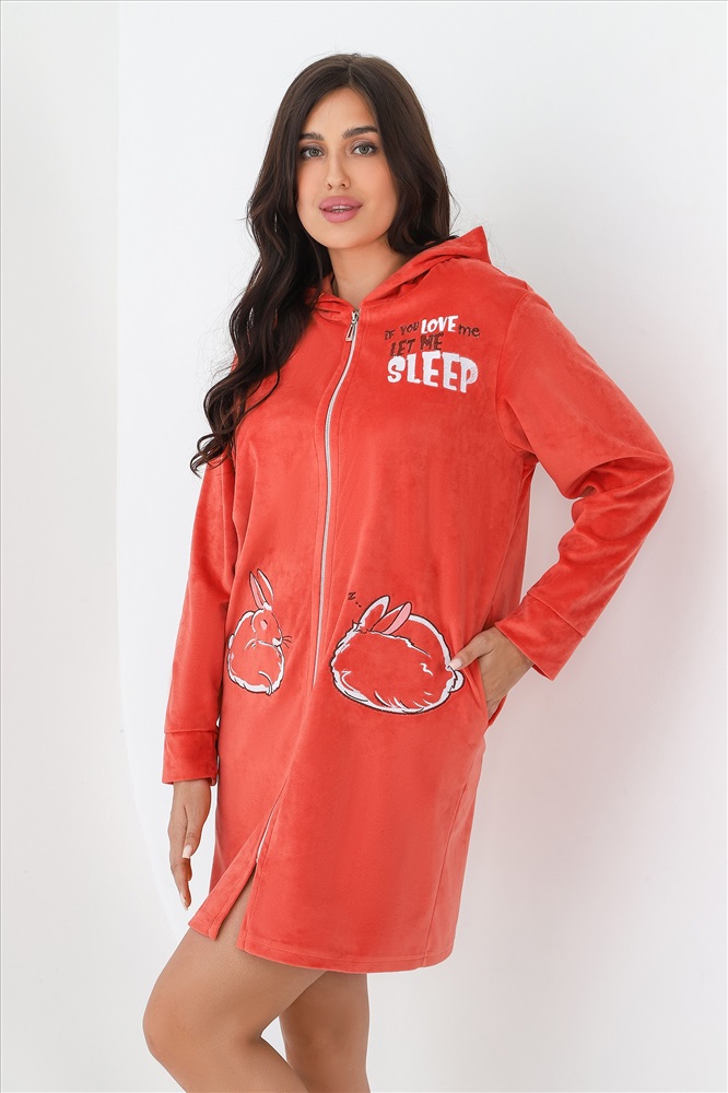 Халат молодежный из трикотажного полотна «вельмонд», прямого силуэта, с длинными втачными рукавами, капюшоном, карманами в боковых швах, и центральной бортовой застежкой на тесьму «молния». В области карманов и в верхней части левой полочки выполнена вышивка – аппликация.