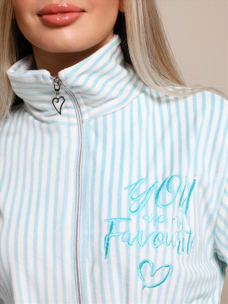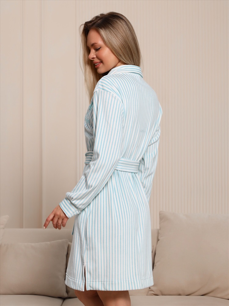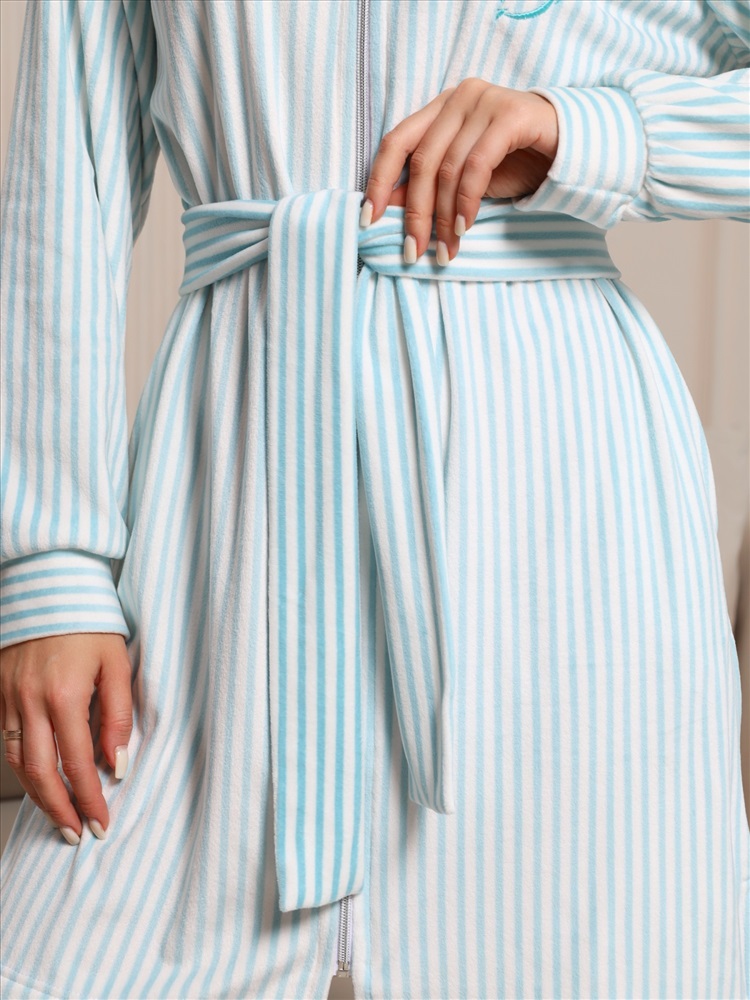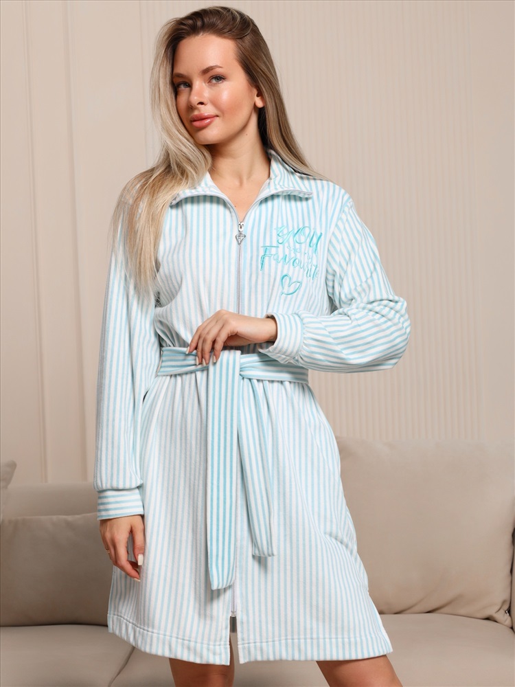 Ткань: Вельмонд (софт) Халат из трикотажного полотна «вельмонд двухсторонний» с рисунком в узкую полоску, прямого силуэта, с длинными втачными рукавами, карманами и разрезами в боковых швах, стояче-отложным воротником «стойка», центральной бортовой застежкой на тесьму «молния», съемным поясом, продетым через две шлевки в боковых швах и вышивкой на левой полочке. Рукава – с притачными манжетами.