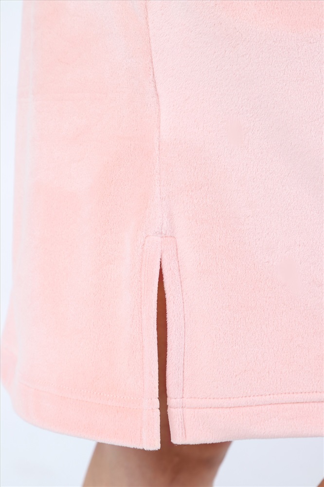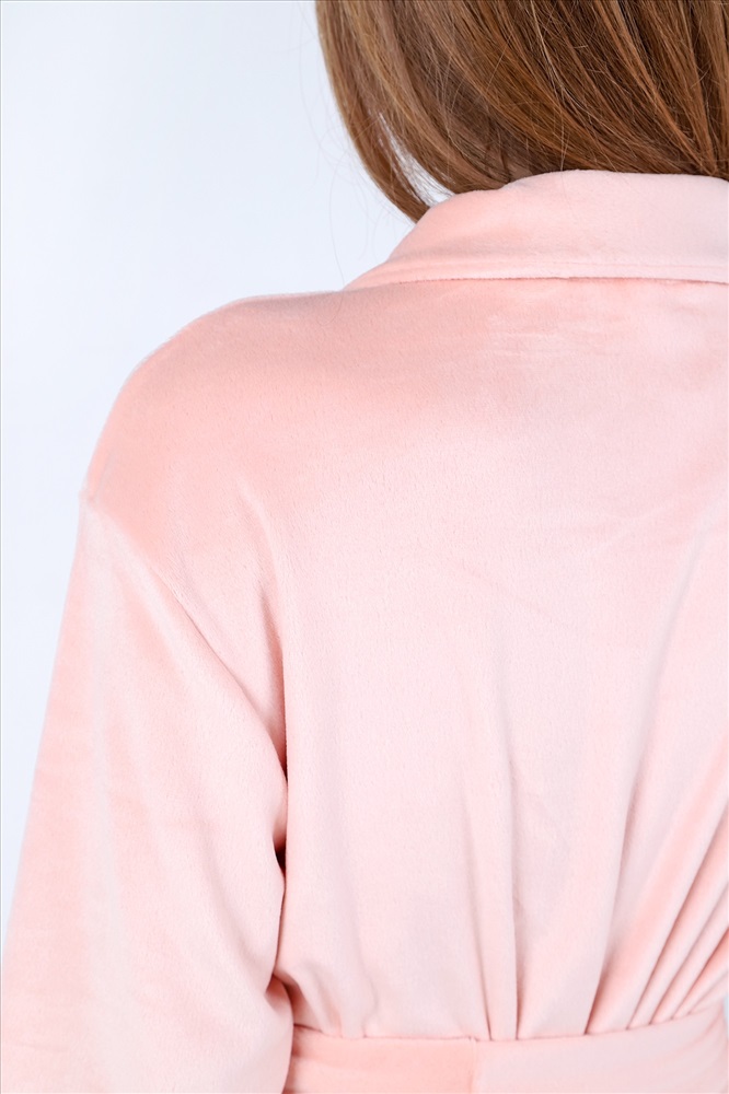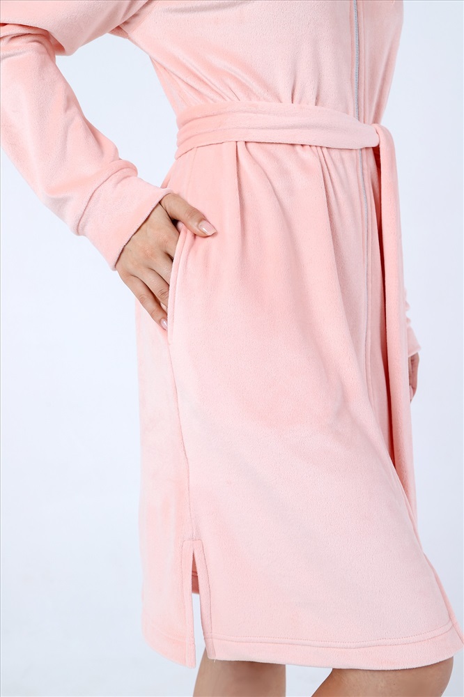 Халат из гладкокрашеного трикотажного полотна «вельмонд-софт», прямого силуэта, с длинными втачными рукавами, карманами и разрезами в боковых швах, стояче-отложным воротником «стойка», центральной бортовой застежкой на тесьму «молния», съемным поясом, продетым через две шлевки в боковых швах и вышивкой на спинке. Рукава – с притачными манжетами.