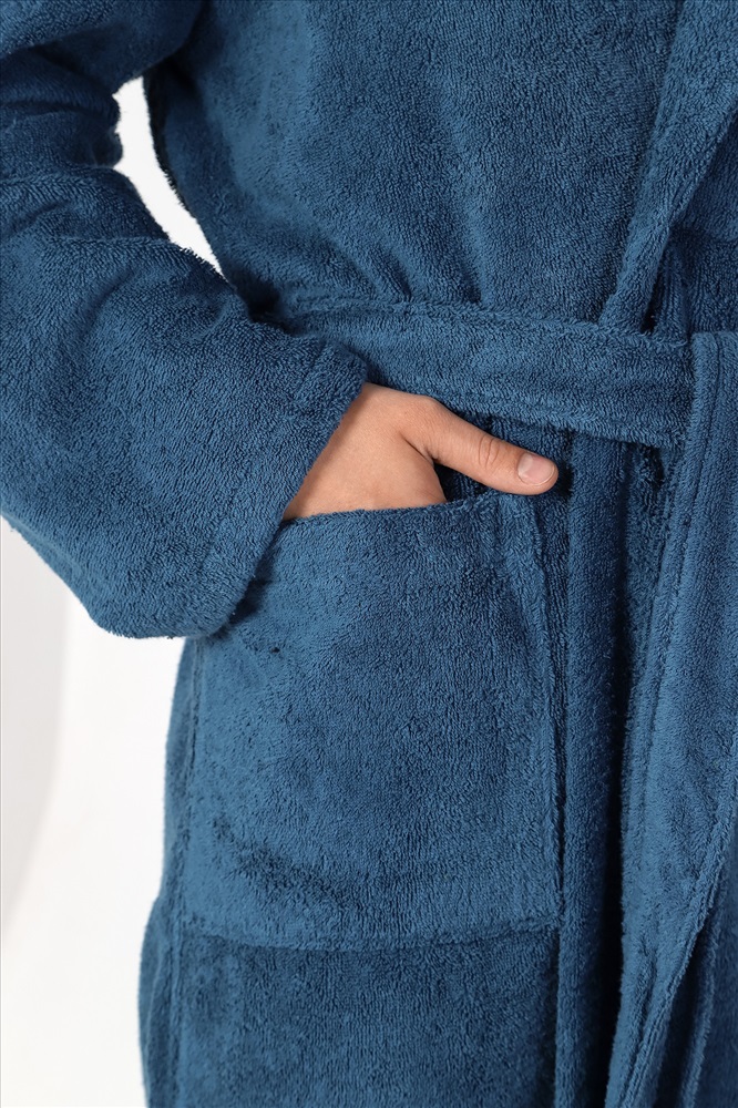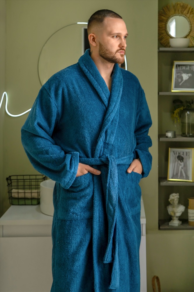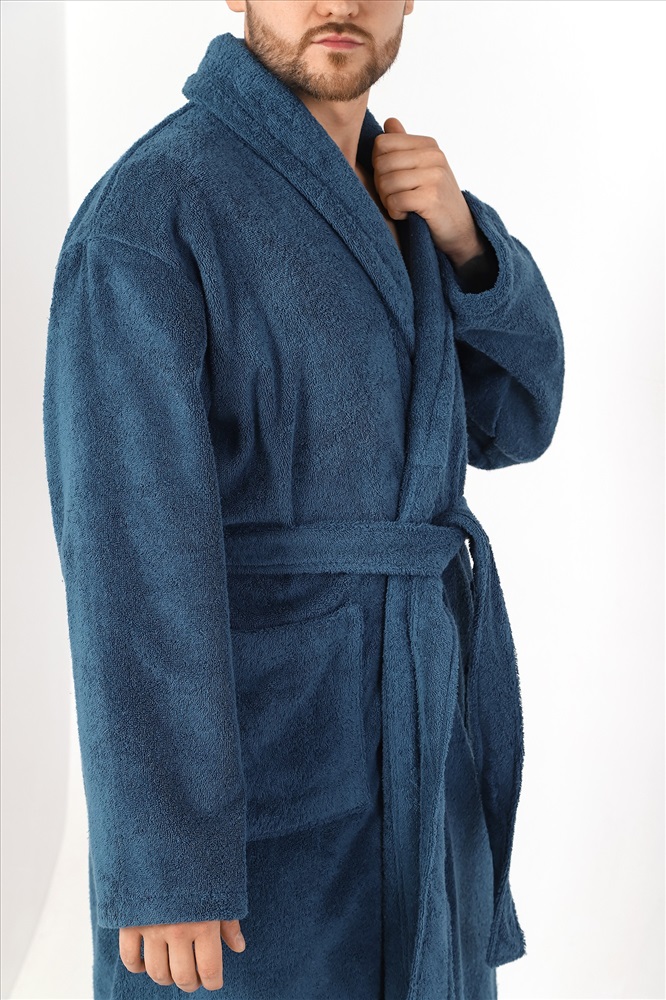 Мужской халат из двустороннего махрового хлопкового полотна. Модель на запах, с поясом в шлёвках, с боковыми карманами, с воротником "шаль", с петлей-вешалкой по горловине спинки.
