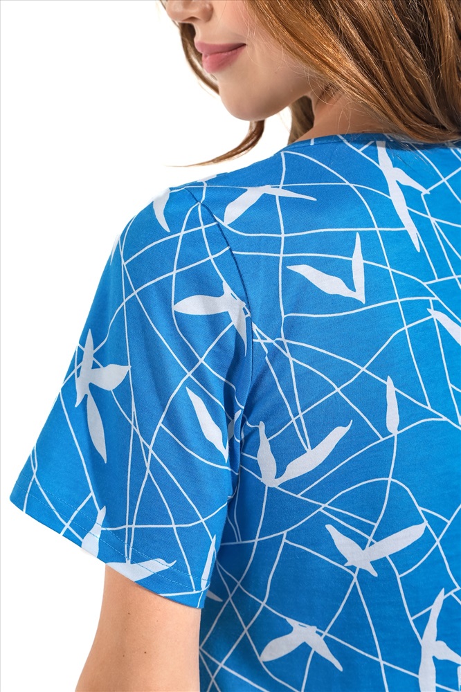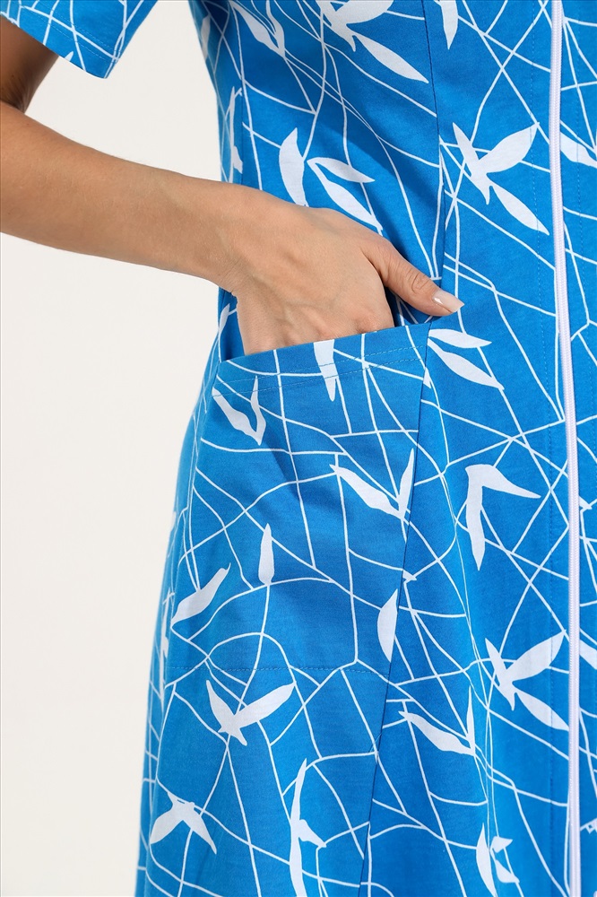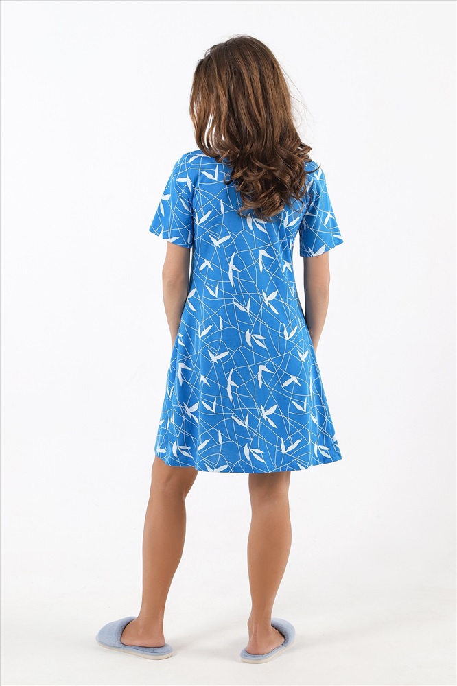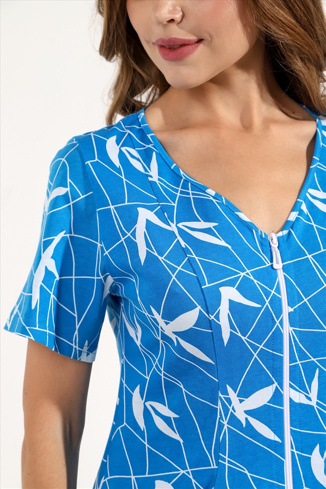Халат молодежный из трикотажного полотна «кулирка» с набивным рисунком, свободного покроя, расширенный книзу, с короткими втачными рукавами, горловиной V- образной формы, окантованной основным материалом, центральной бортовой застежкой на тесьму «молния». Полочки с рельефами и карманами на уровне бедер.