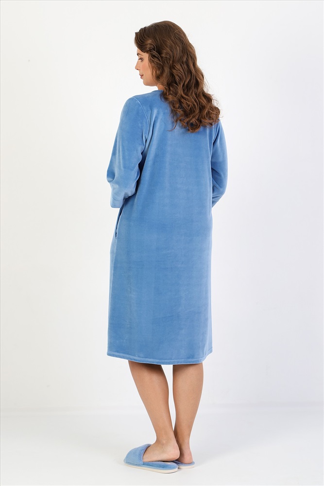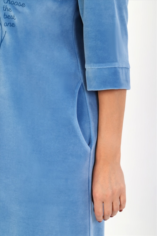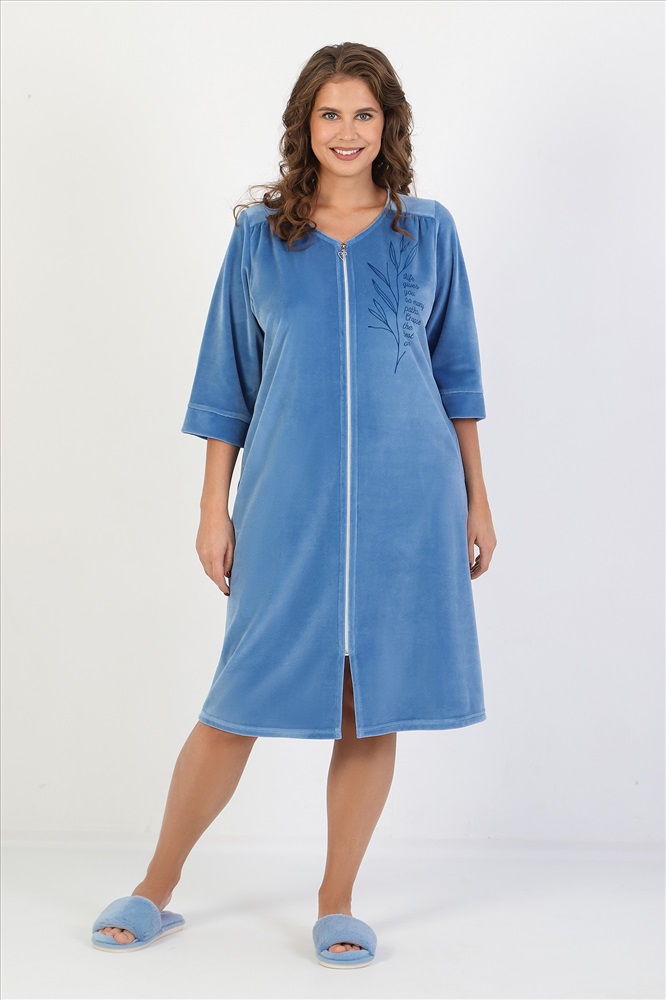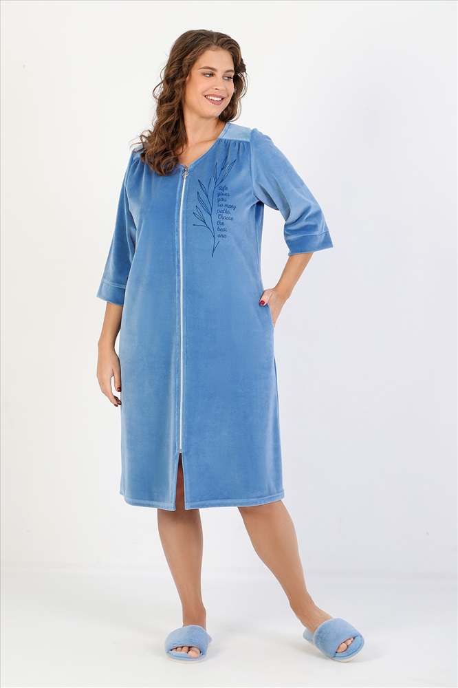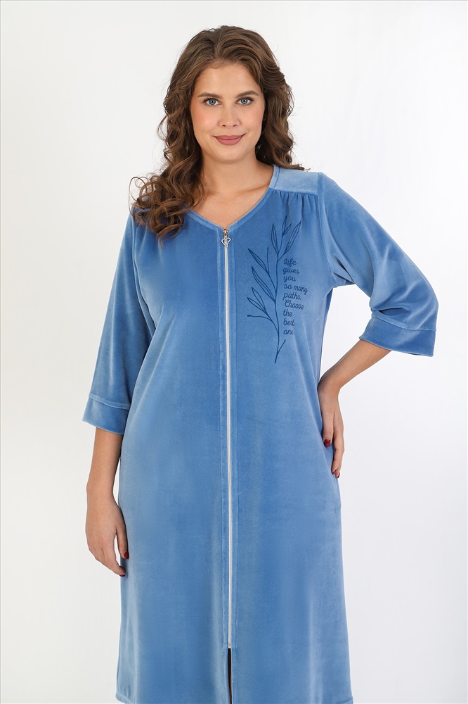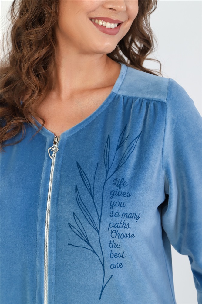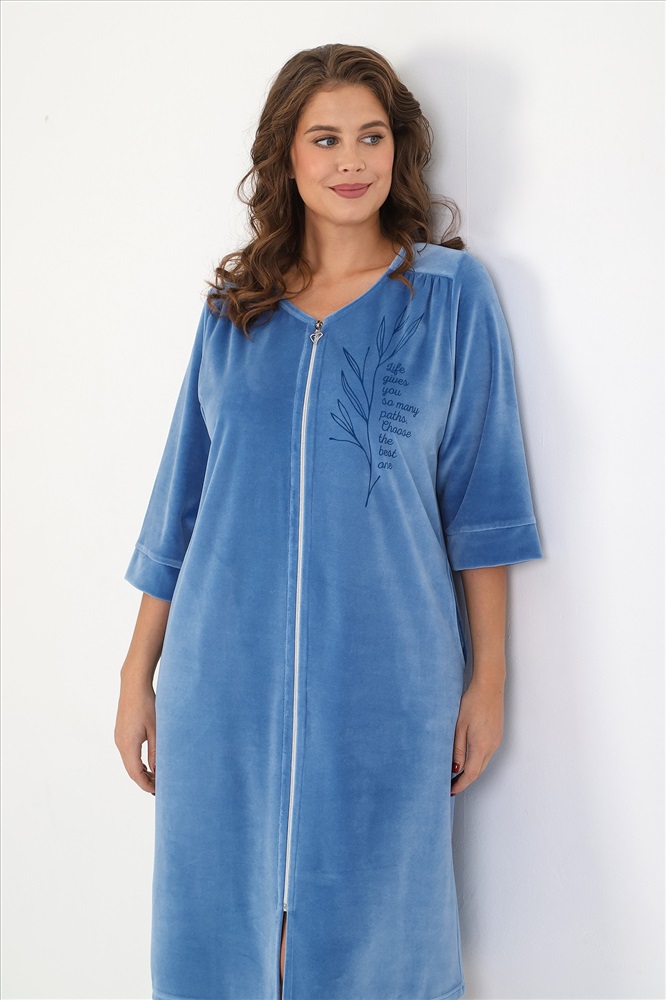 Халат женский из гладкокрашеного полотна «велюр», слегка расширенный книзу, с втачными рукавами ¾ длины, карманами в боковых швах, горловиной V-образной формы, центральной бортовой застежкой на тесьму «молния» и принтом на полочках, выполненным в технике «шелкографии». Плечевые швы изделия переходят на деталь переда, имитируя притачные кокетки со сборкой.