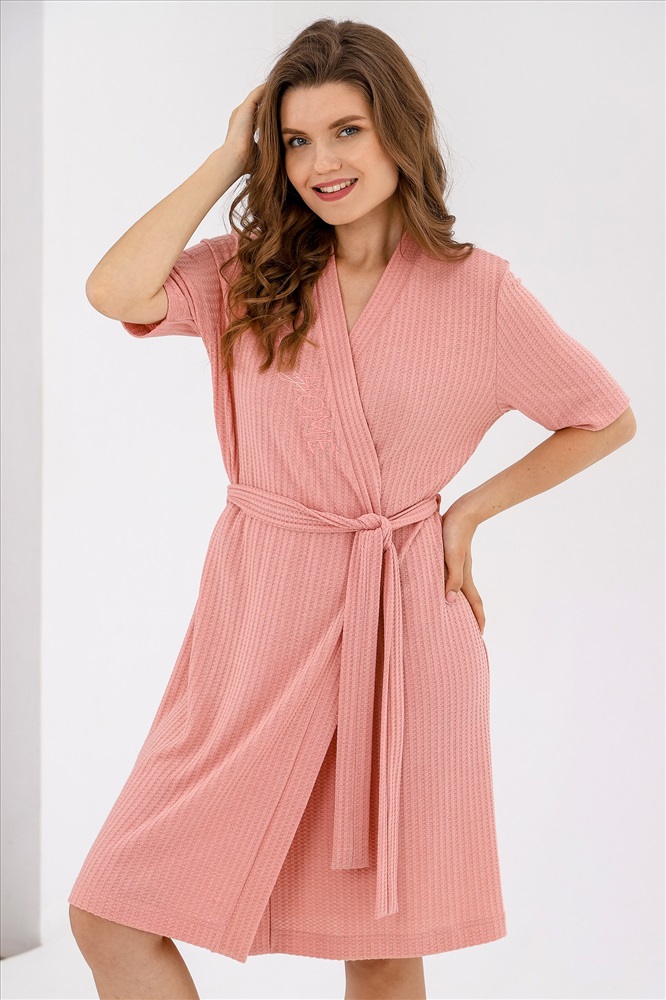 Халат молодежный из гладкокрашеного фактурного трикотажного полотна «вафля», прямого силуэта, на запахе, с короткими втачными рукавами, притачной планкой по бортам и горловине, съемным поясом, продетым через две шлевки в боковых швах на уровне талии и вышивкой на правой полочке.