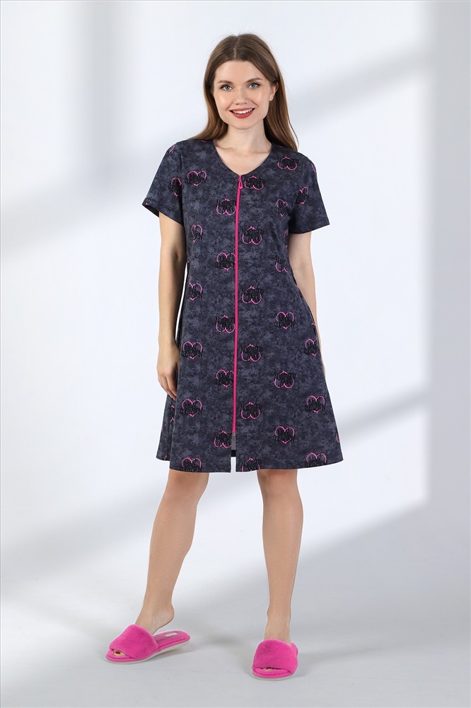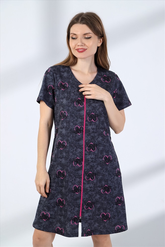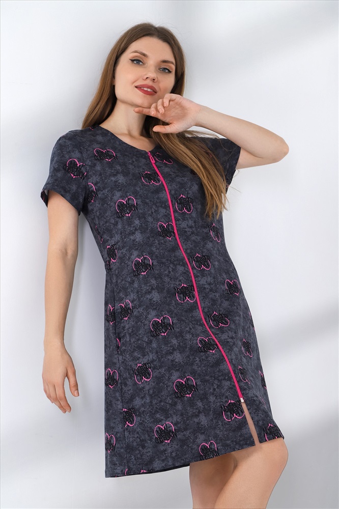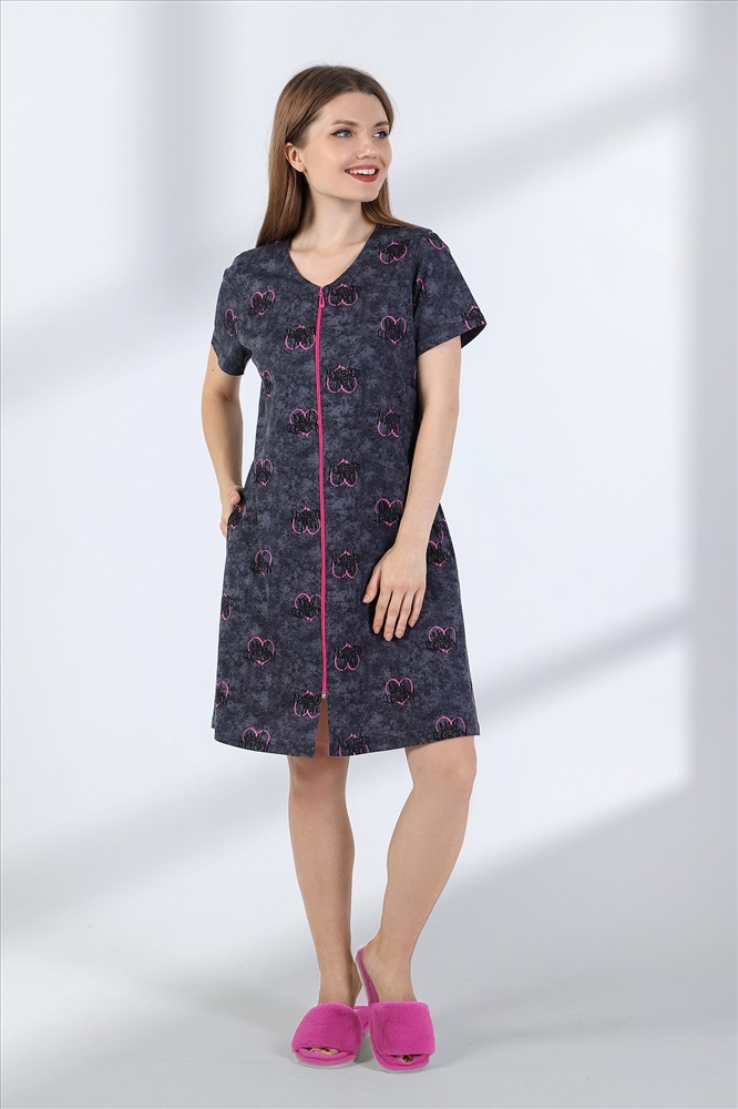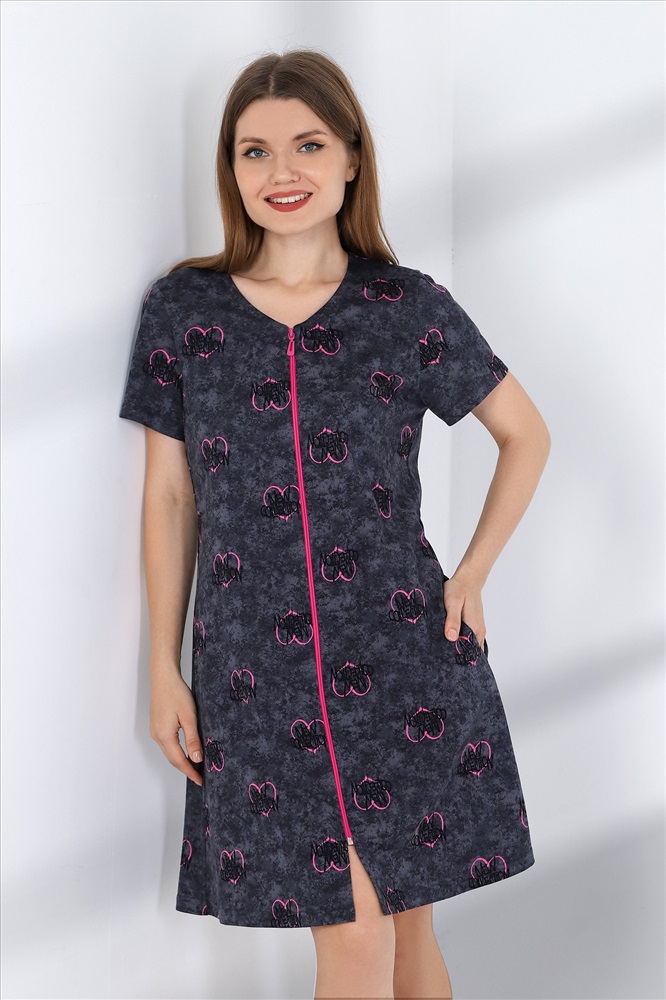 Халат молодежный из трикотажного полотна «кулирка» с набивным рисунком полуприталенного силуэта с короткими втачными рукавами, горловиной овальной формы, центральной бортовой застежкой на тесьму «молния». Спинка отрезная по талии, присборенная с помощью эластичной тесьмы продетой в «кулису».