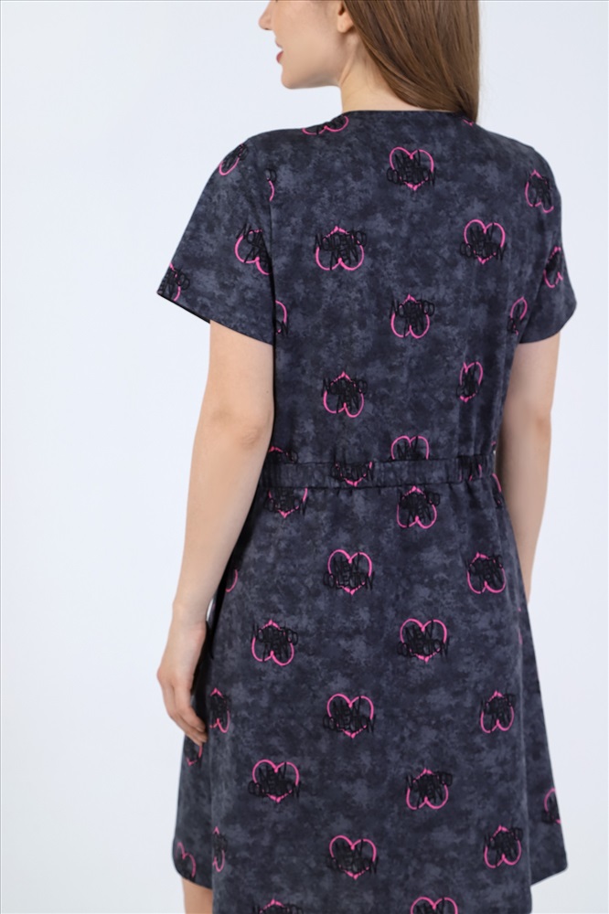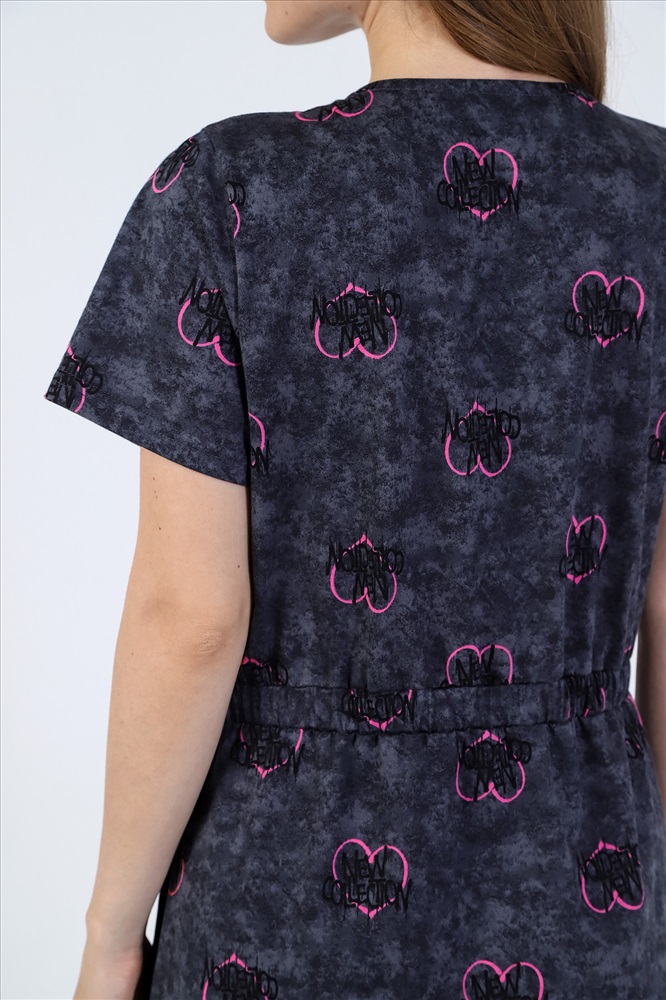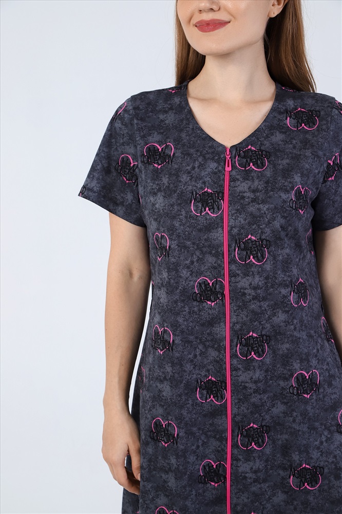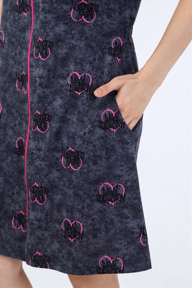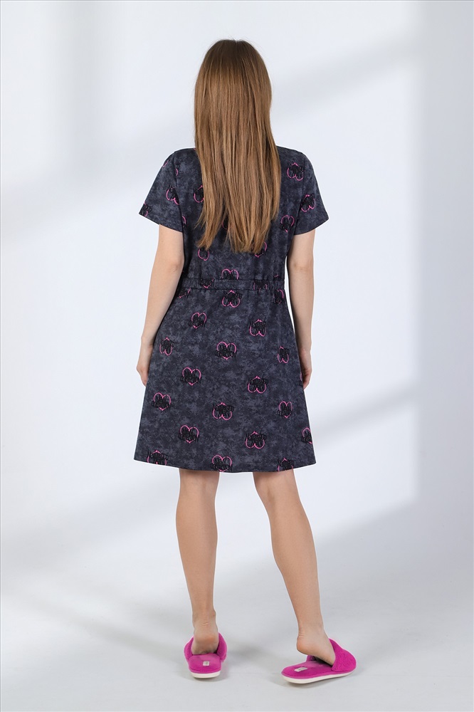 Халат молодежный из трикотажного полотна «кулирка» с набивным рисунком полуприталенного силуэта с короткими втачными рукавами, горловиной овальной формы, центральной бортовой застежкой на тесьму «молния». Спинка отрезная по талии, присборенная с помощью эластичной тесьмы продетой в «кулису».