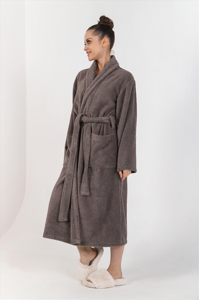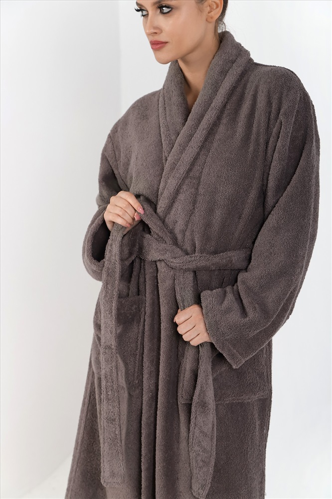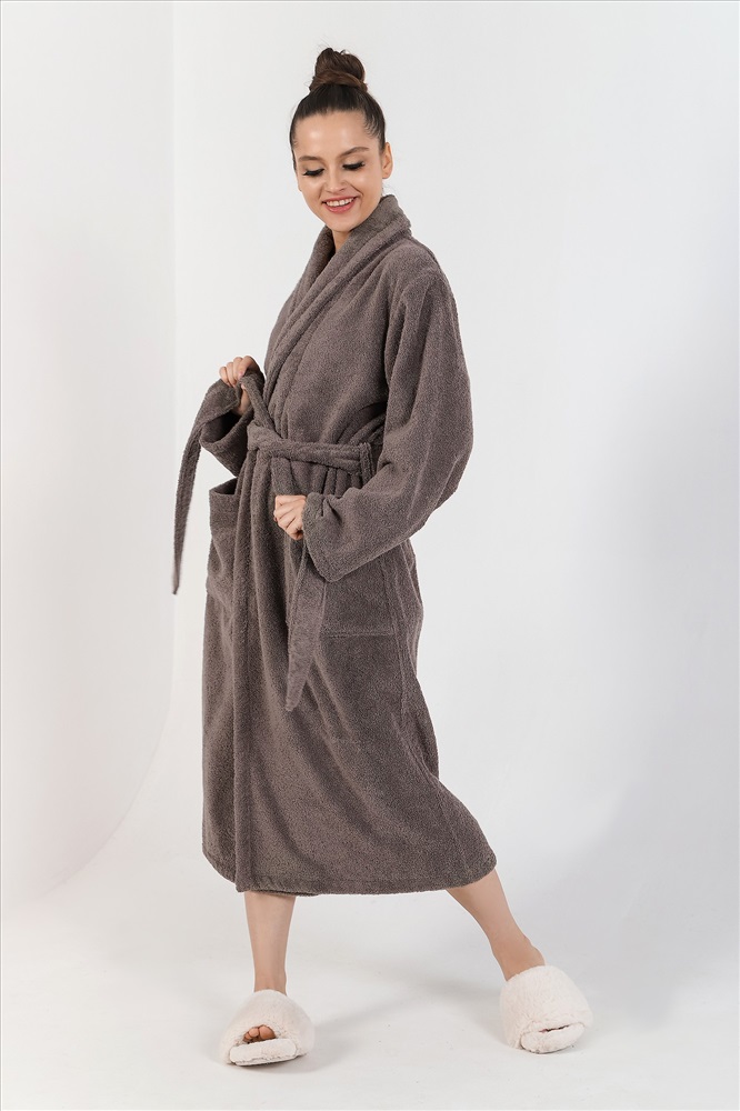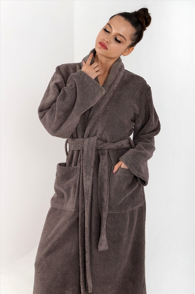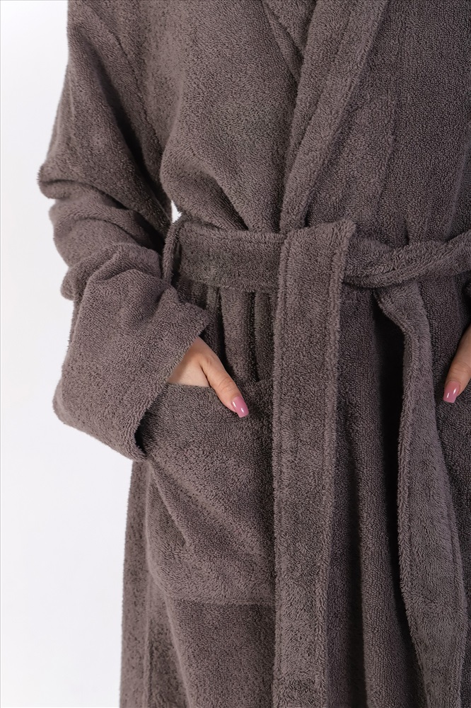 Ткань: Махра Махра - это хлопчатобумажная ткань, поверхность которой с одной стороны покрыта ворсом из петель нитей. Это очень мягкая ткань, легко впитывает влагу в больших количествах. Махра - натуральный материал, он гипоаллергенный и воздухопроницаемый. Ворс может быть с одной стороны или с двух (односторонняя или двусторонняя махра). Так оставаться в виде петель, либо стриженым. Стричь ворс могут сплошным полотном, или художественно выстригая узоры. Все это разновидности махровой ткани. Женский халат из двустороннего махрового хлопкового полотна. Модель на запах, с поясом в шлёвках, с боковыми карманами, с воротником "шаль", с петлей-вешалкой по горловине спинки.