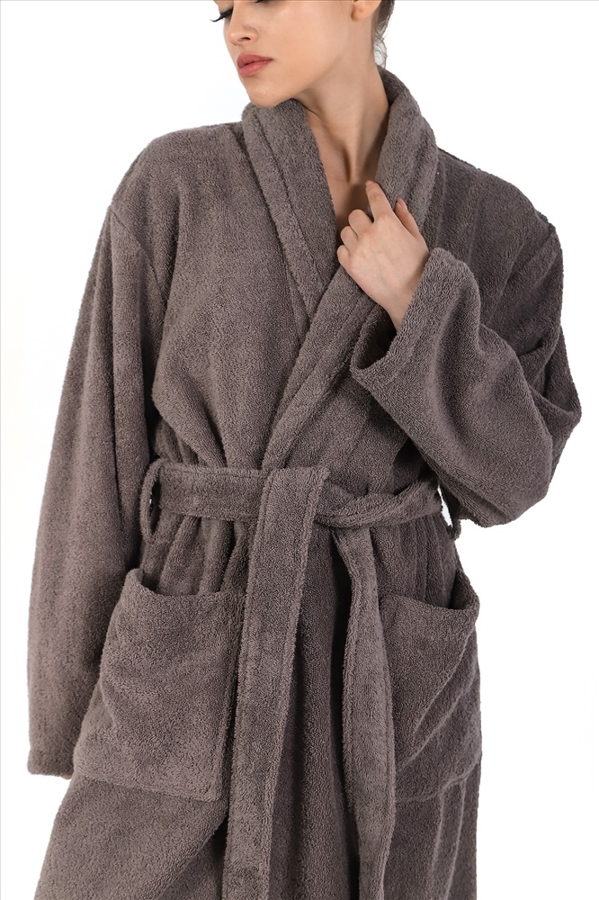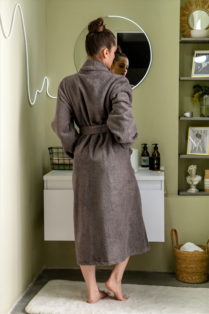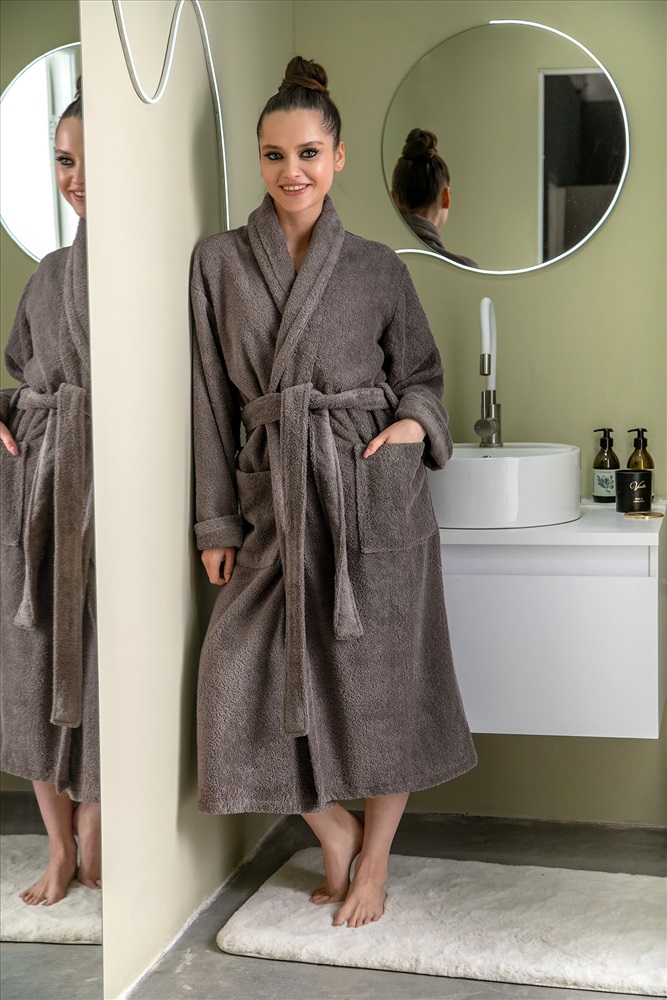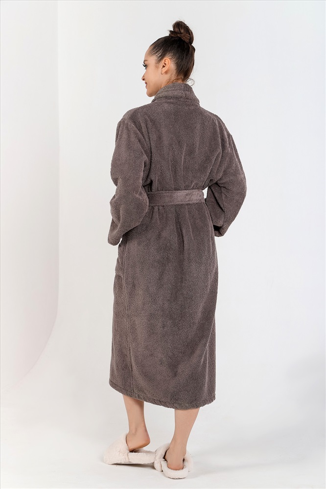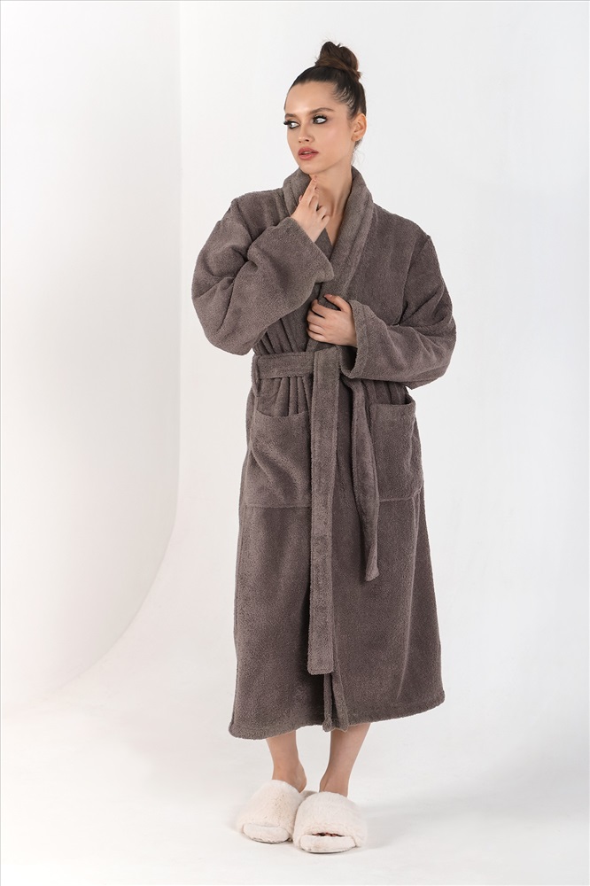 Ткань: Махра Махра - это хлопчатобумажная ткань, поверхность которой с одной стороны покрыта ворсом из петель нитей. Это очень мягкая ткань, легко впитывает влагу в больших количествах. Махра - натуральный материал, он гипоаллергенный и воздухопроницаемый. Ворс может быть с одной стороны или с двух (односторонняя или двусторонняя махра). Так оставаться в виде петель, либо стриженым. Стричь ворс могут сплошным полотном, или художественно выстригая узоры. Все это разновидности махровой ткани. Женский халат из двустороннего махрового хлопкового полотна. Модель на запах, с поясом в шлёвках, с боковыми карманами, с воротником "шаль", с петлей-вешалкой по горловине спинки.