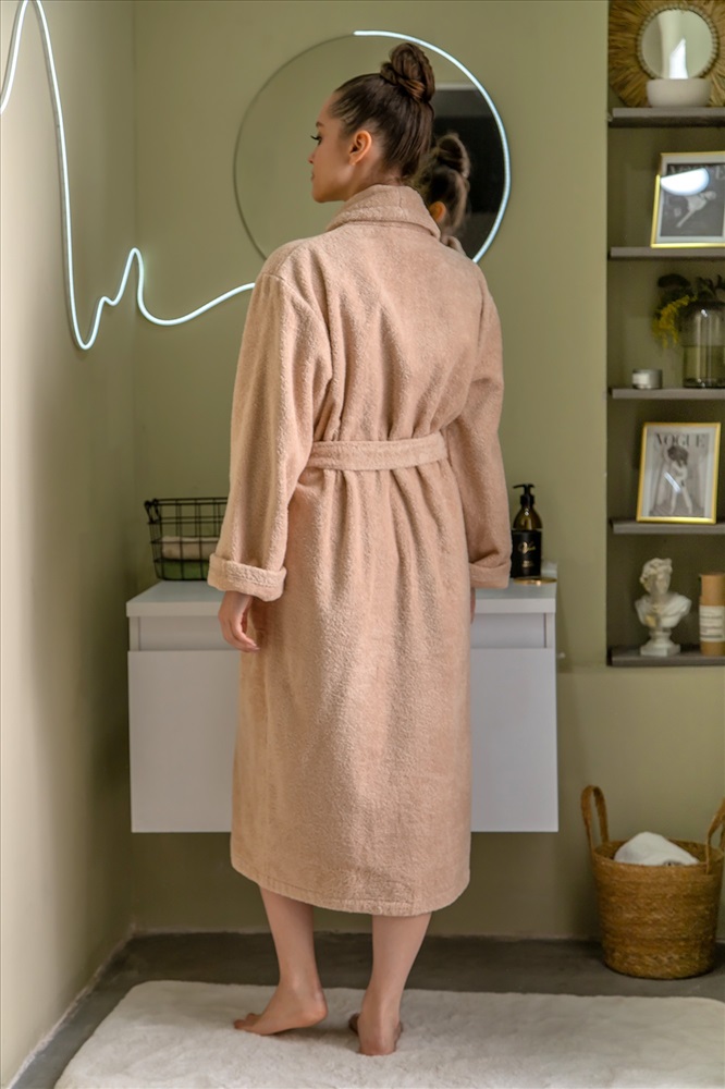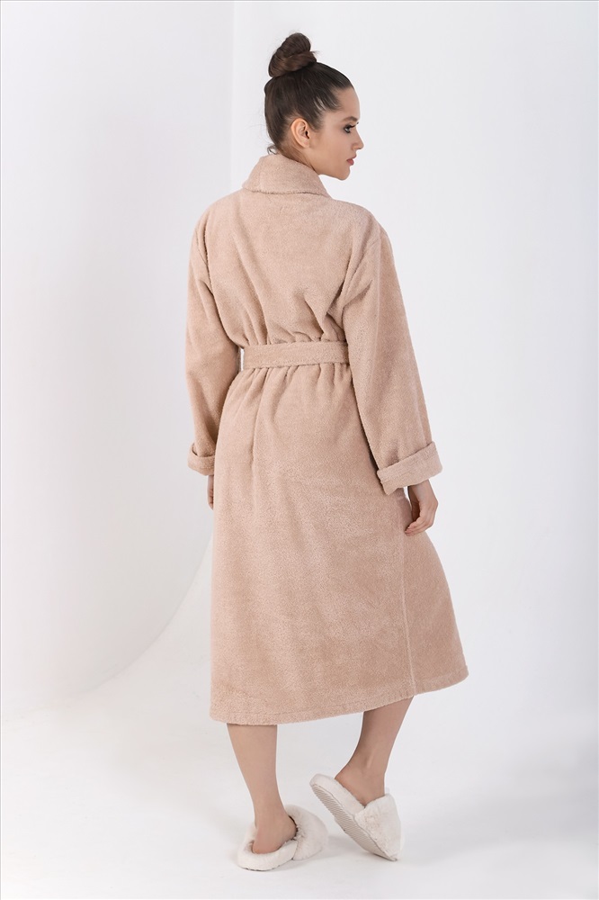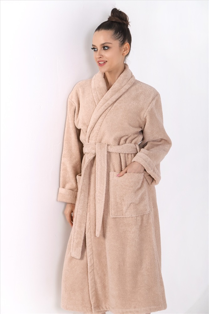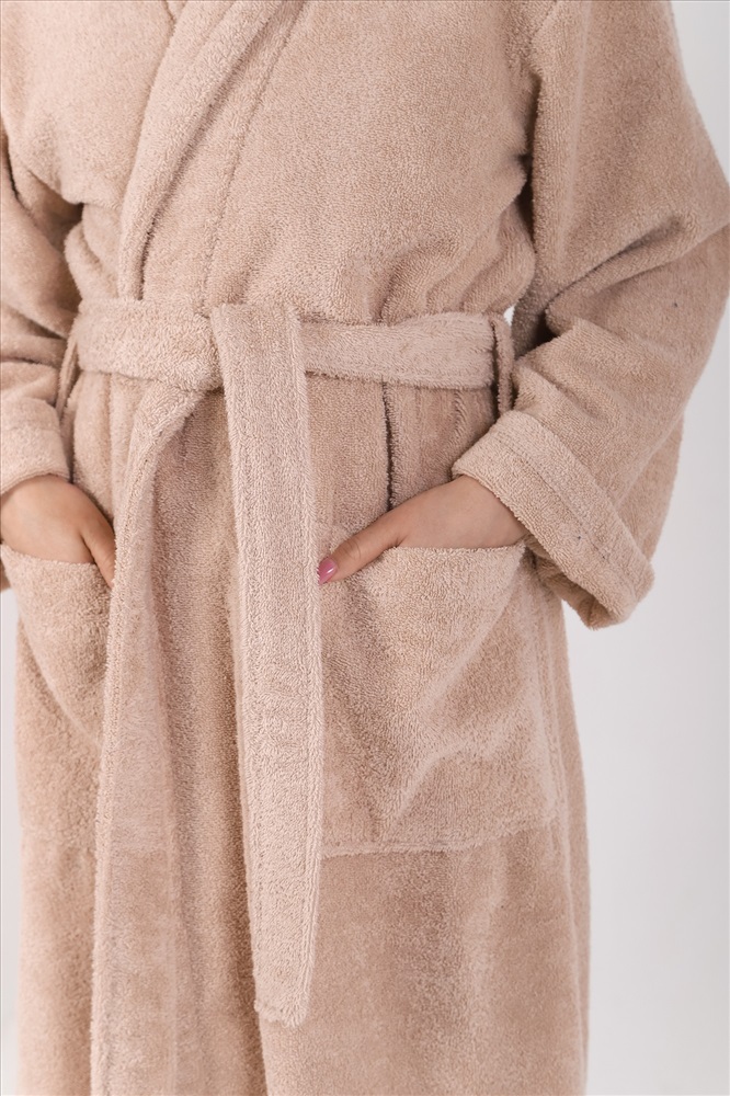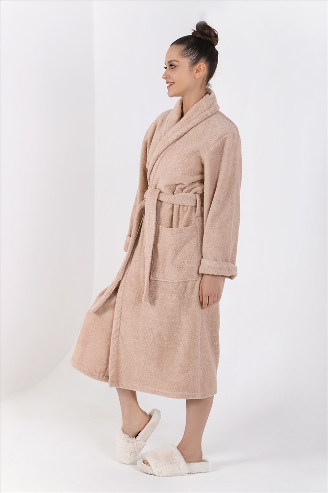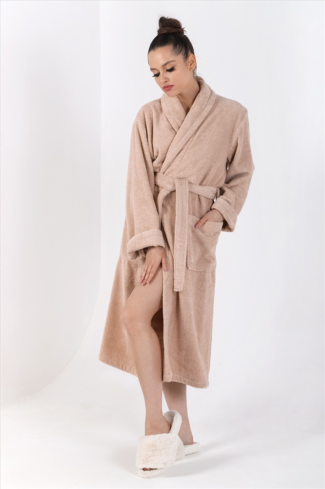 Женский халат из двустороннего махрового хлопкового полотна. Модель на запах, с поясом в шлёвках, с боковыми карманами, с воротником "шаль", с петлей-вешалкой по горловине спинки.