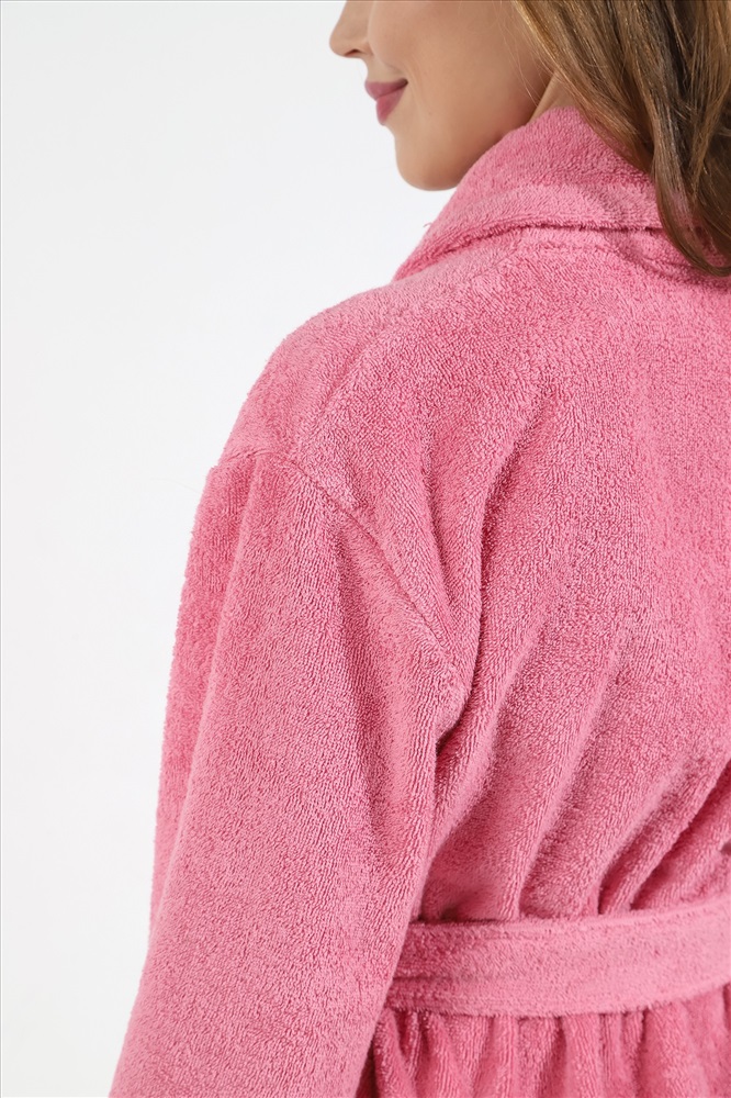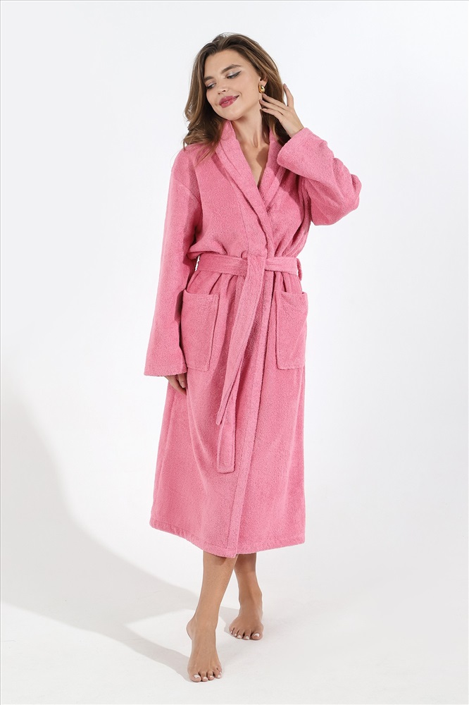 Женский халат из двустороннего махрового хлопкового полотна. Модель на запах, с поясом в шлёвках, с боковыми карманами, с воротником "шаль", с петлей-вешалкой по горловине спинки.
