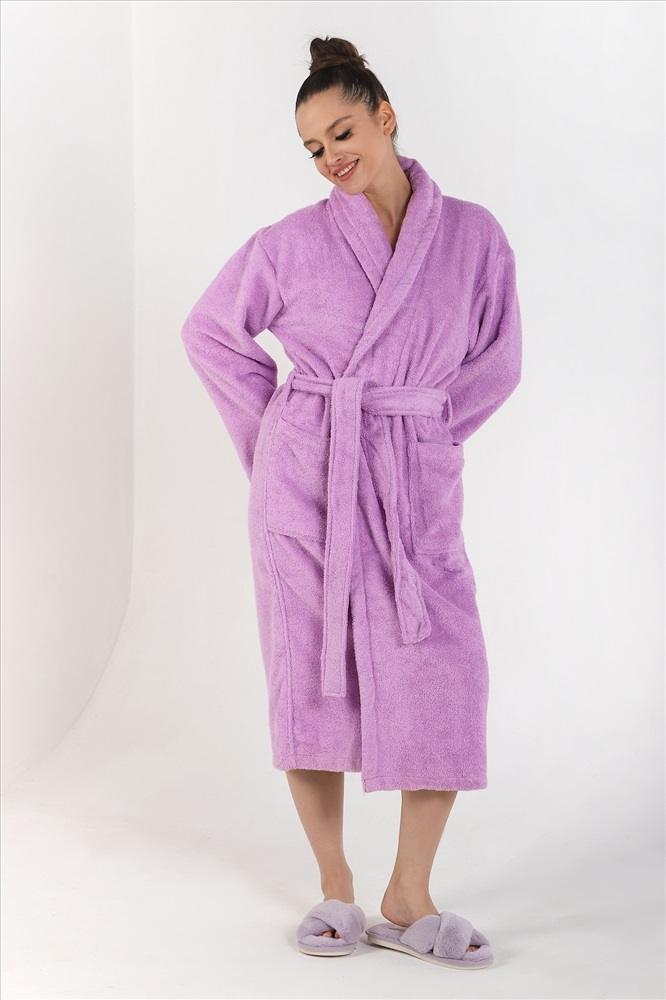 Женский халат из двустороннего махрового хлопкового полотна. Модель на запах, с поясом в шлёвках, с боковыми карманами, с воротником "шаль", с петлей-вешалкой по горловине спинки.