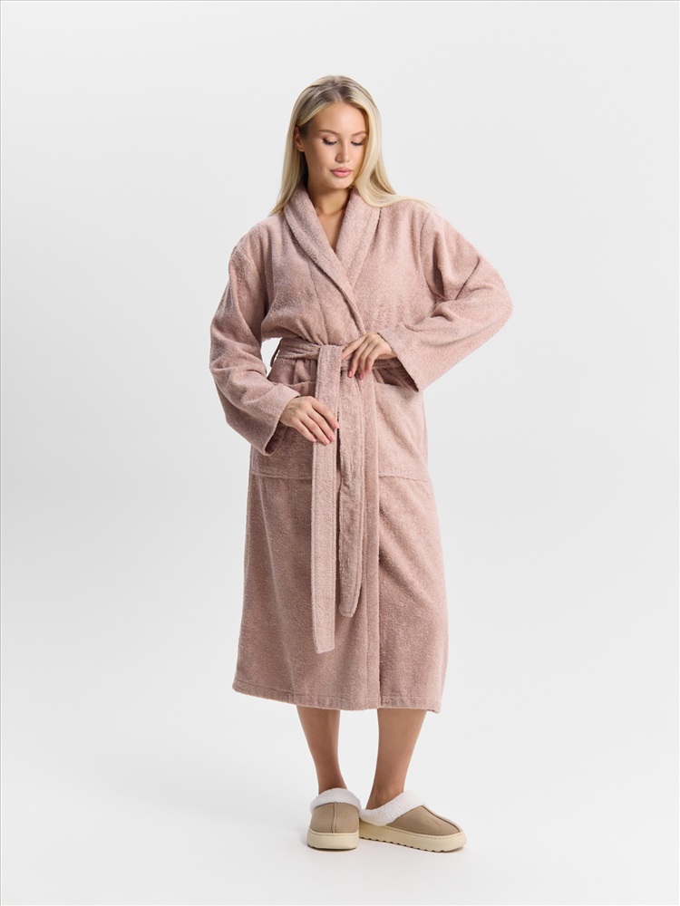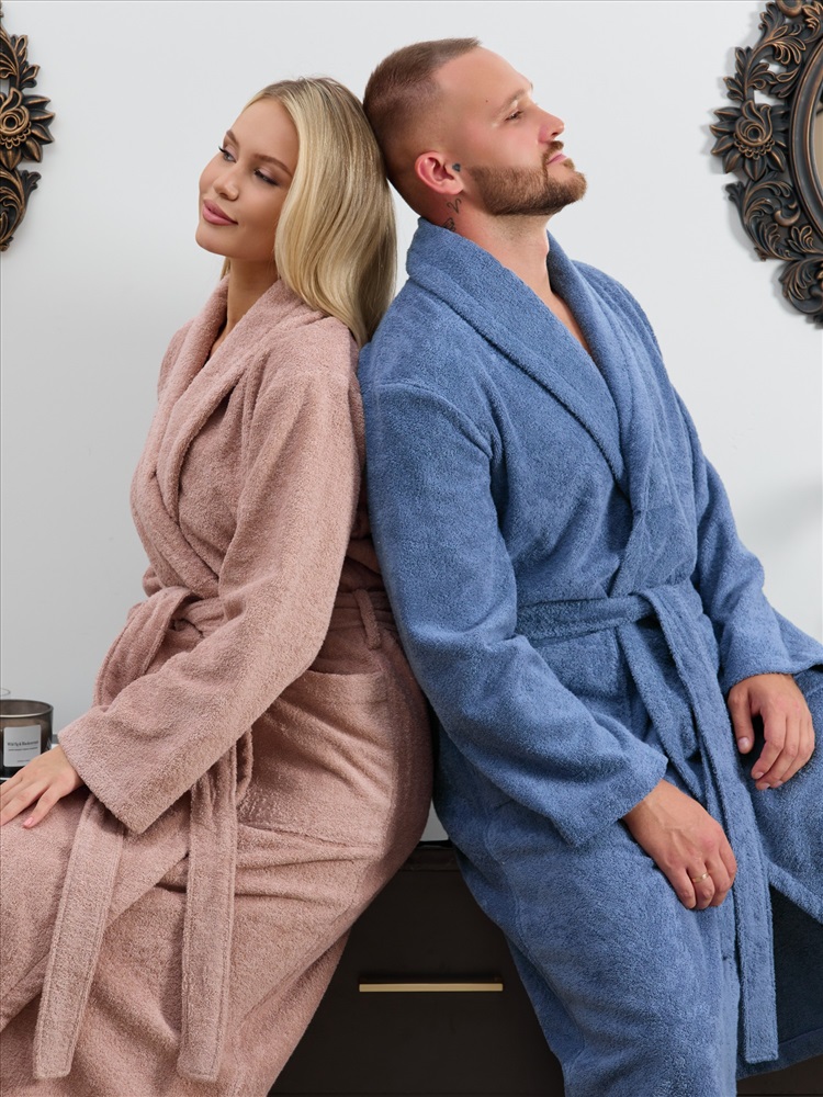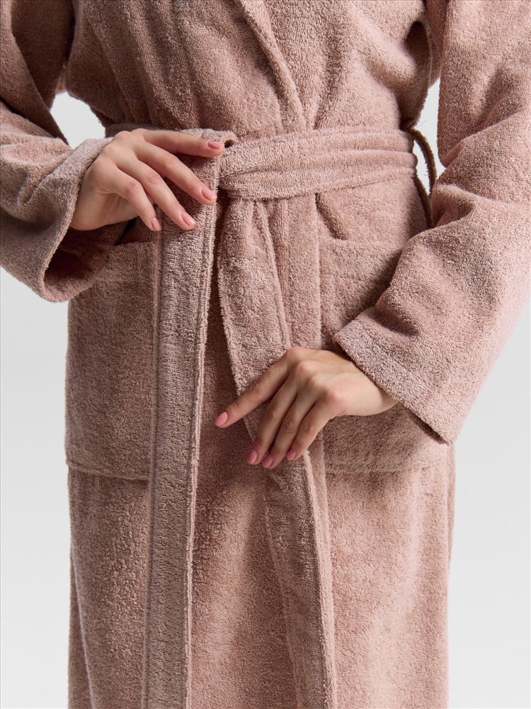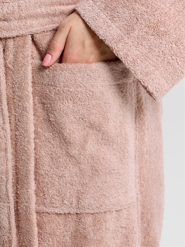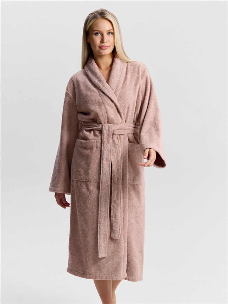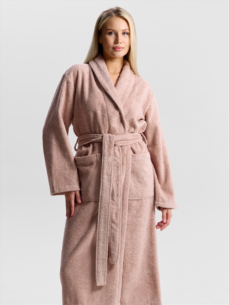 Женский халат из двустороннего махрового хлопкового полотна. Модель на запах, с поясом в шлёвках, с боковыми карманами, с воротником "шаль", с петлей-вешалкой по горловине спинки.