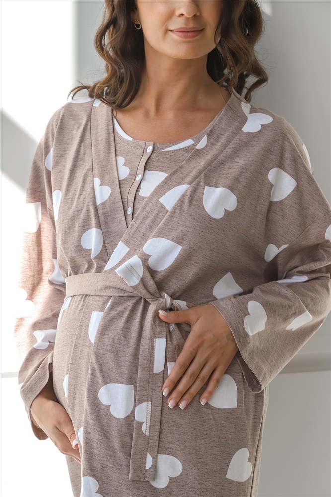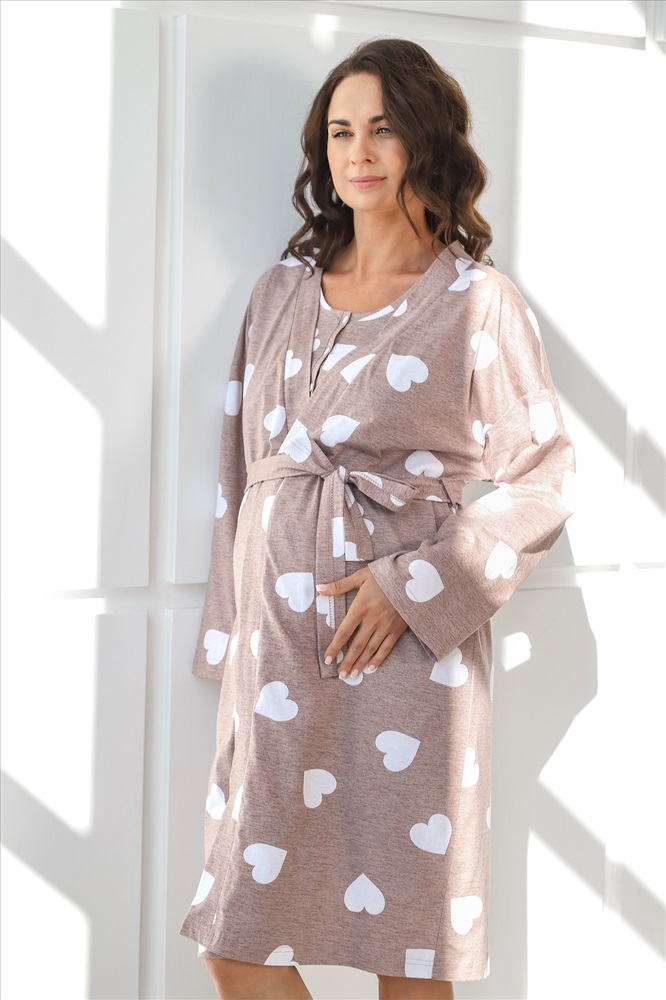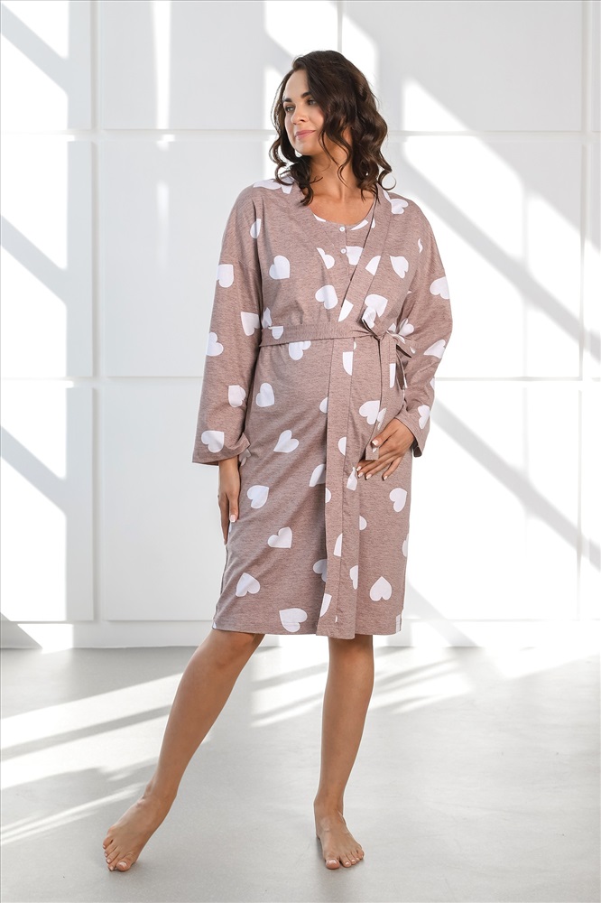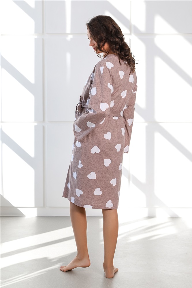 Халат из трикотажного полотна кулирного переплетения, на запах, с длинными рукавами. По линиям борта и горловине притачная планка. Съёмный пояс фиксируется на линии талии при помощи двух шлёвок в боковых швах.