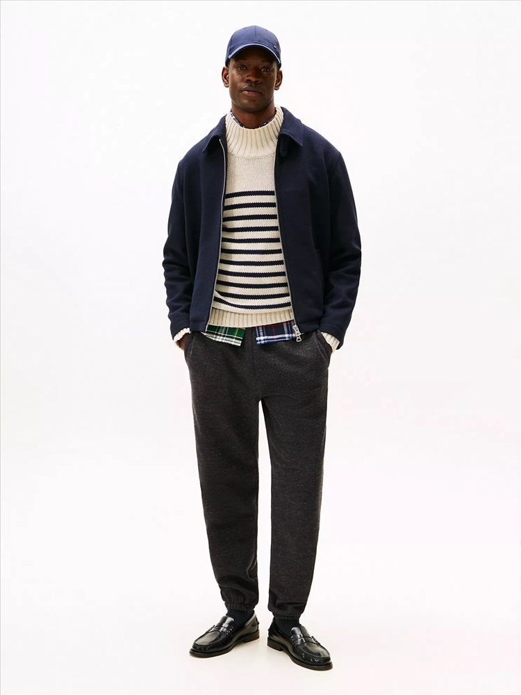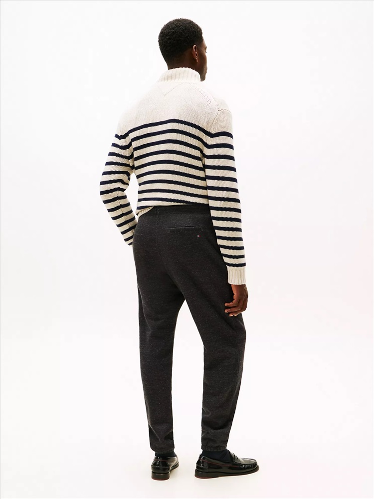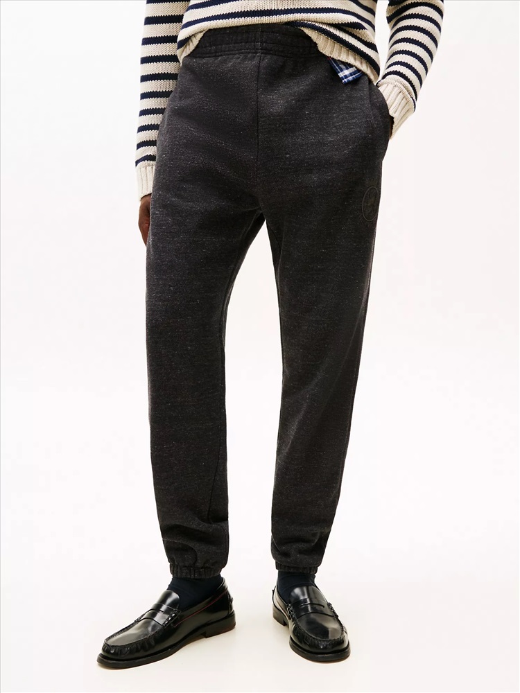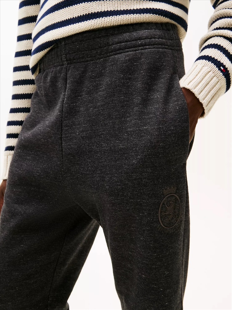 Tommy Hilfiger men's pant. We used mouliné yarn (created by twisting differently shaded strands together) to add dimension and color variation to our sweatpants for a heathered look. The flat-front waistband and tonal crest embroidery at the thigh elevate the look.
