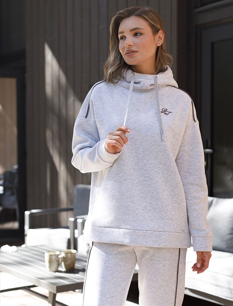 Уютное худи серого цвета с эффектом меланж с цельнокроенным капюшоном и спущенной линией плеча создано для комфорта в холодную погоду. Модель выполнена из премиального футера трехнитки с мягким начесом, что обеспечивает дополнительное тепло и приятные ощущения при носке. Глубокий капюшон дополнен шнуром для регулировки объема, что обеспечивает отличную защиту от ветра и холода, а серебристая фурнитура добавляет стильный акцент к современному худи. Элементы дизайна — минималистичная вышивка с логотипом бренда и тонкие онтрастные лампасы — делают худи более выразительным без перегруженности деталями, сохраняя эстетичность и современный вид. Эластичные манжеты на рукавах обеспечивают дополнительную защиту от продувания, способствуя сохранению тепла внутри. Натуральный хлопок гарантирует дышащий эффект, позволяя сохранять оптимальный микроклимат тела даже при длительном ношении. Благодаря эластану в составе повседневное худи подходит для активного отдыха, вы будете чувствовать себя свободно в любой ситуации. Представлены большие размеры, что позволяет выбрать подходящий вариант для разных типов фигуры, обеспечивая комфортную посадку. Подойдет девушкам плюс сайз, в этом теплом джемпере вы будете чувствовать себя уверенно. Универсальный дизайн гармонично сочетается с повседневной одеждой — джинсами или спортивными штанами, вы можете составить комплект с брюками D44.158 и D44.159. Создайте расслабленный образ без лишних усилий с помощью этого стильного худи! Сочетается в костюме с брюками D44.159