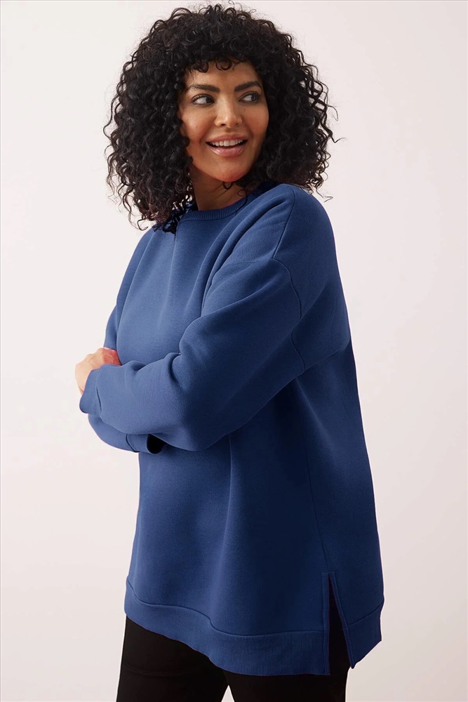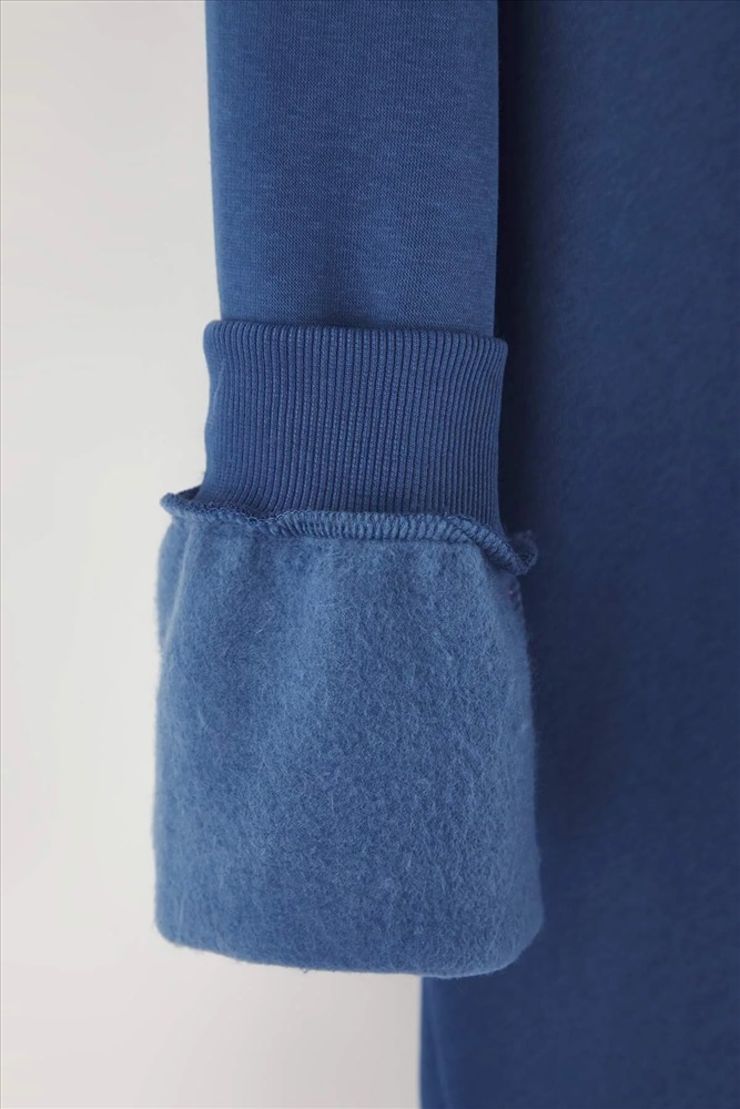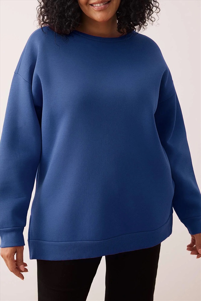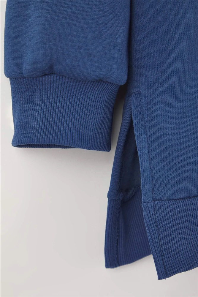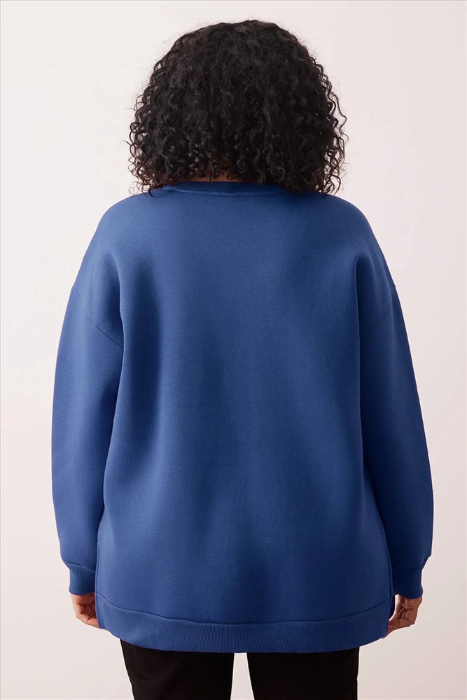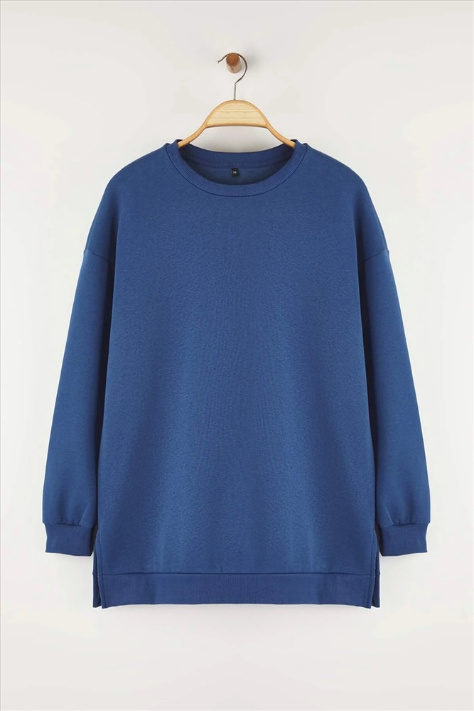 Indigo Kalın İçi Polarlı Yırtmaçlı Oversize/Bol Kesim Örme Büyük Beden Sweatshirt TBBAW24AO00003