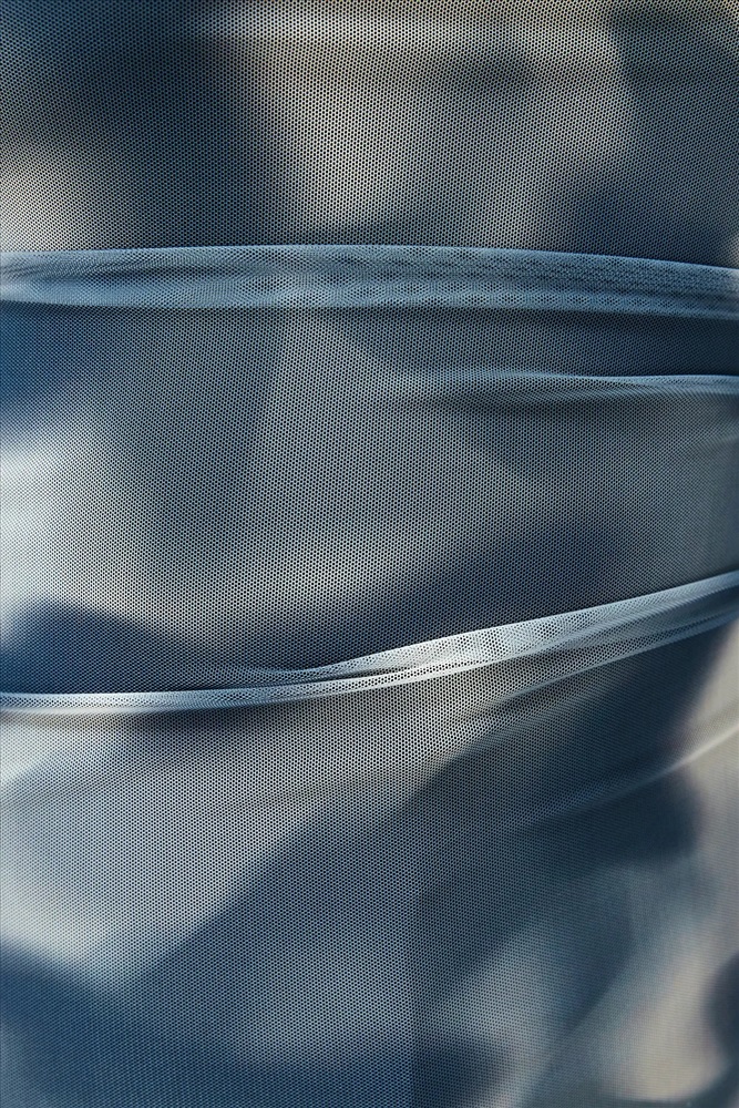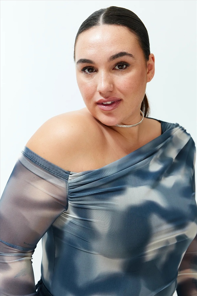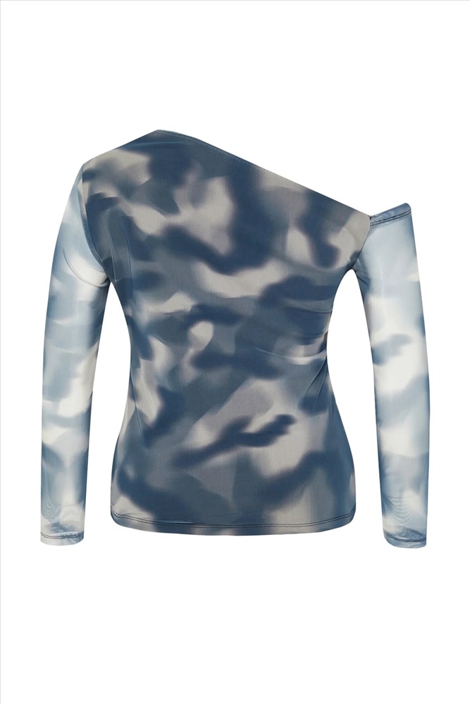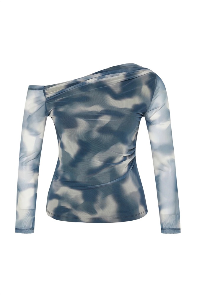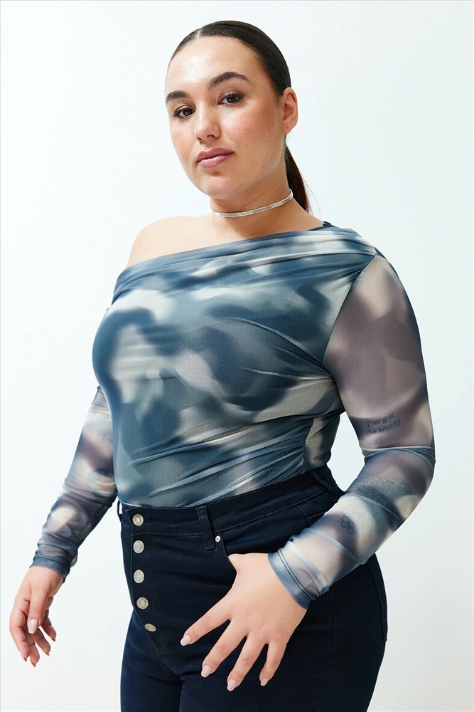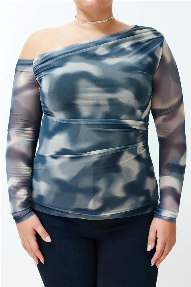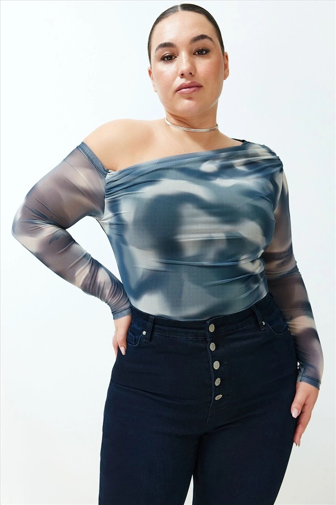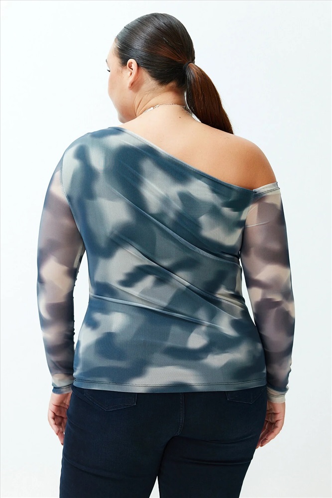Indigo Tül Astarlı Soyut Desenli Asimetrik Yaka Örme Büyük Beden Bluz TBBSS24AF00025