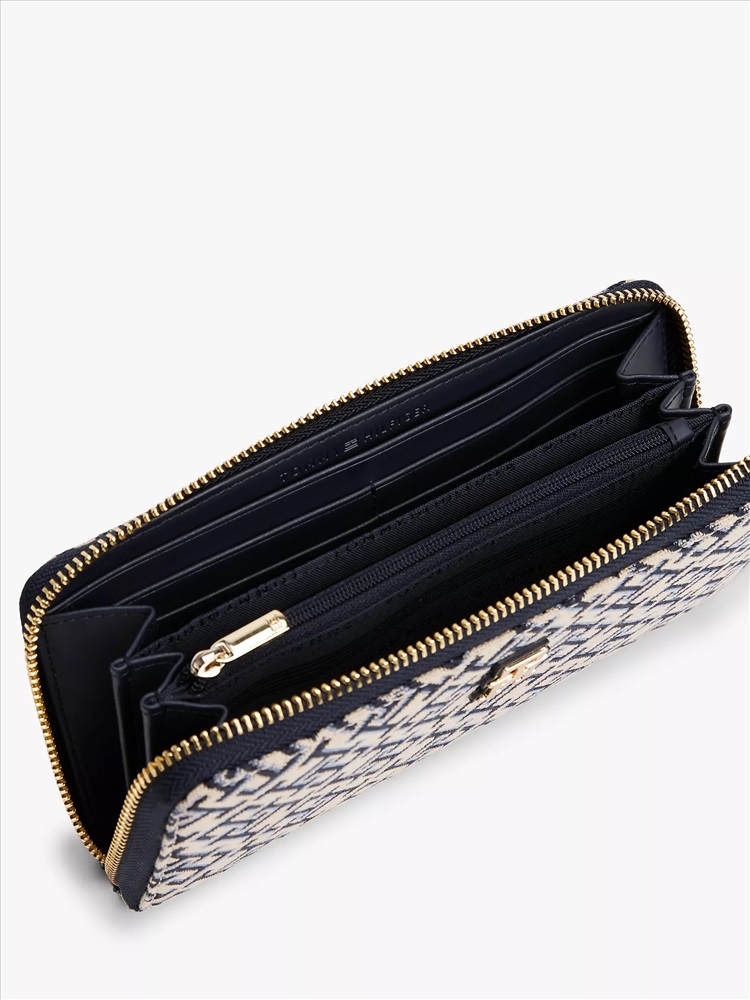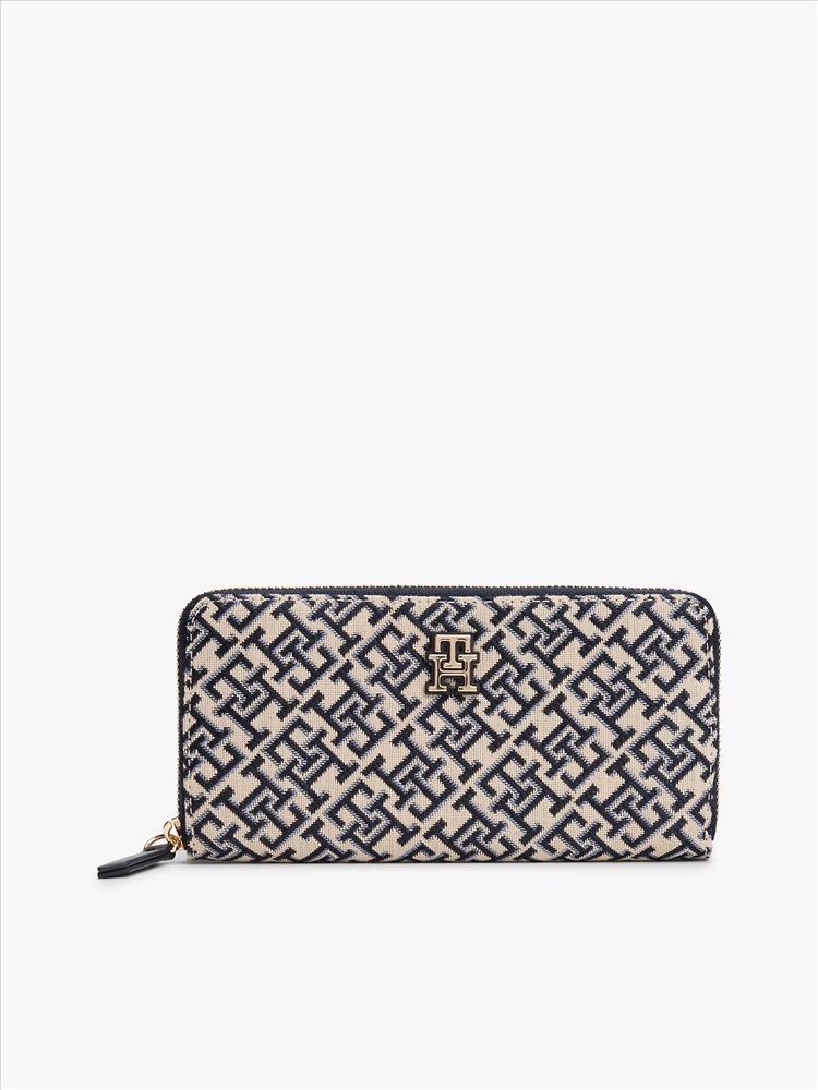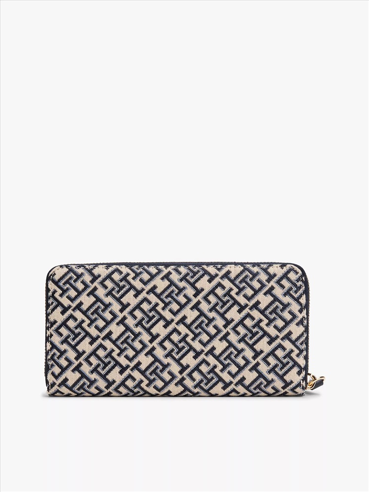 Tommy Hilfiger women's wallet. Our large zip-around wallet features an allover jacquard TH monogram logo pattern. The interior boasts multiple card slots, two main compartments and a zip coin pocket.