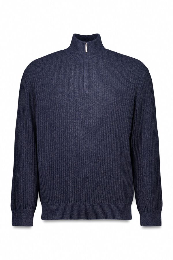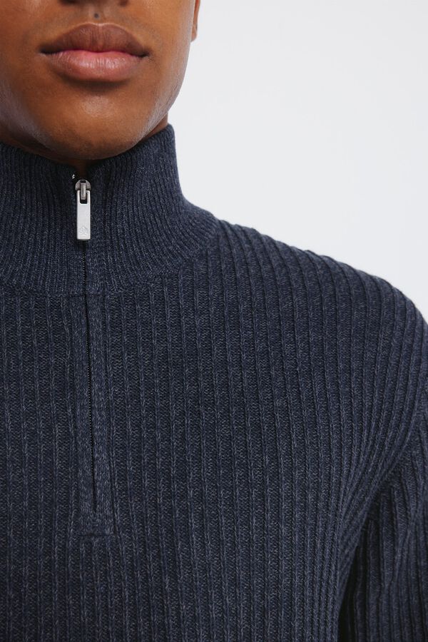 Jersey canalé en tejido mixto reciclado. Cuello alto cremallera.