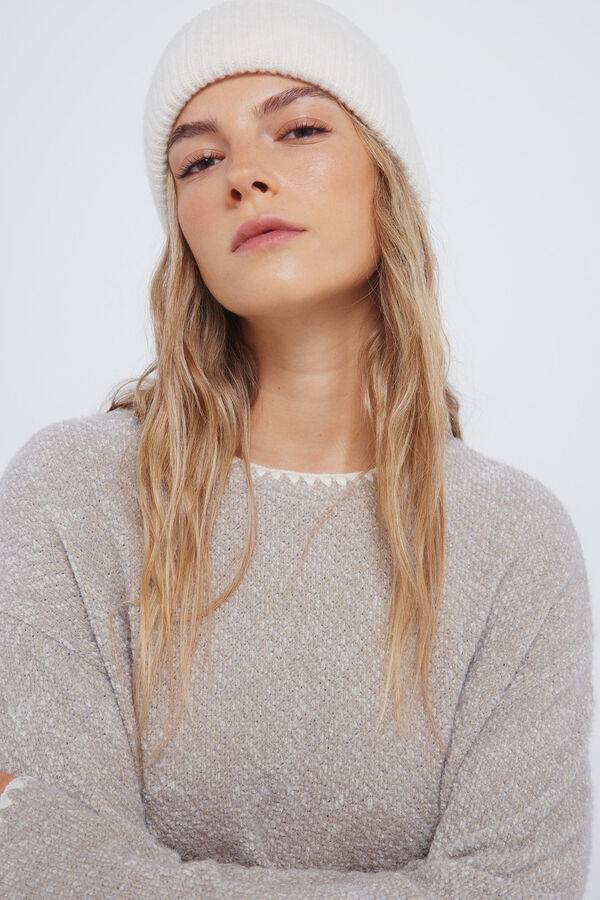 Jersey fino recto de manga larga caída, con cuello redondo, con detalle de pespuntes en el cuello y en los puños, de color liso con tacto suave.