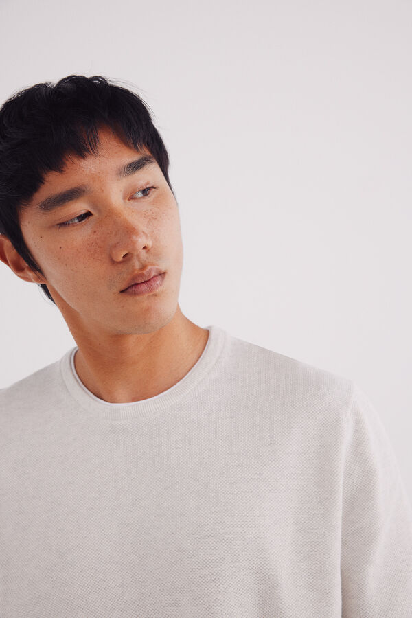 Jersey estructura fantasía 100% algodón. Cuello redondo con detalle de tejido a contraste. Cuello, puños y bajos con tejido enrollado.