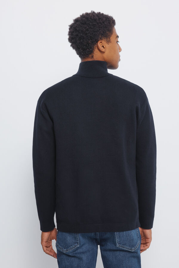 Jersey punto liso en tejido mixto. Texto en el pecho. Cuello camionero con cremallera. Puños en canalé y bajo en liso.