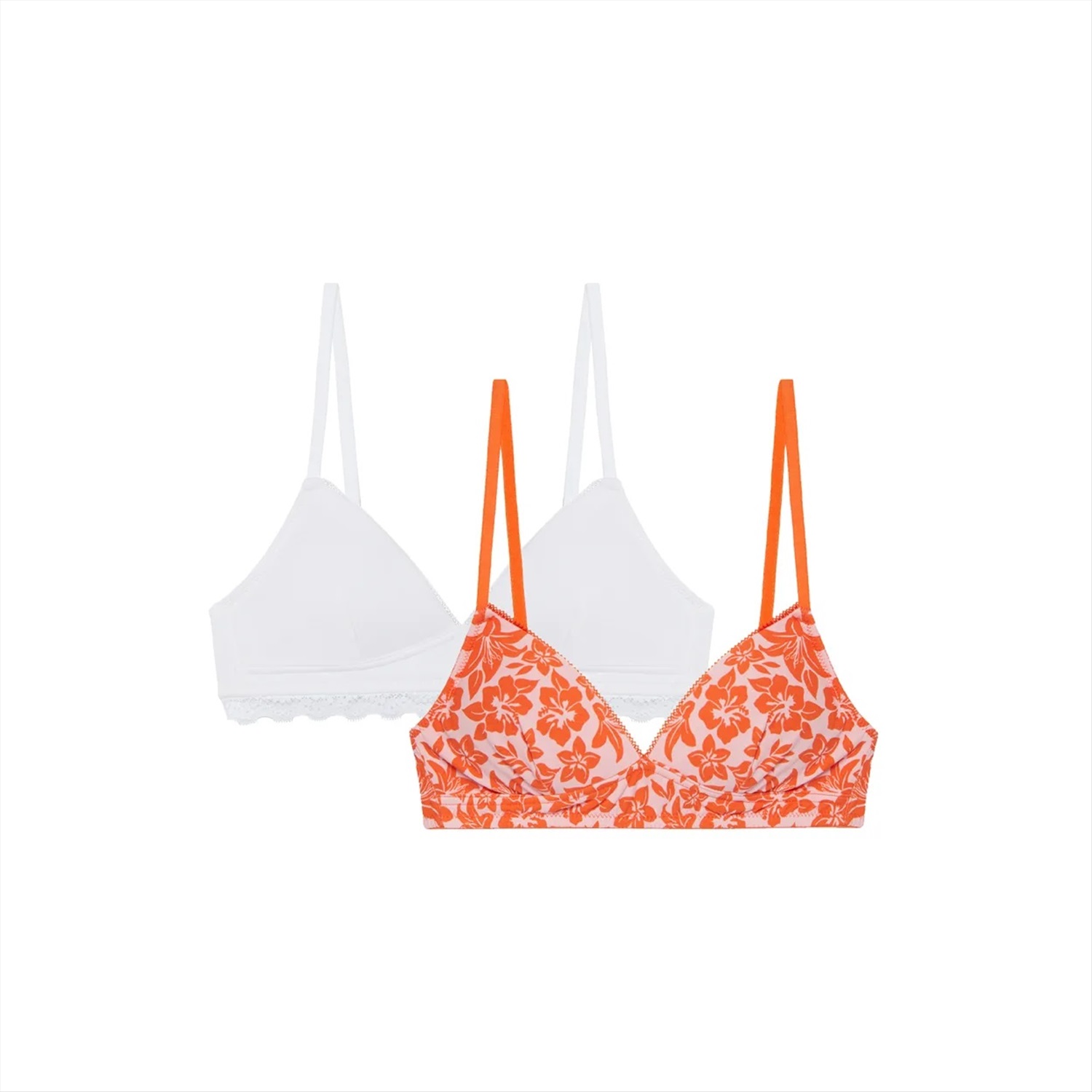 No te pierdas el juego COMFIZ. Estos sujetadores triangulares de algodón con relleno están disponibles en las tallas 70A a 90B. Diseñados especialmente para las adolescentes, por fin podrás ofrecerles la posibilidad de elegir entre una lencería cómoda y a la moda. Tienen \nestampados florales y dos colores a elegir. Y un pequeño extra: forma parte de nuestra gama We Care.