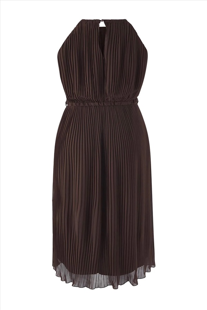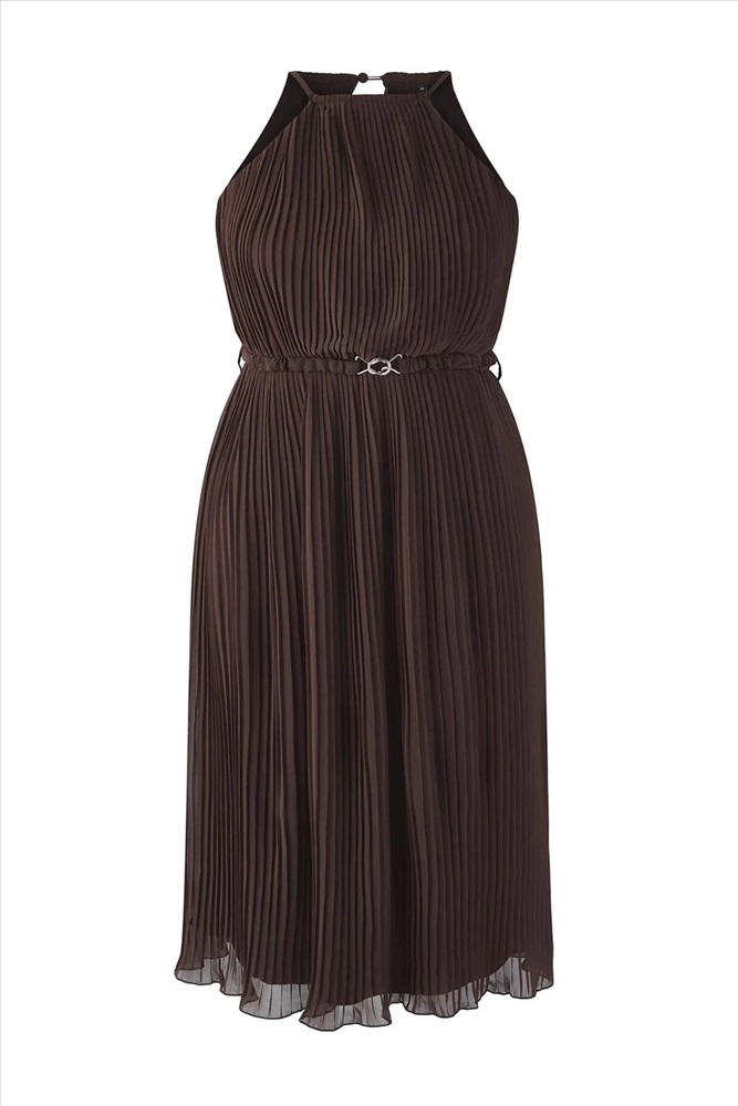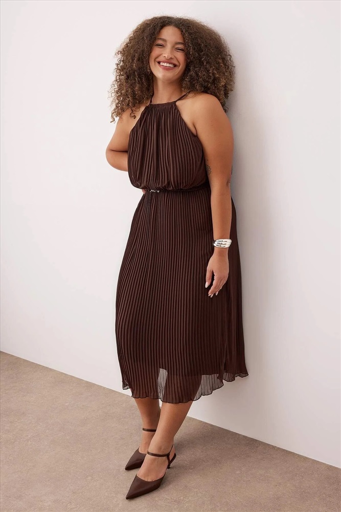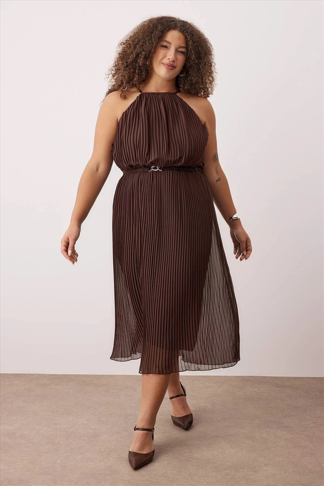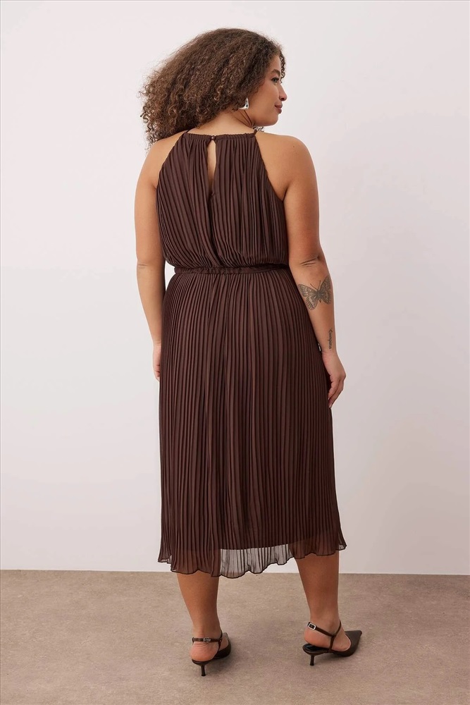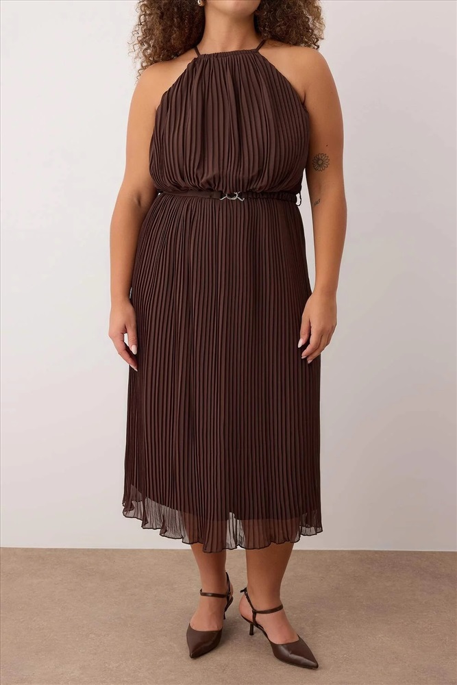 Kahverengi Bodycon Maxi Boy Şifon Dokuma Büyük Beden Elbise TBBSS25AH00252