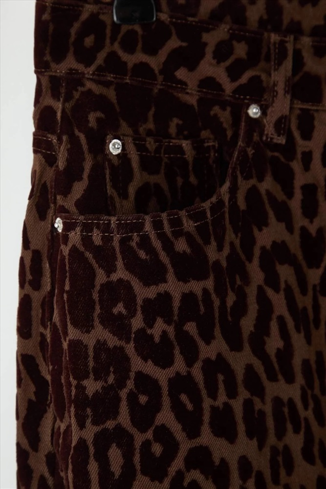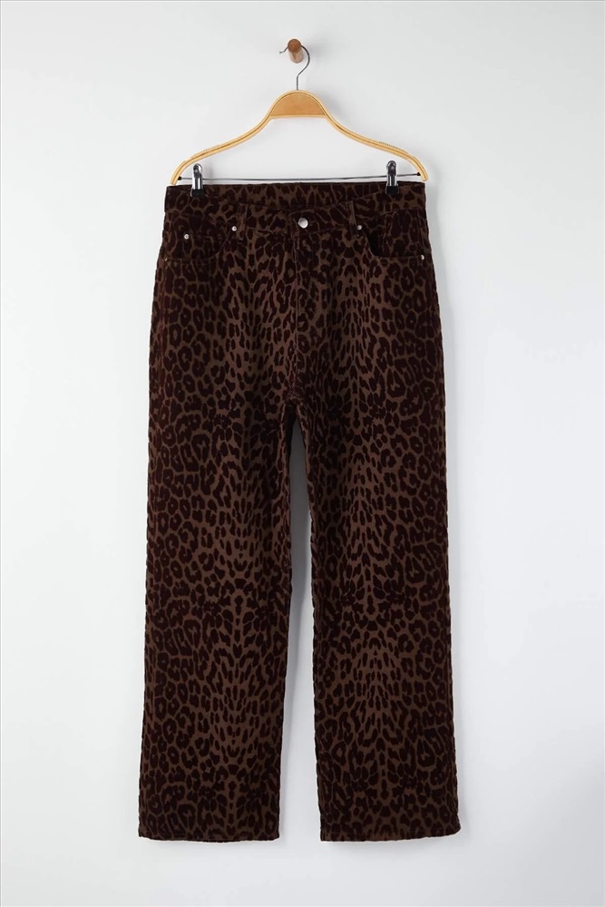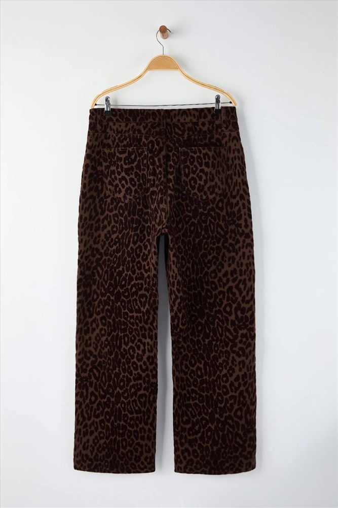Kahverengi Süet Görünümlü Leopar Desenli Yüksek Bel Büyük Beden Wide Leg Jeans TBBAW26CJ00045